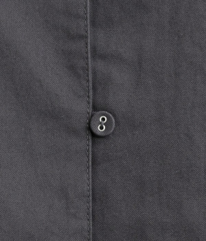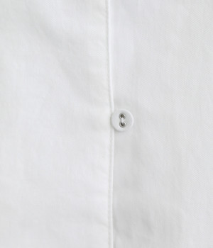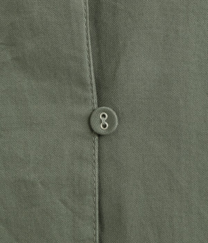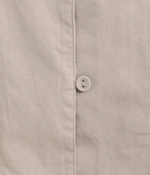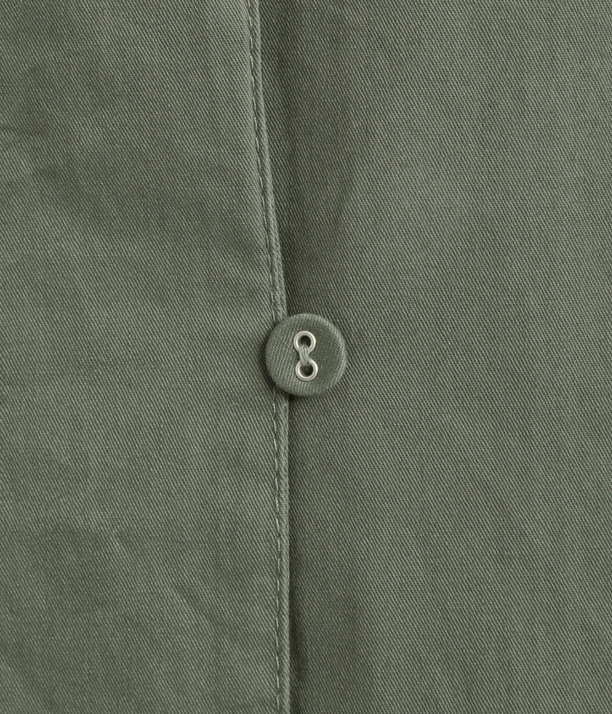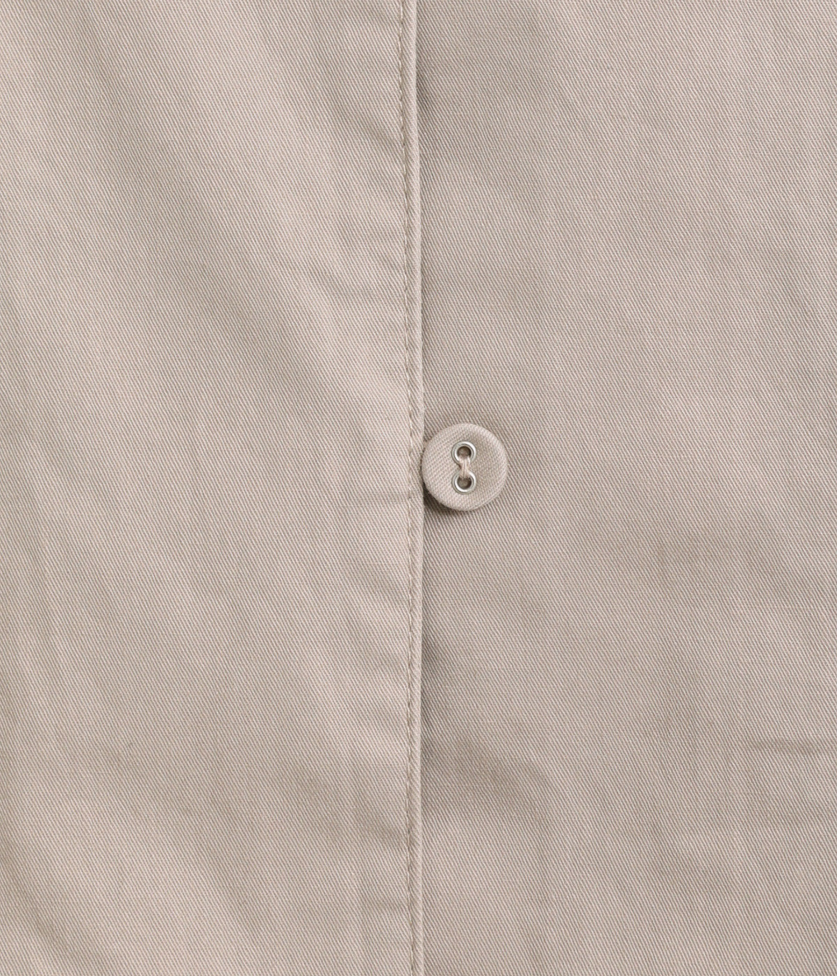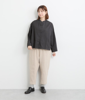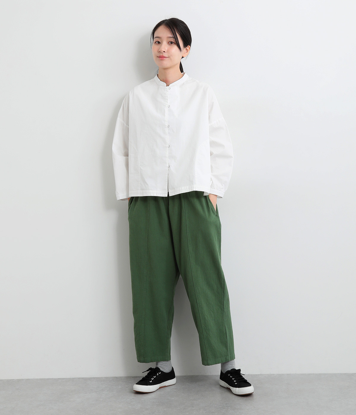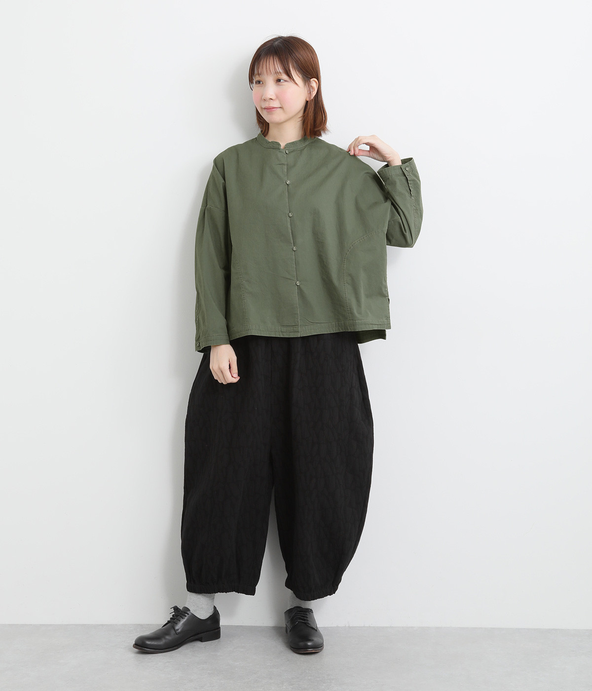 ゆとりのあるシンプルなボックスシルエットで、後ろはタックを入れてややフレアに仕上げています。バンドカラーで顔まわりはすっきりと品よく。首、袖、裾まわりのステッチがさり気ないアクセントに。