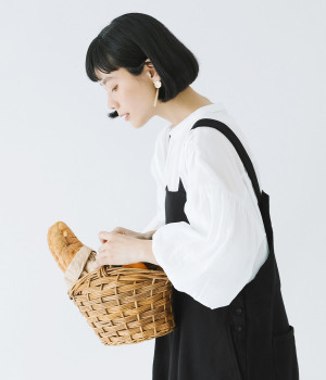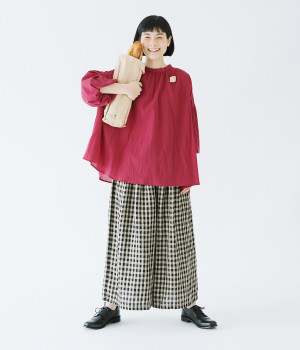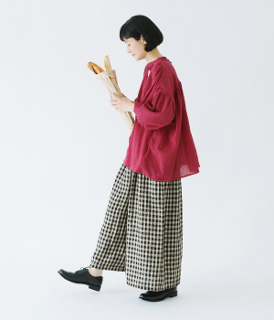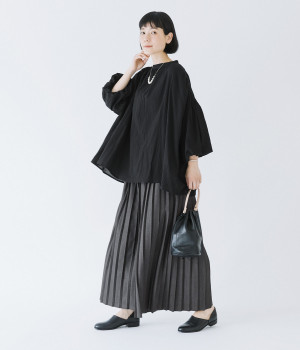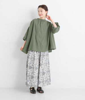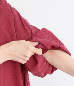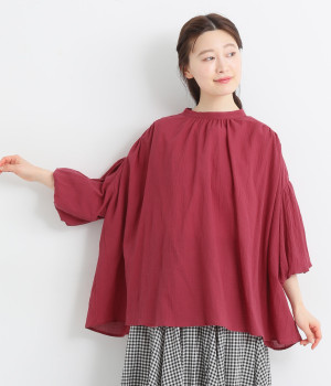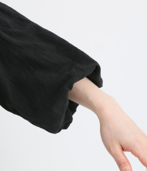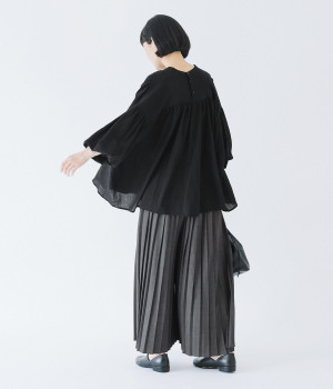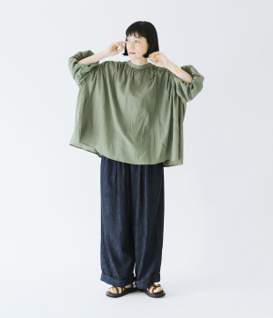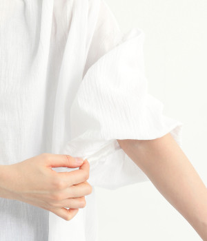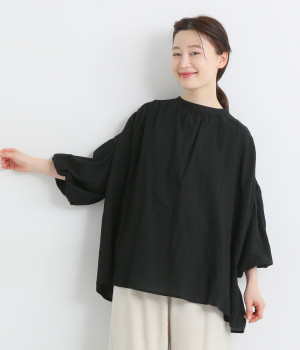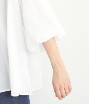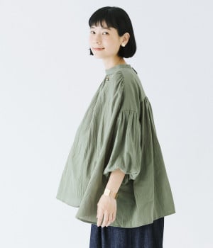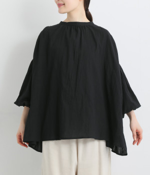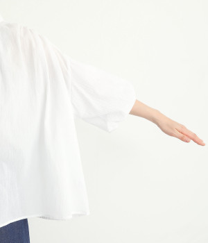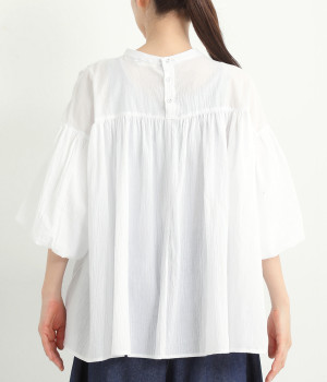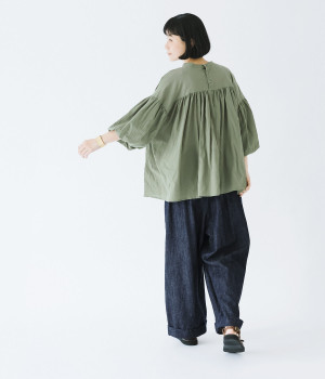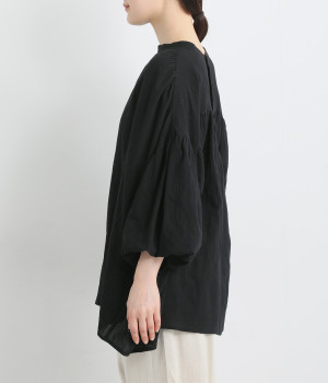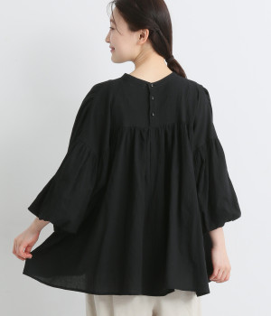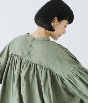 袖口がゴム仕様になったバルーンスリーブのふっくらとしたフォルムが特徴的。バックネックのボタンや切り替えのギャザーなど、こだわりのディテールをたっぷり取り入れました。なめらかなドロップショルダーや身幅の広いワイドシルエットで着こなしをリラクシーに。