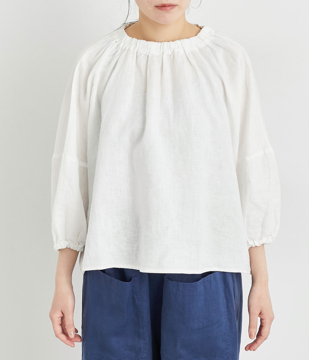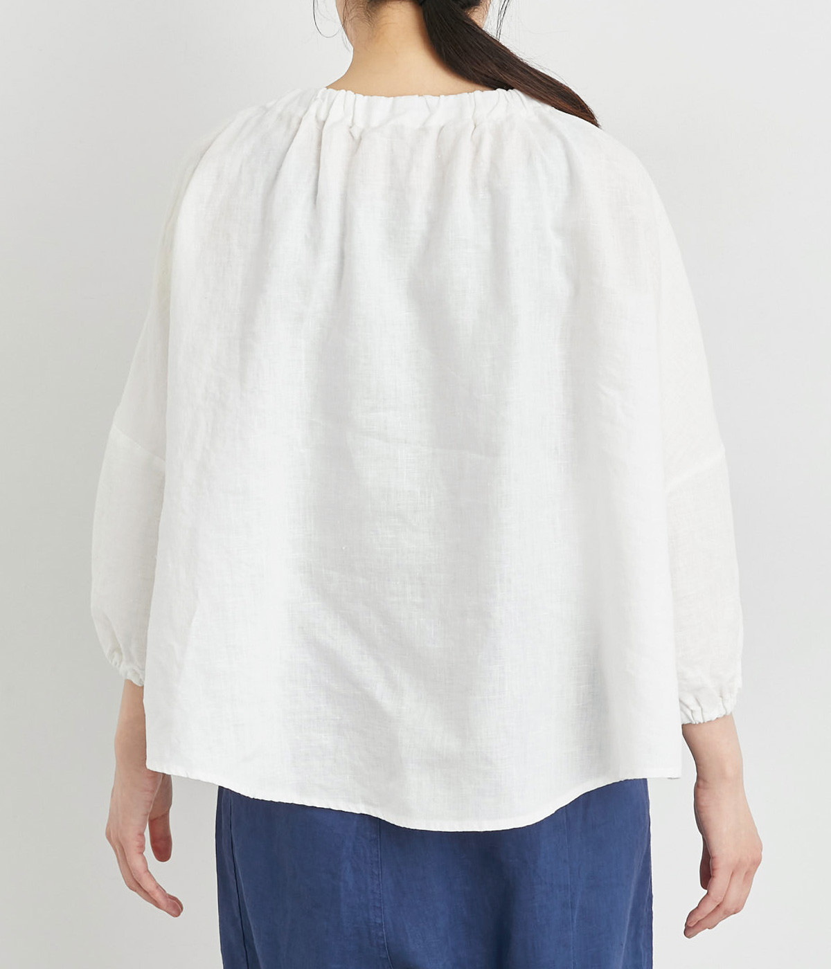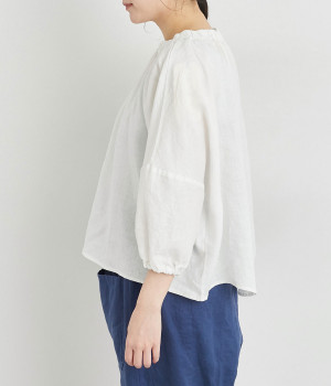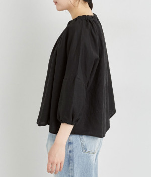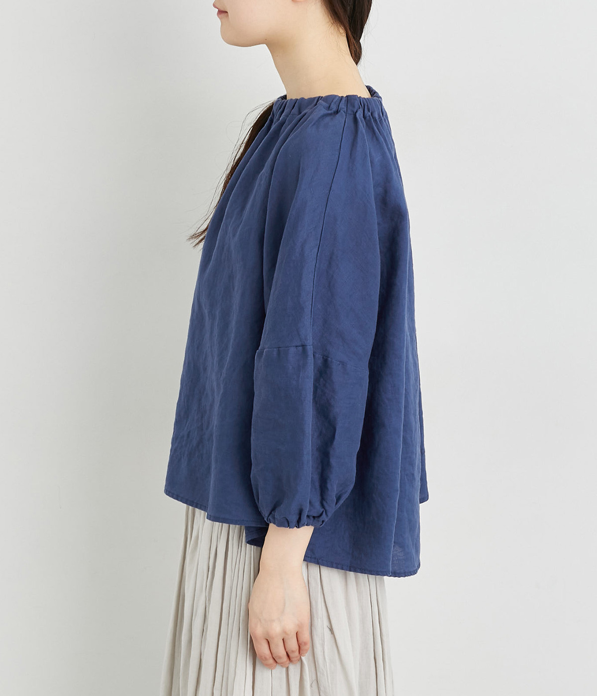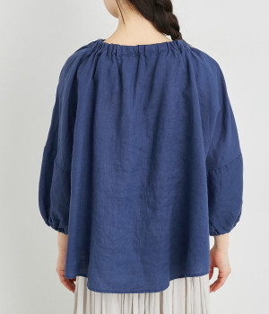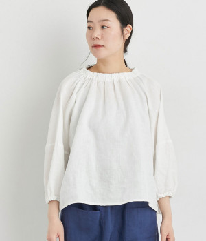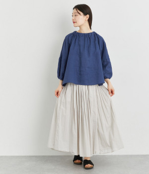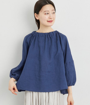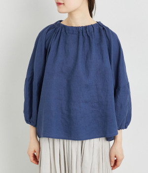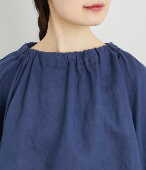 襟ぐりにゴムを入れて着脱しやすくデザイン性も加味したプルオーバーブラウスです。ドロップショルダーでリラックスシルエットに仕上げ、ゴムギャザーで立体感を持たせた袖口はたくし上げのアレンジも◎。