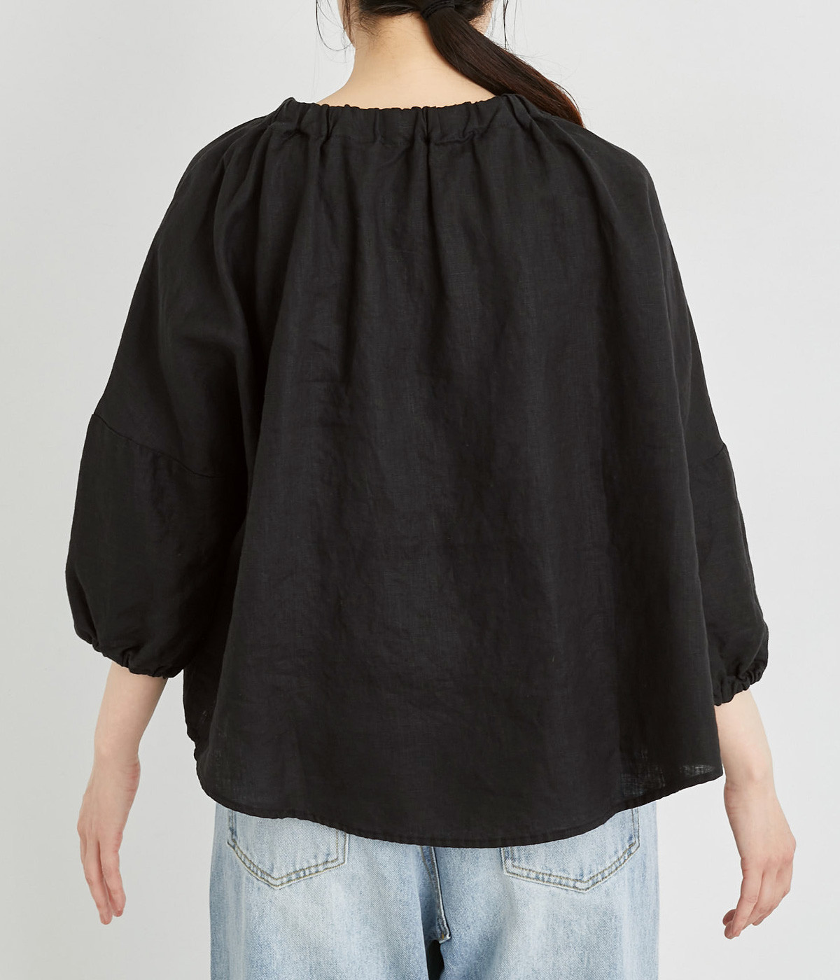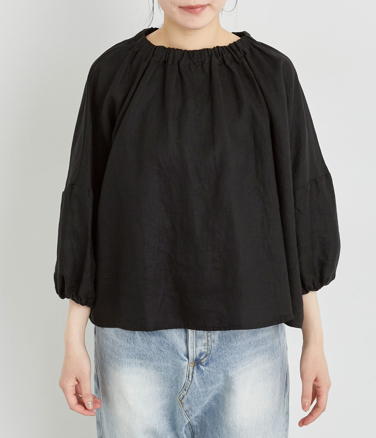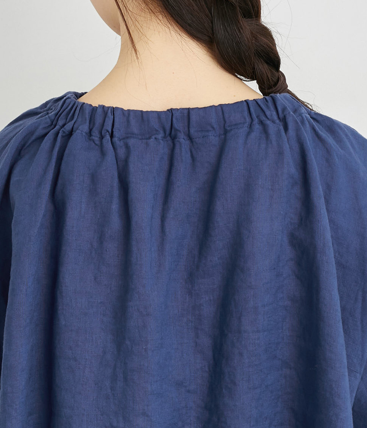 襟ぐりにゴムを入れて着脱しやすくデザイン性も加味したプルオーバーブラウスです。ドロップショルダーでリラックスシルエットに仕上げ、ゴムギャザーで立体感を持たせた袖口はたくし上げのアレンジも◎。