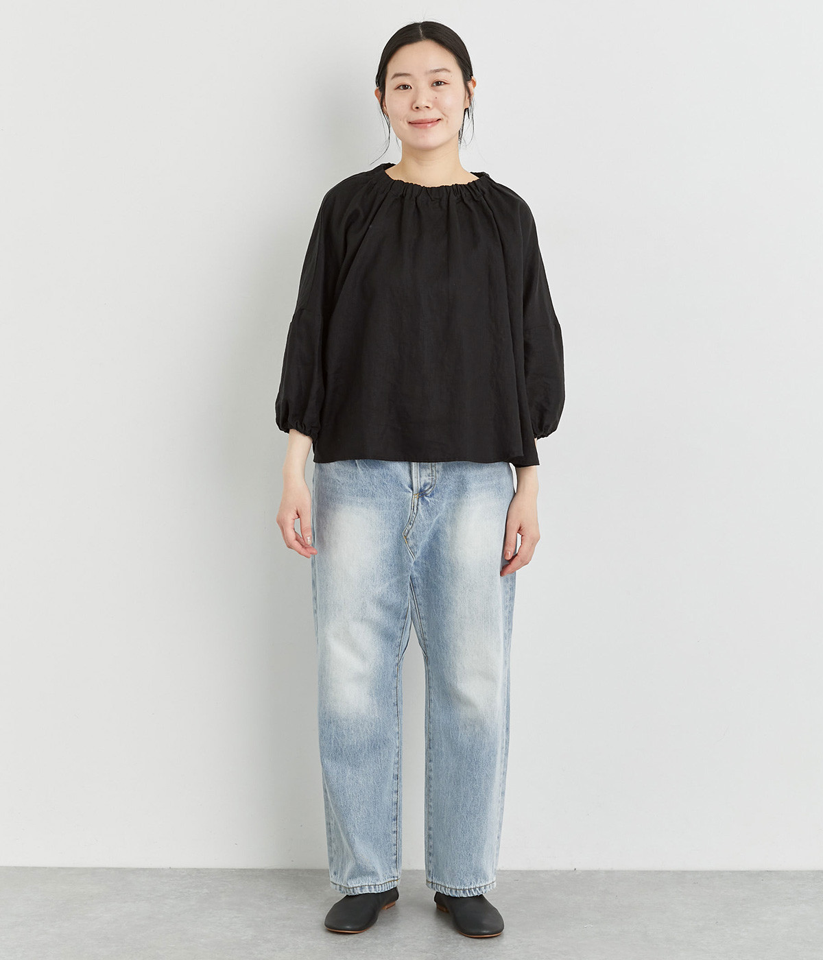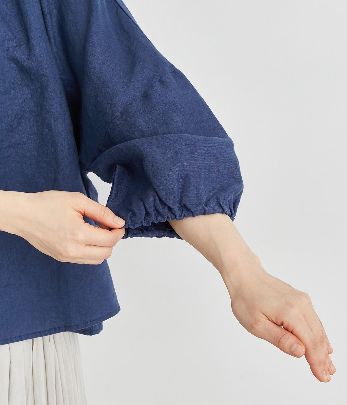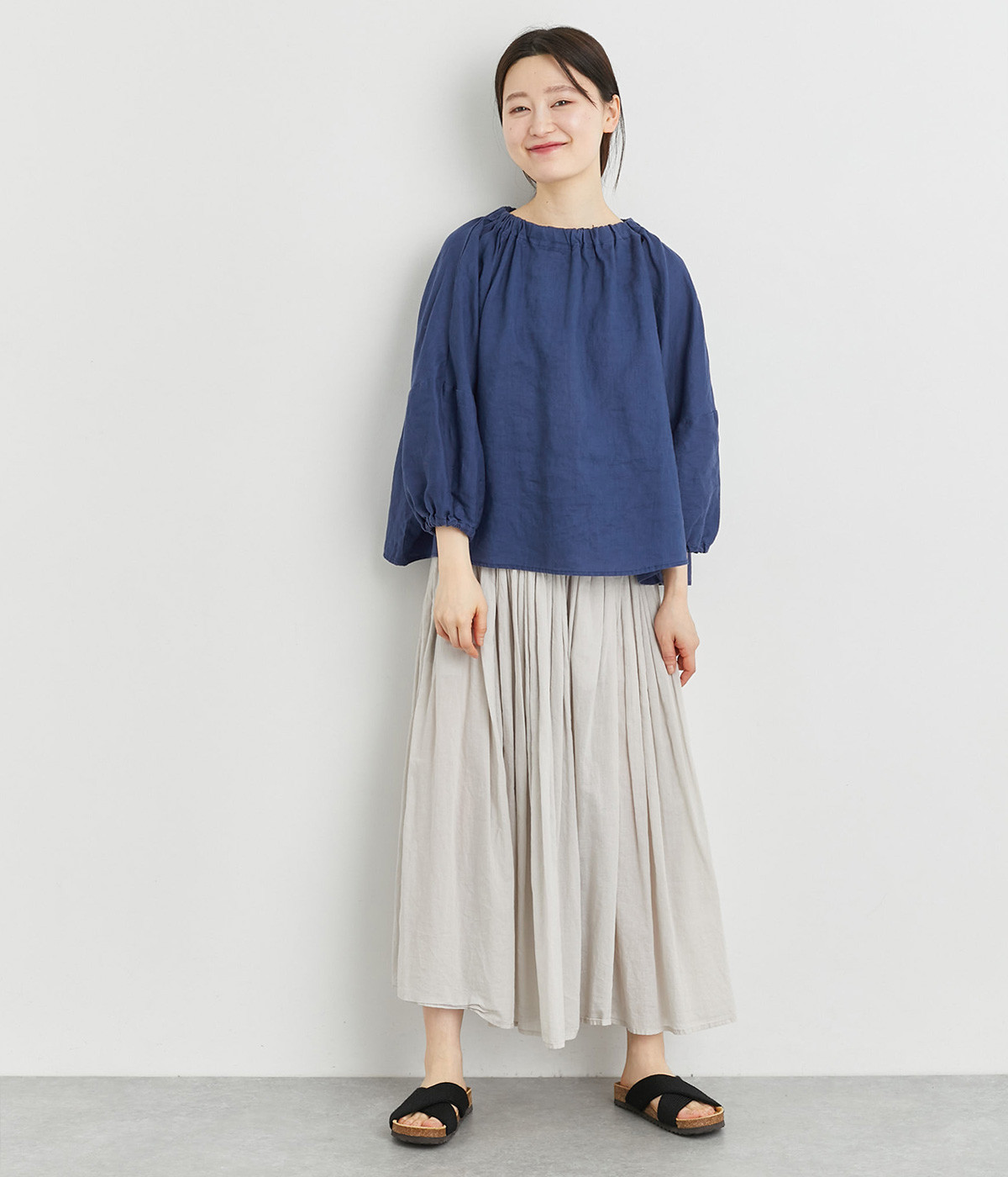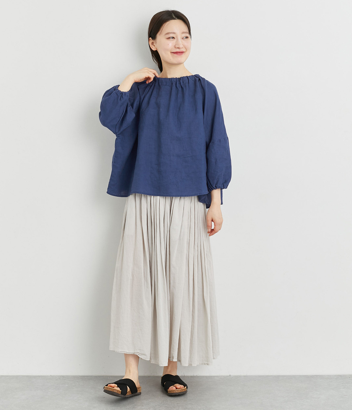 襟ぐりにゴムを入れて着脱しやすくデザイン性も加味したプルオーバーブラウスです。ドロップショルダーでリラックスシルエットに仕上げ、ゴムギャザーで立体感を持たせた袖口はたくし上げのアレンジも◎。