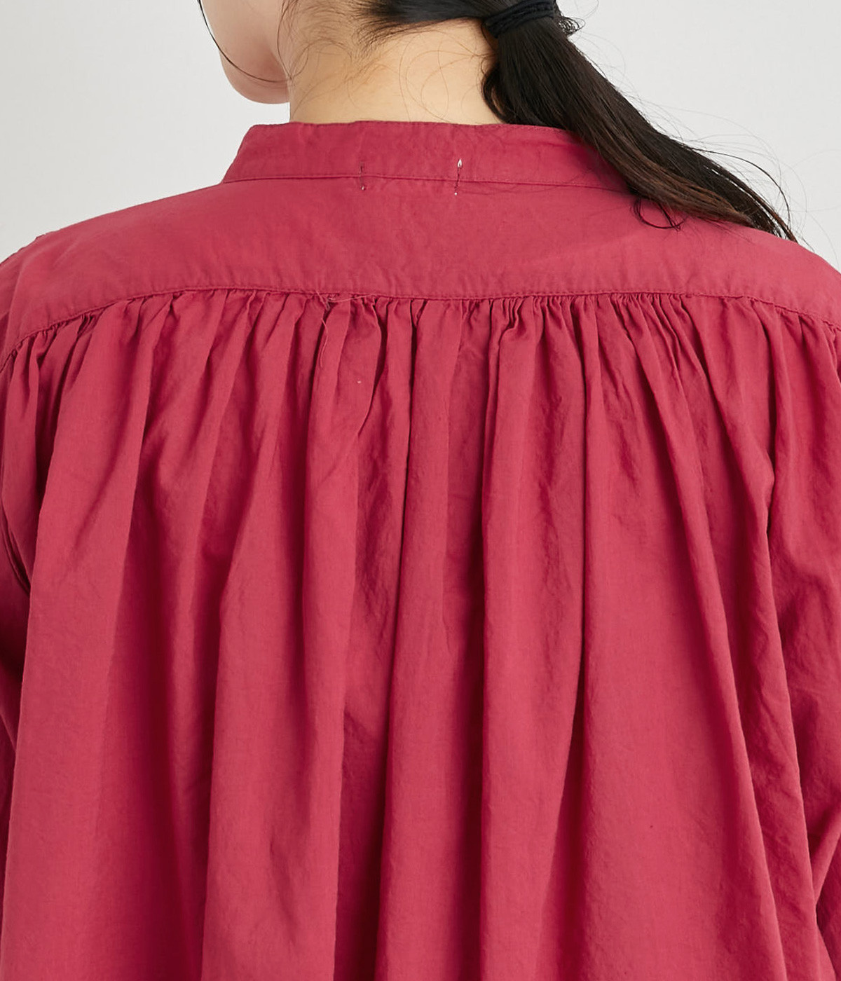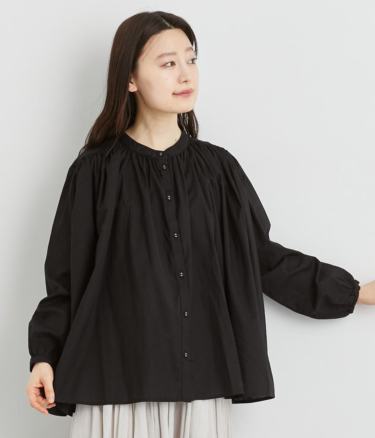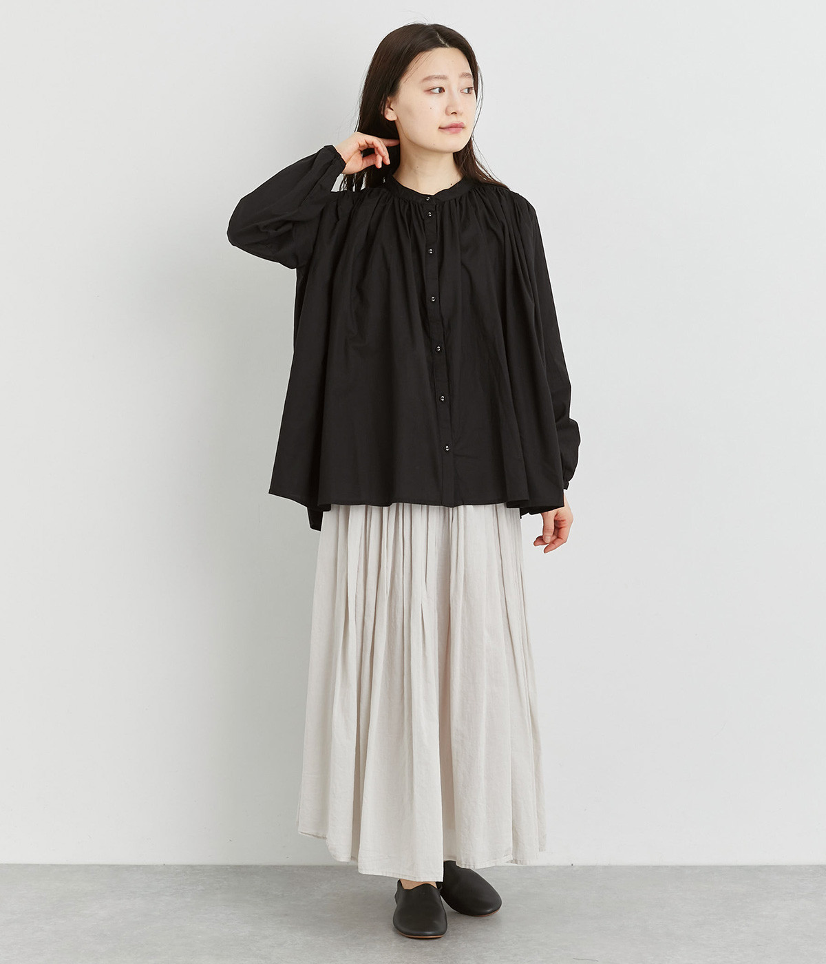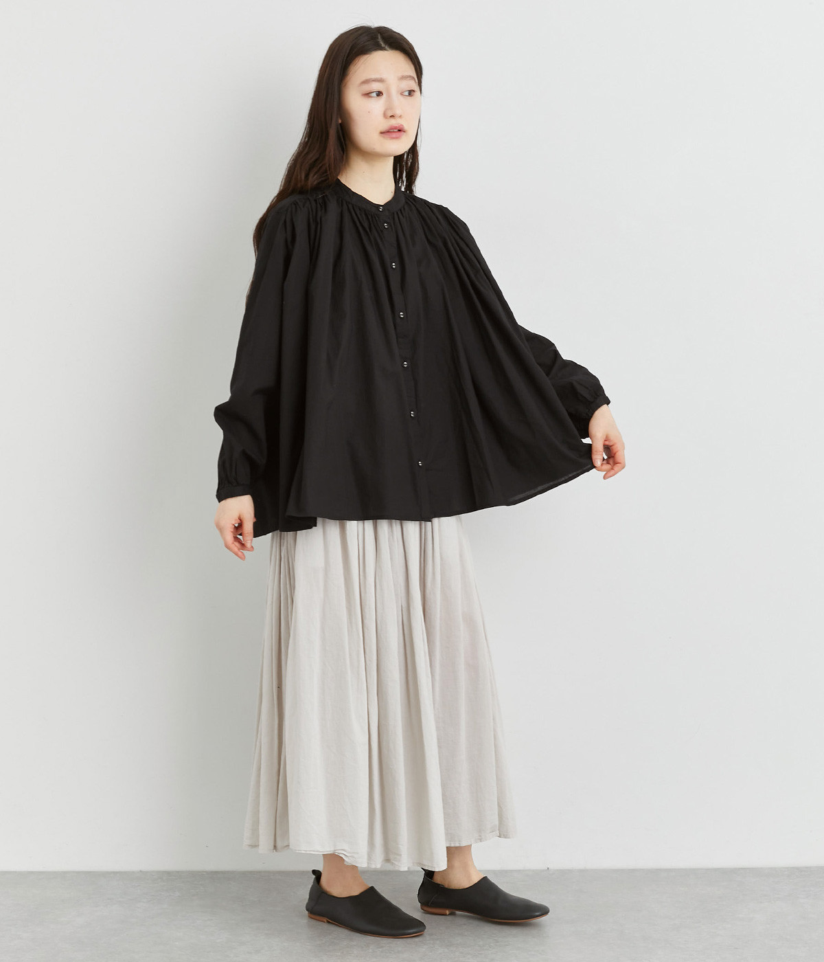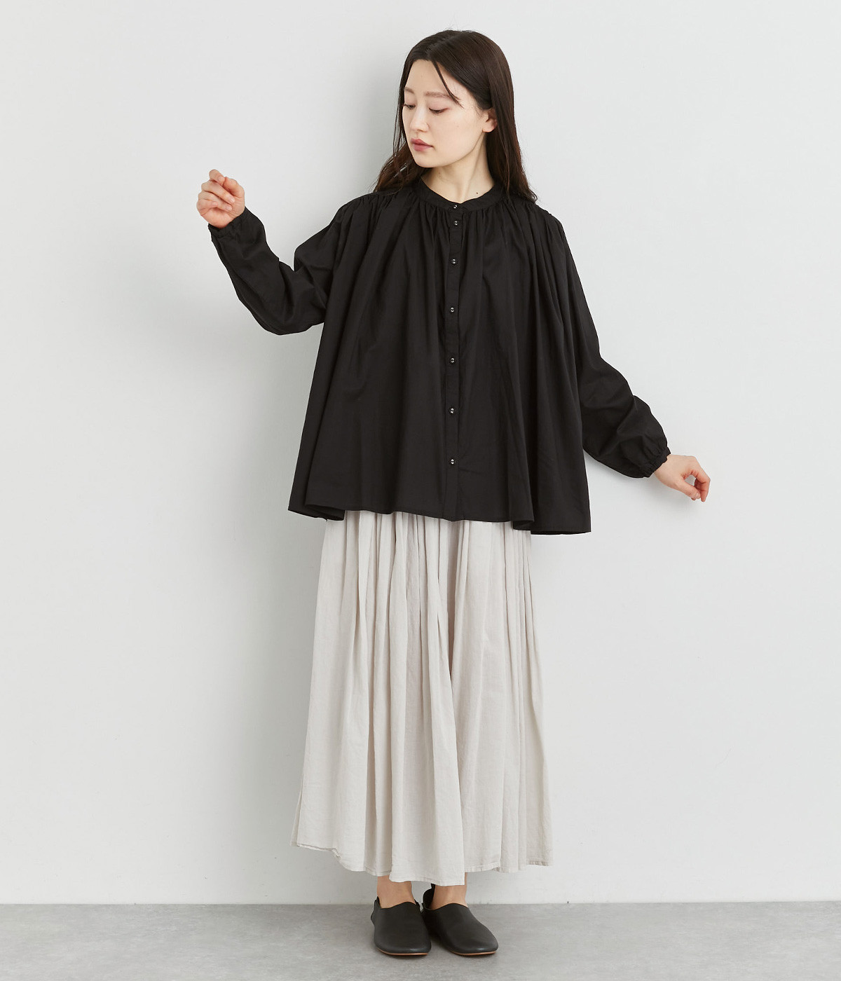 前後にギャザーをたっぷりと寄せたフレアシルエットに仕上げました。袖口は半分ゴム仕様でさりげなく立体感を出し、たくし上げればボリュームもアップ。ボタンをあけて顔まわりに抜けをつくった着こなしもおすすめです。