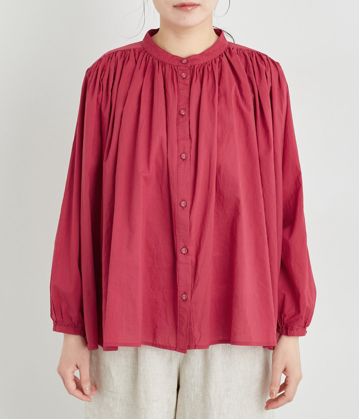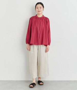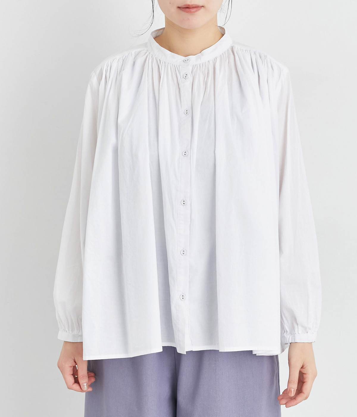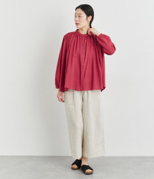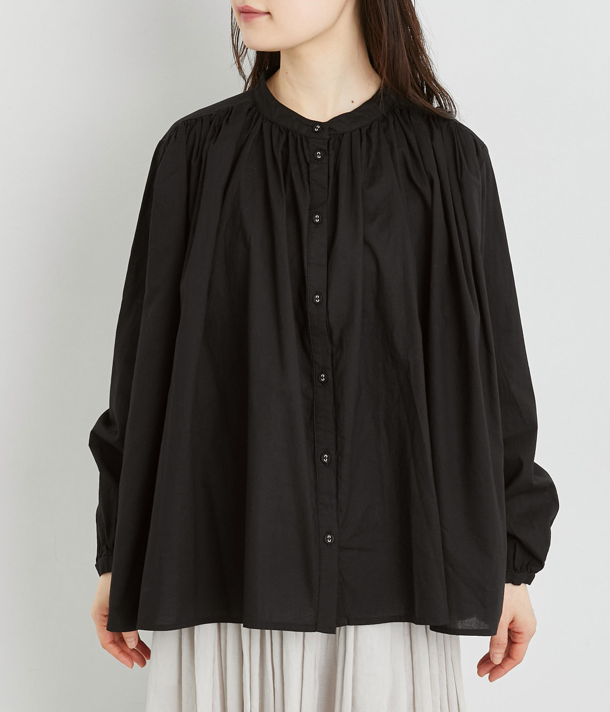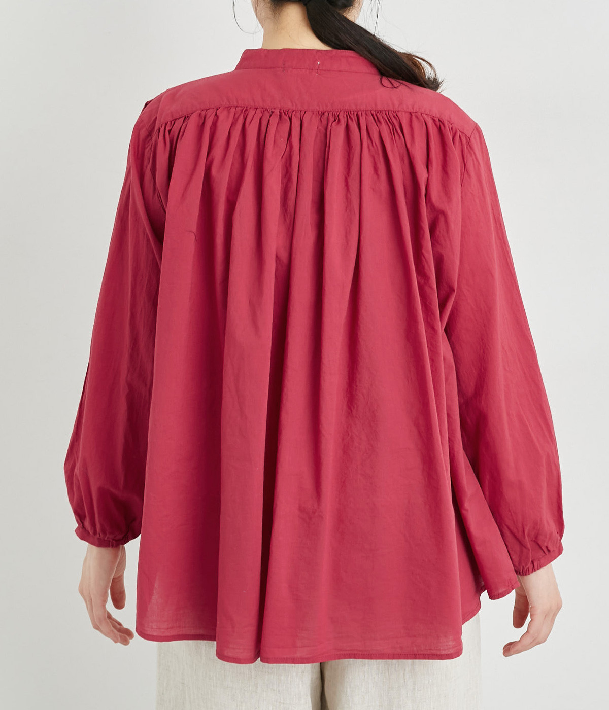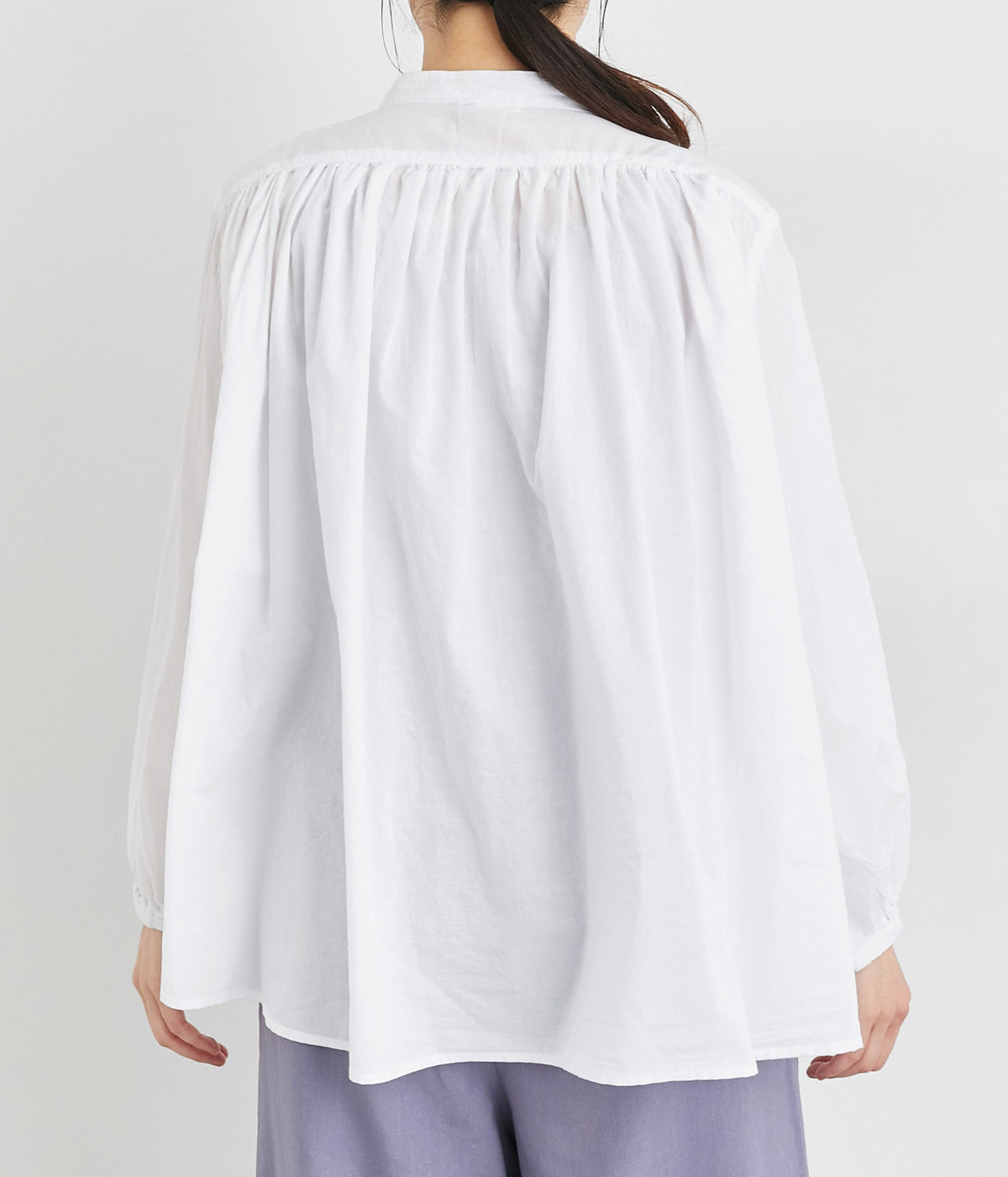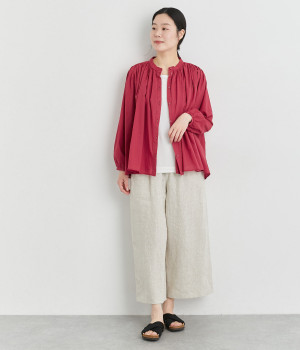 前後にギャザーをたっぷりと寄せたフレアシルエットに仕上げました。袖口は半分ゴム仕様でさりげなく立体感を出し、たくし上げればボリュームもアップ。ボタンをあけて顔まわりに抜けをつくった着こなしもおすすめです。