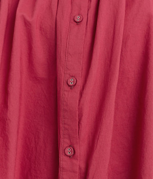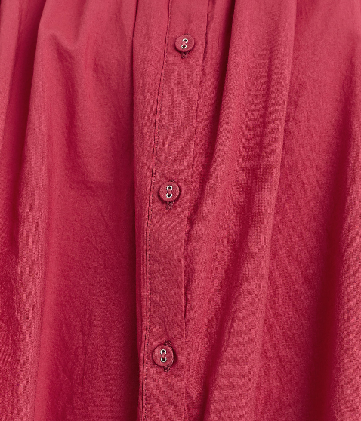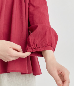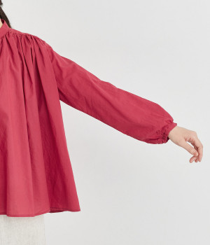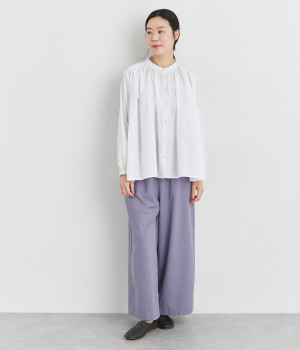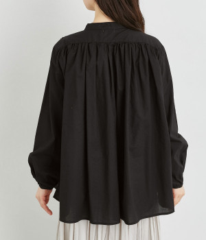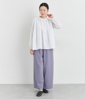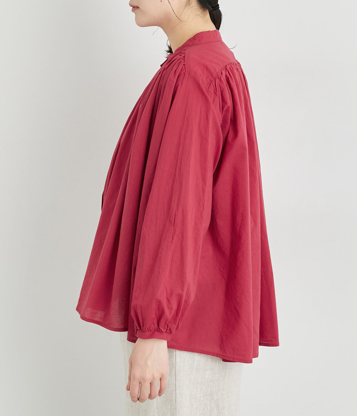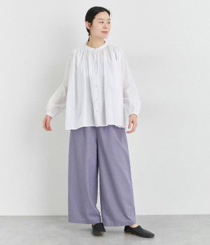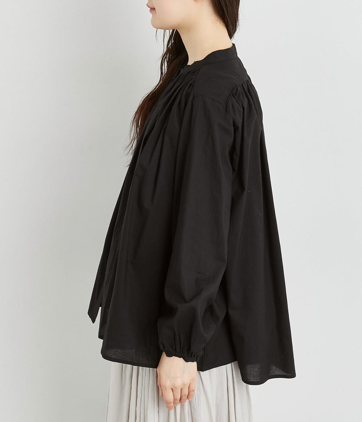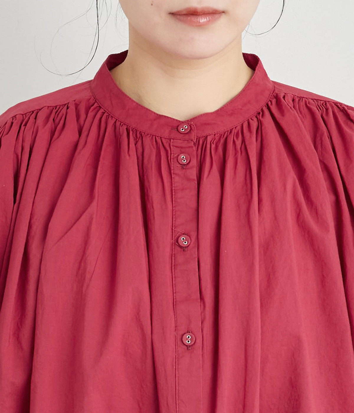 前後にギャザーをたっぷりと寄せたフレアシルエットに仕上げました。袖口は半分ゴム仕様でさりげなく立体感を出し、たくし上げればボリュームもアップ。ボタンをあけて顔まわりに抜けをつくった着こなしもおすすめです。