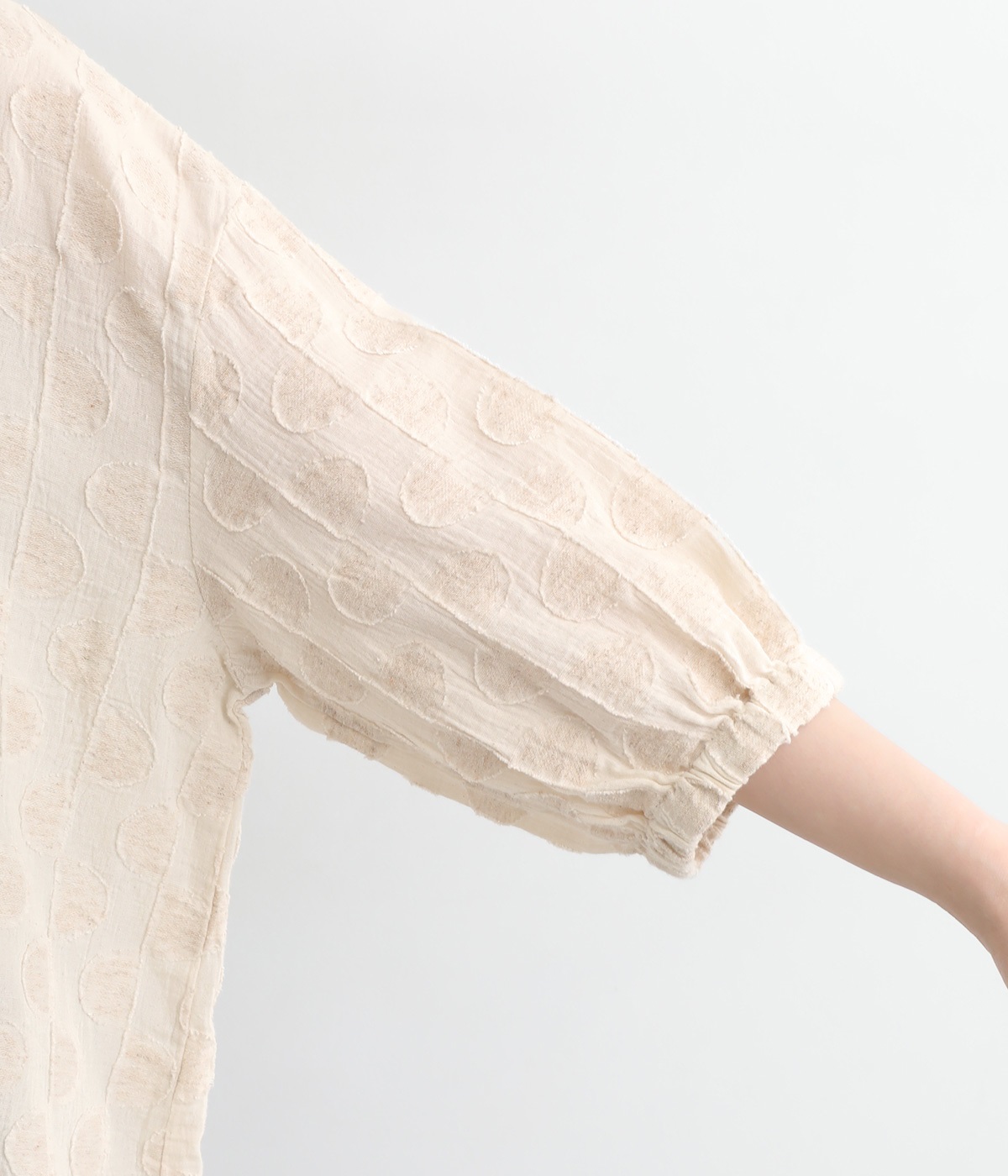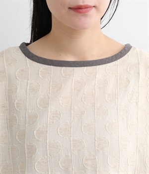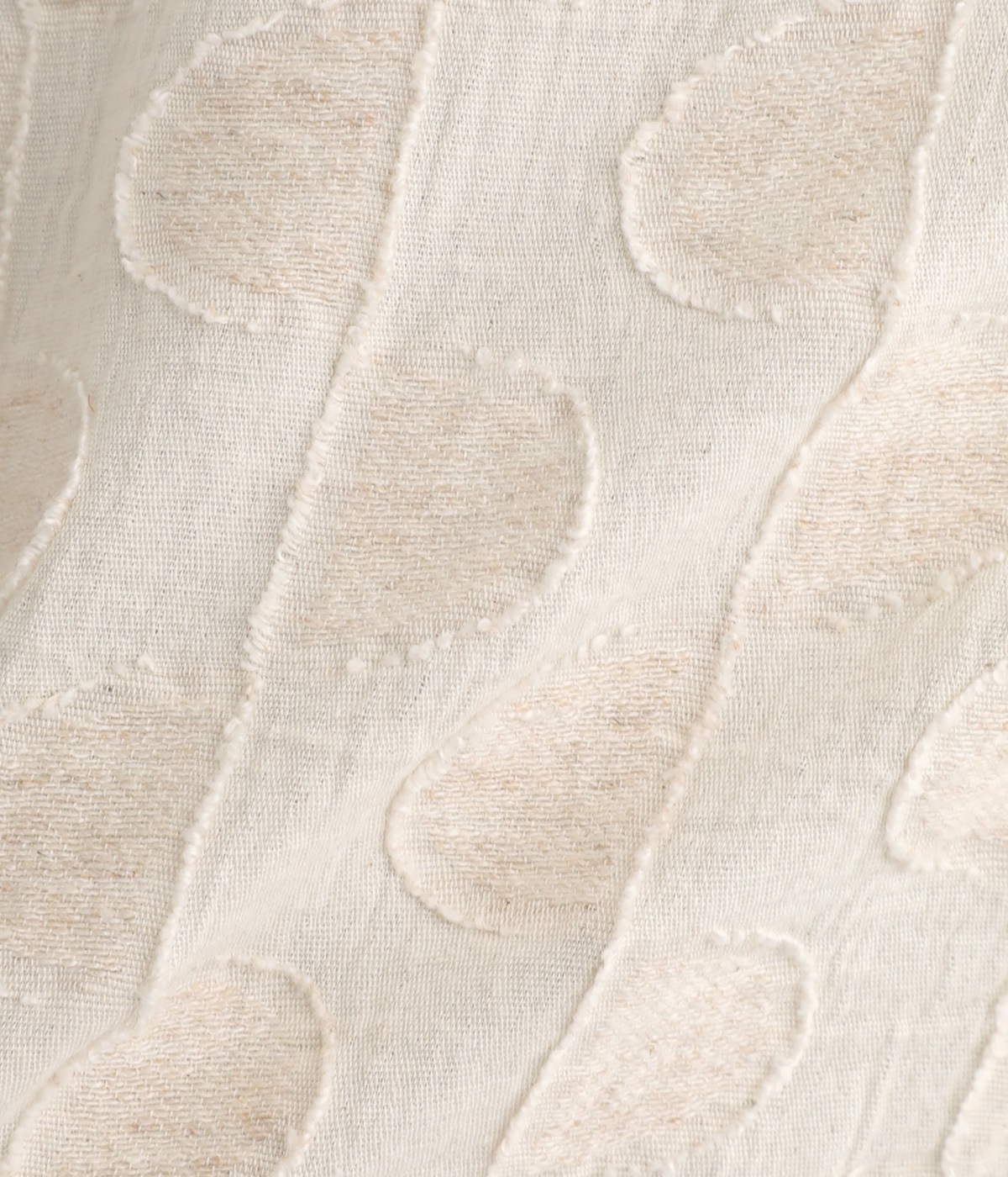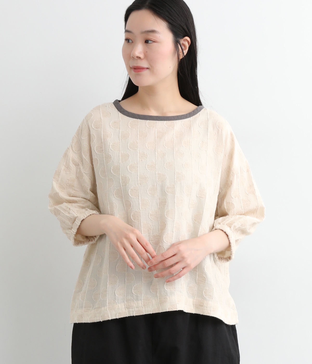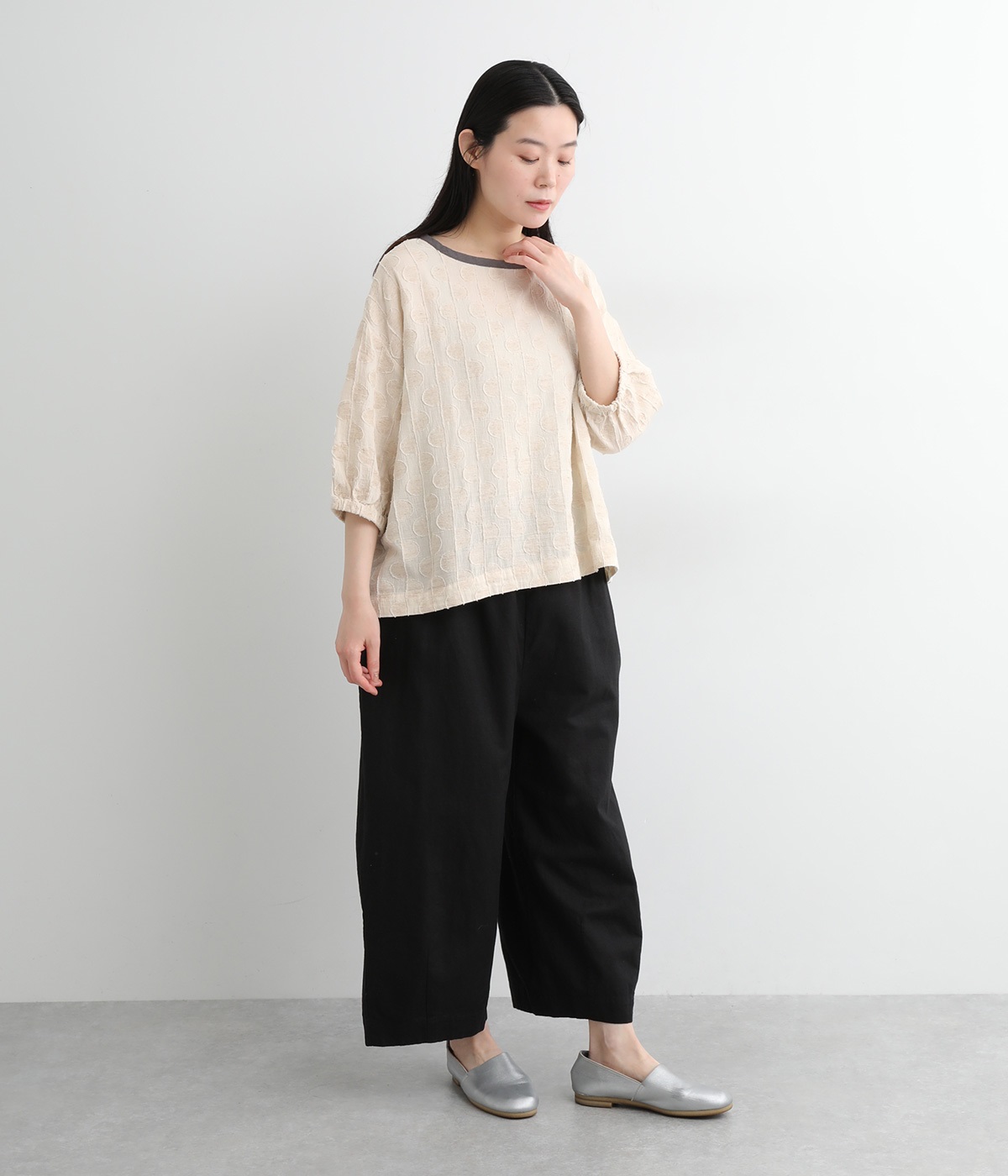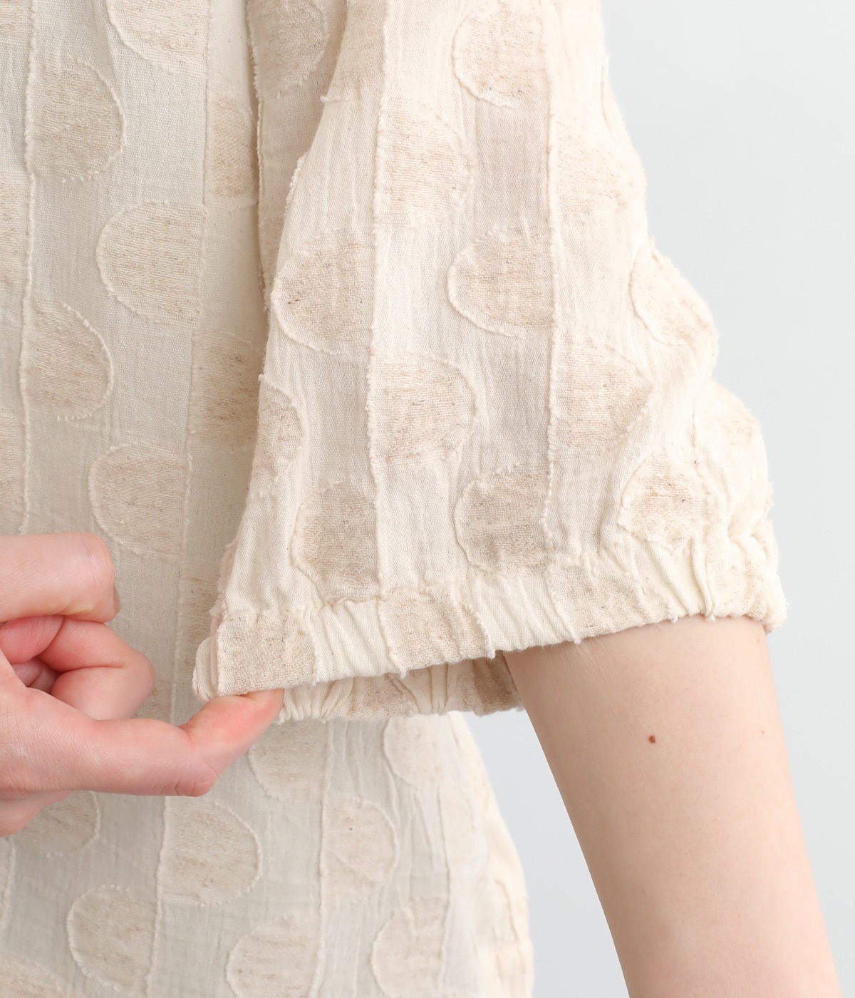 やらかい肌触りのコットンリネン生地を使用しています。半円のようなジャカード柄が特徴的で、ナチュラルな空気感の中にもアクセントを加えました。