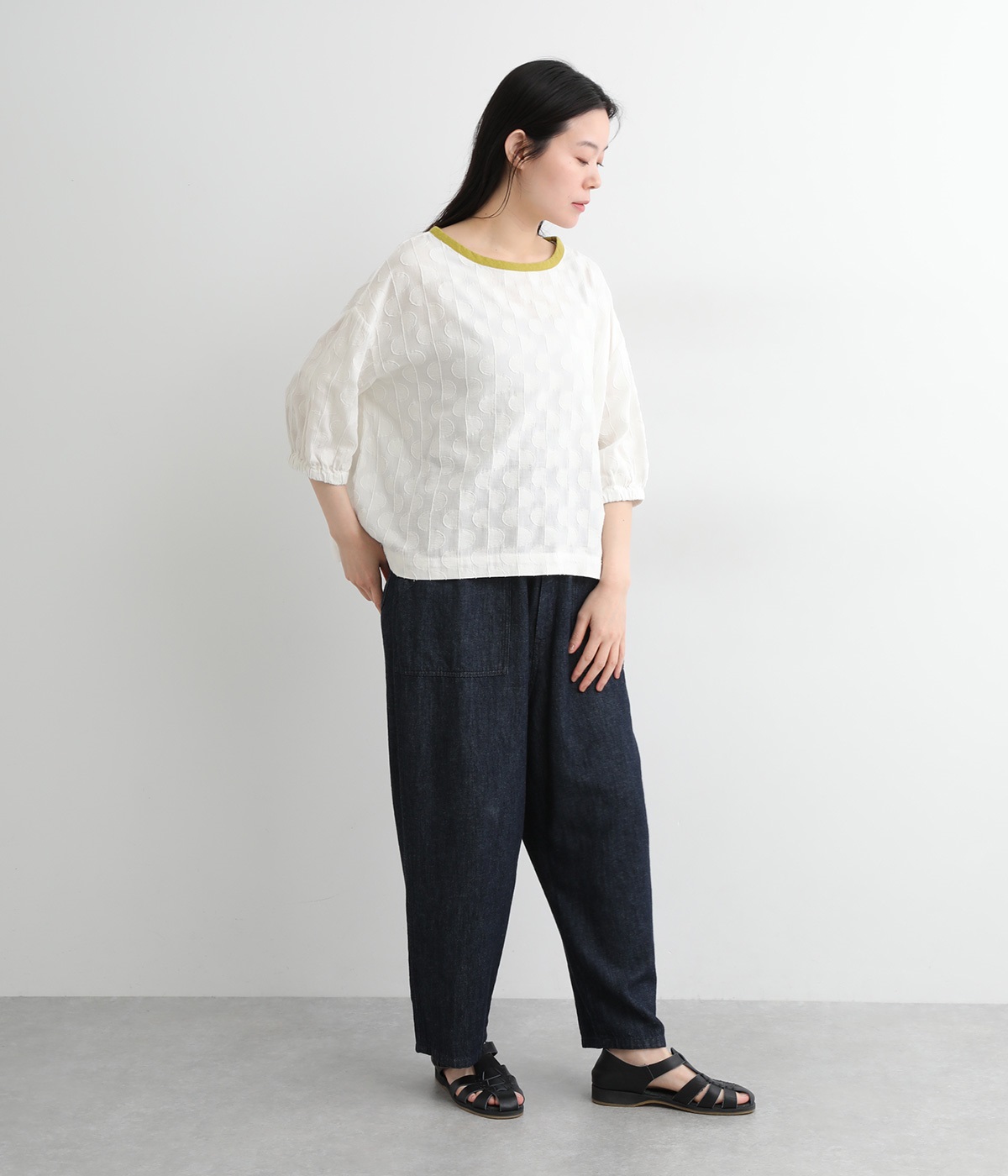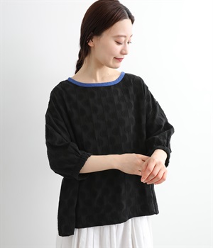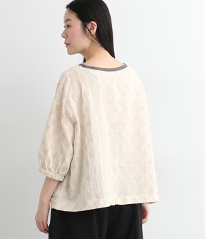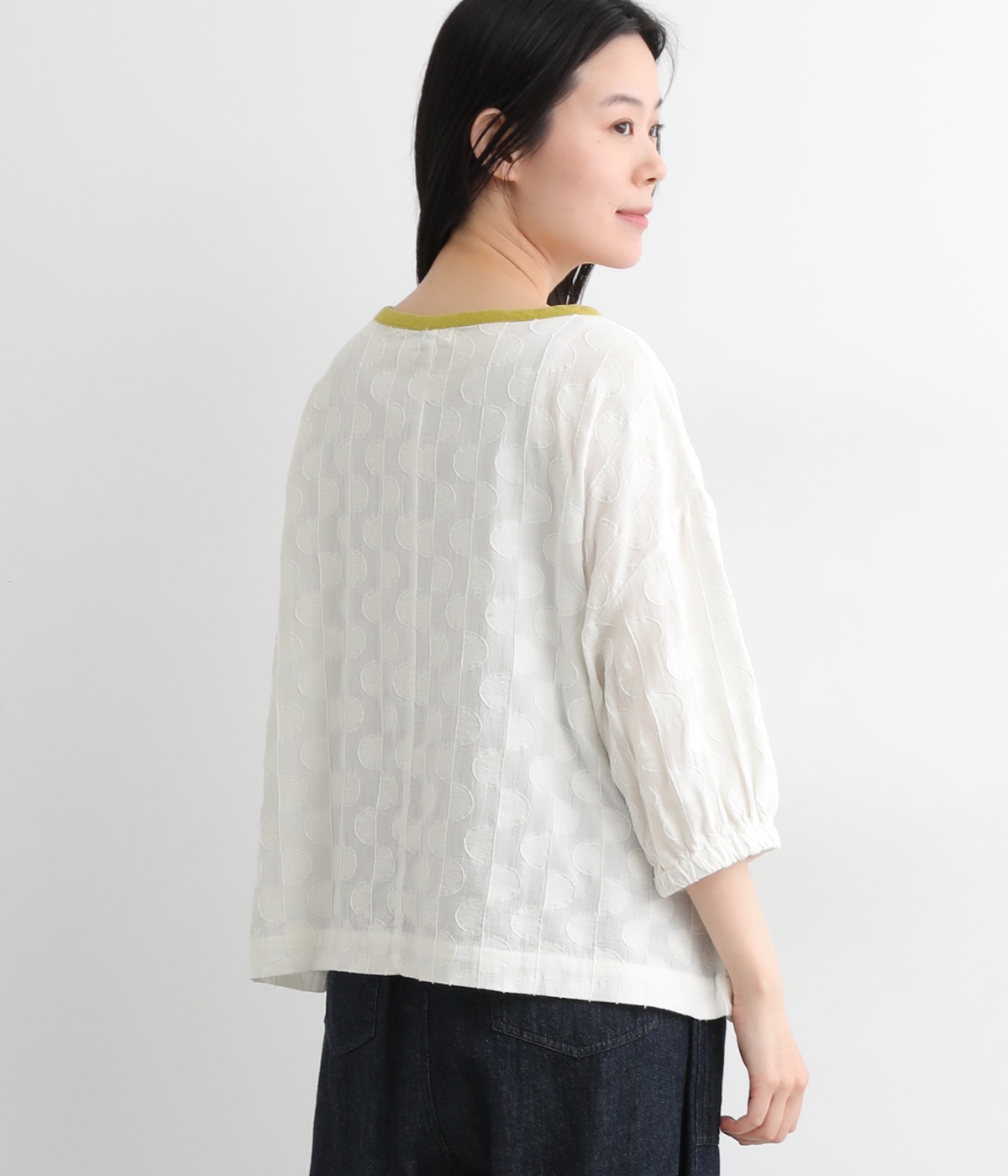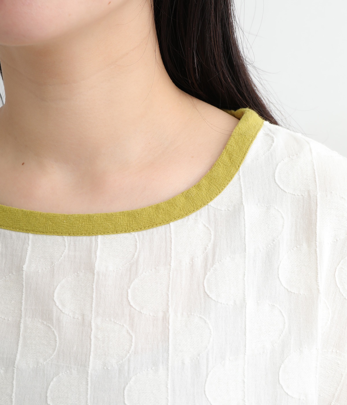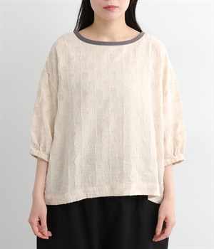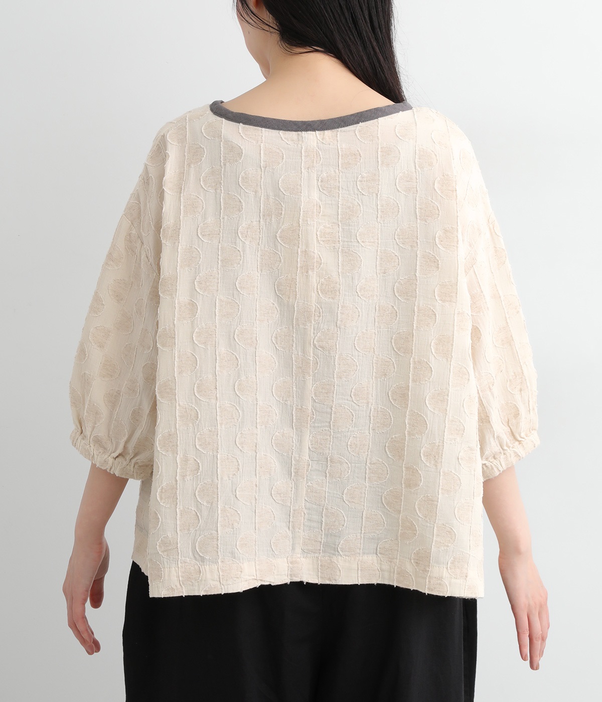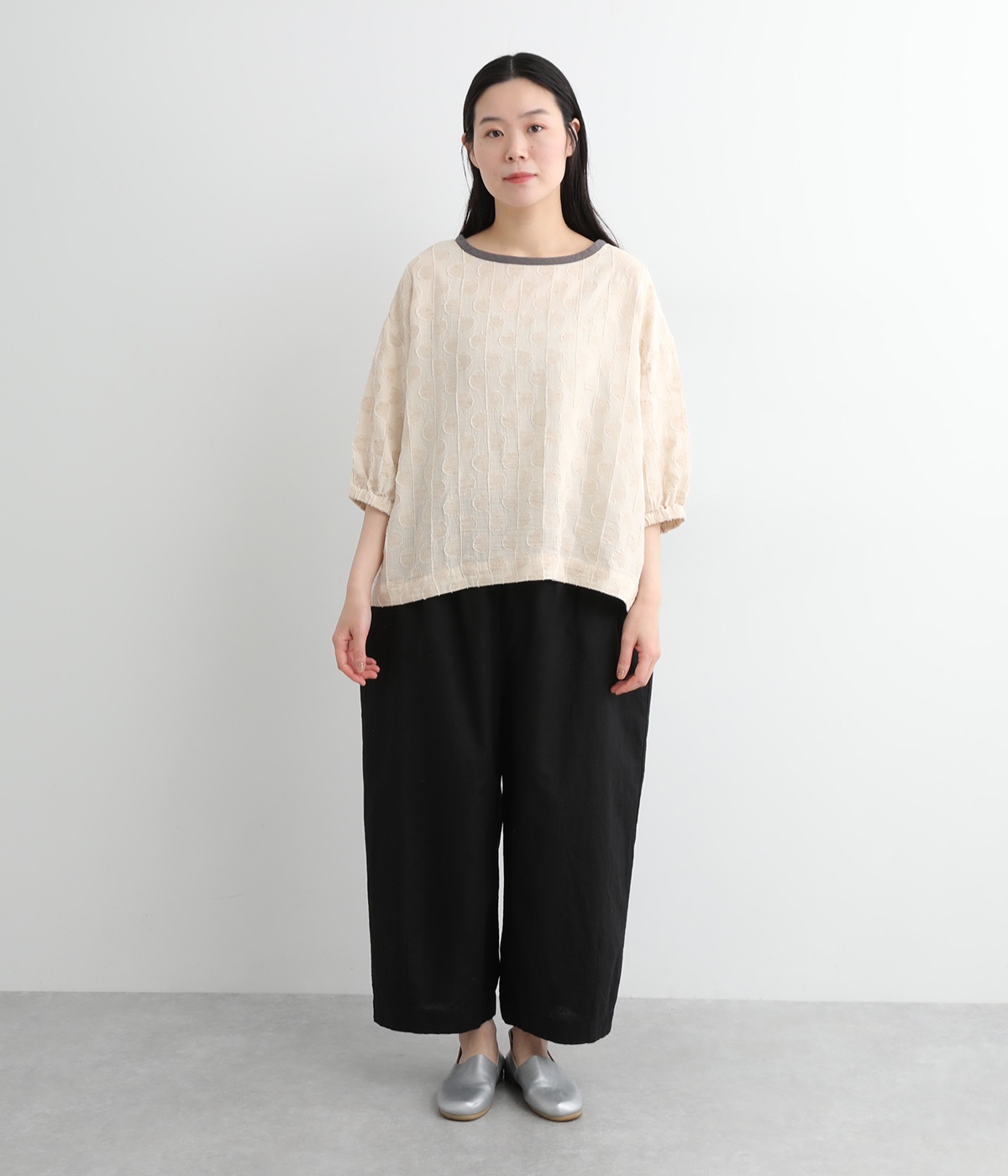 やらかい肌触りのコットンリネン生地を使用しています。半円のようなジャカード柄が特徴的で、ナチュラルな空気感の中にもアクセントを加えました。
