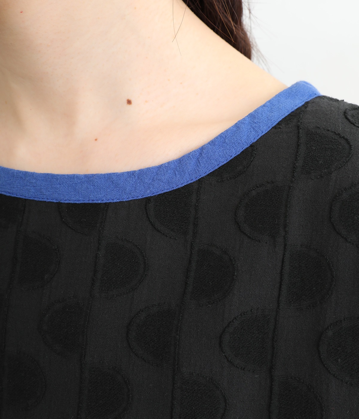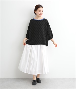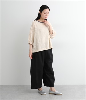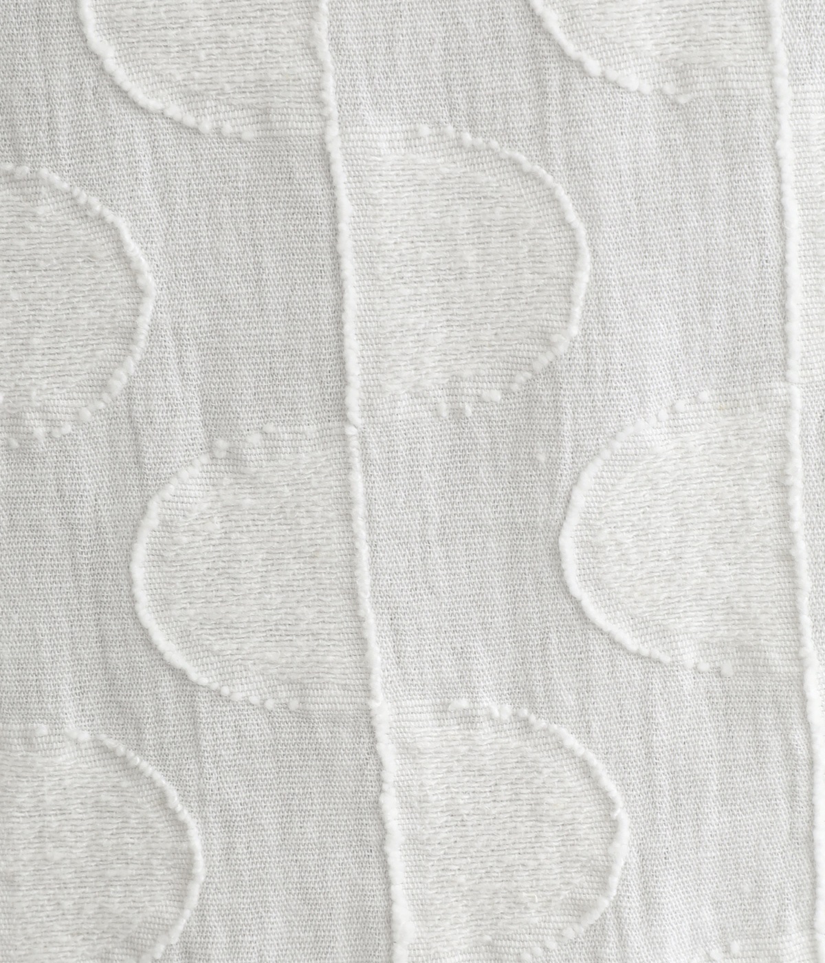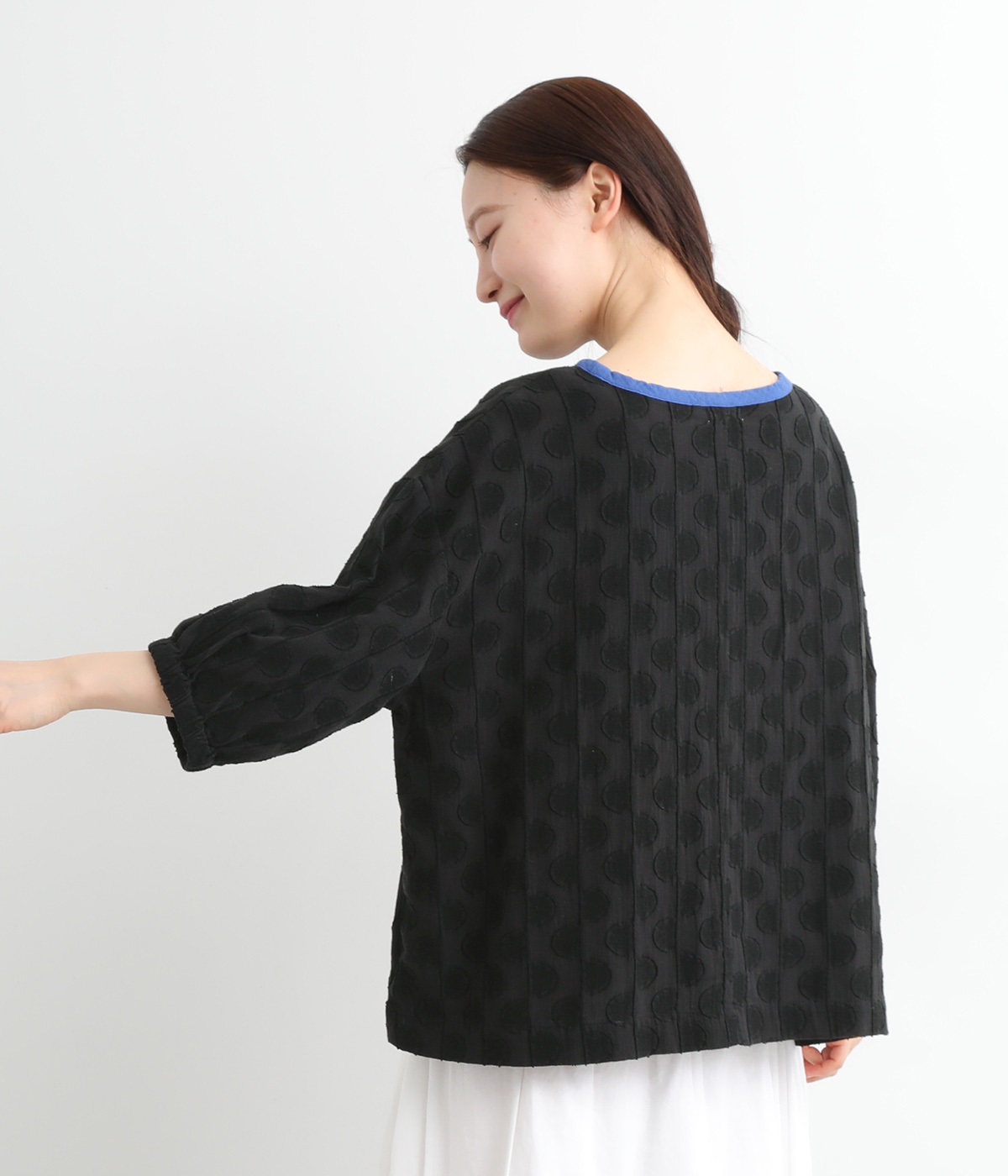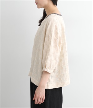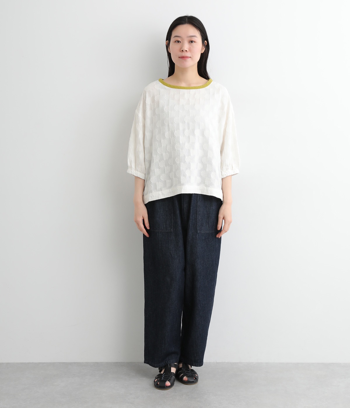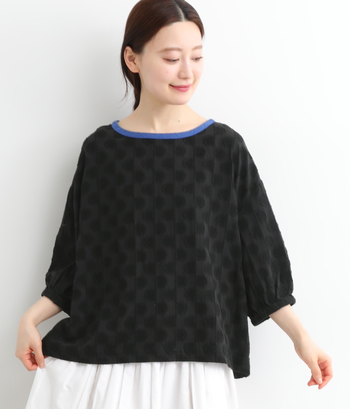やらかい肌触りのコットンリネン生地を使用しています。半円のようなジャカード柄が特徴的で、ナチュラルな空気感の中にもアクセントを加えました。