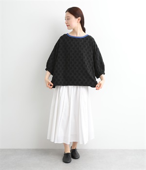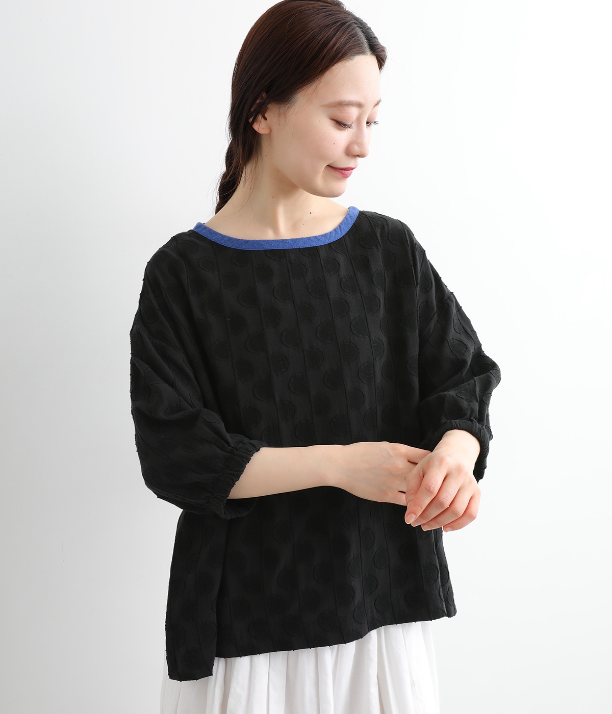 袖口にゴムを入れたバルーンスリーブでフェミニンな印象に仕上げたブラウスです。首元の配色仕様でメリハリを加えて着映え力もアップ。ゆとりのあるボックスシルエットで着心地も快適です。