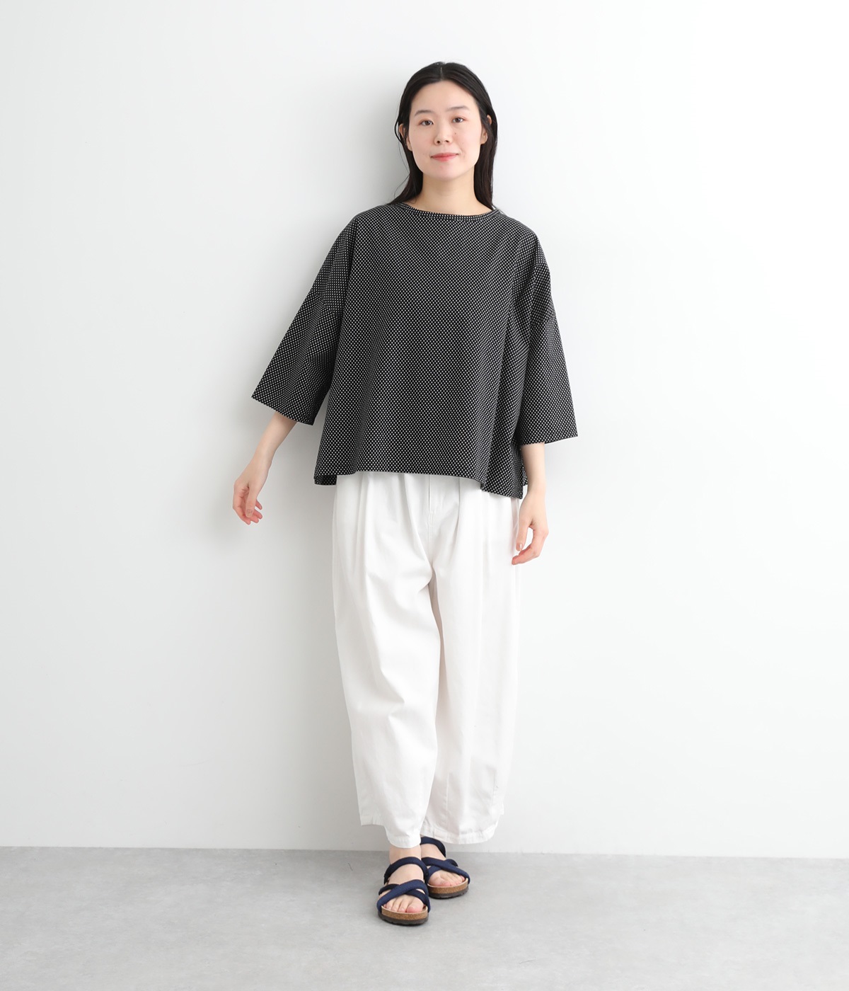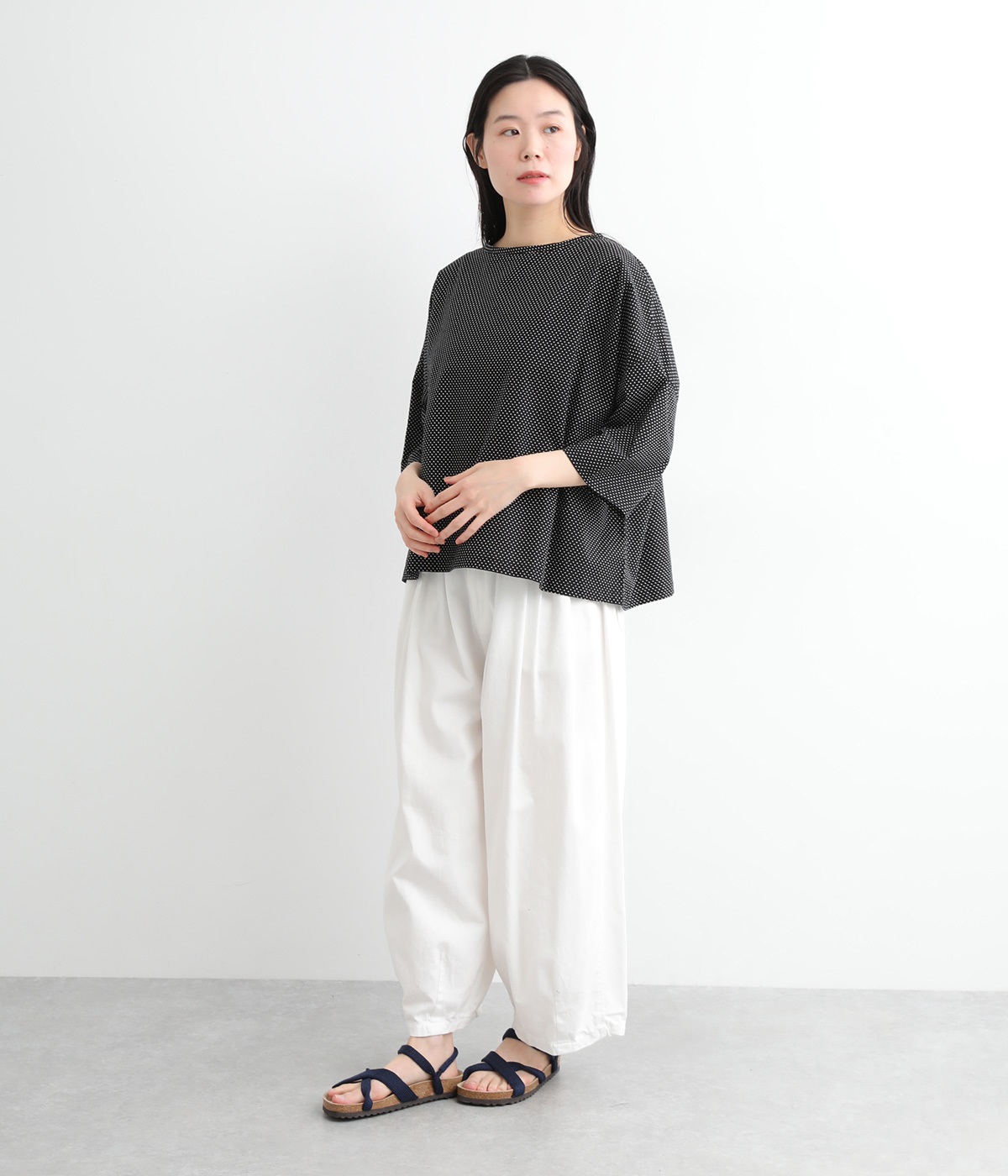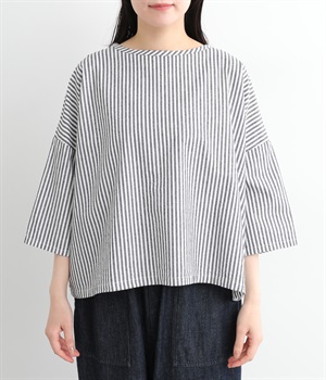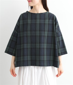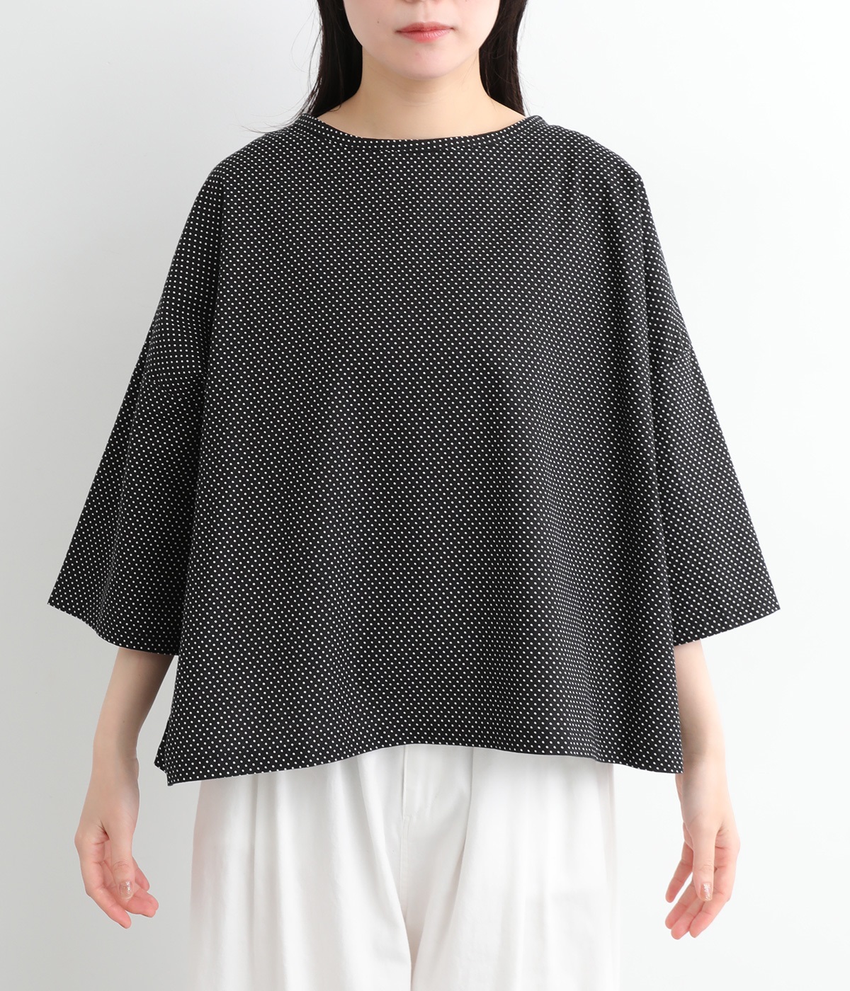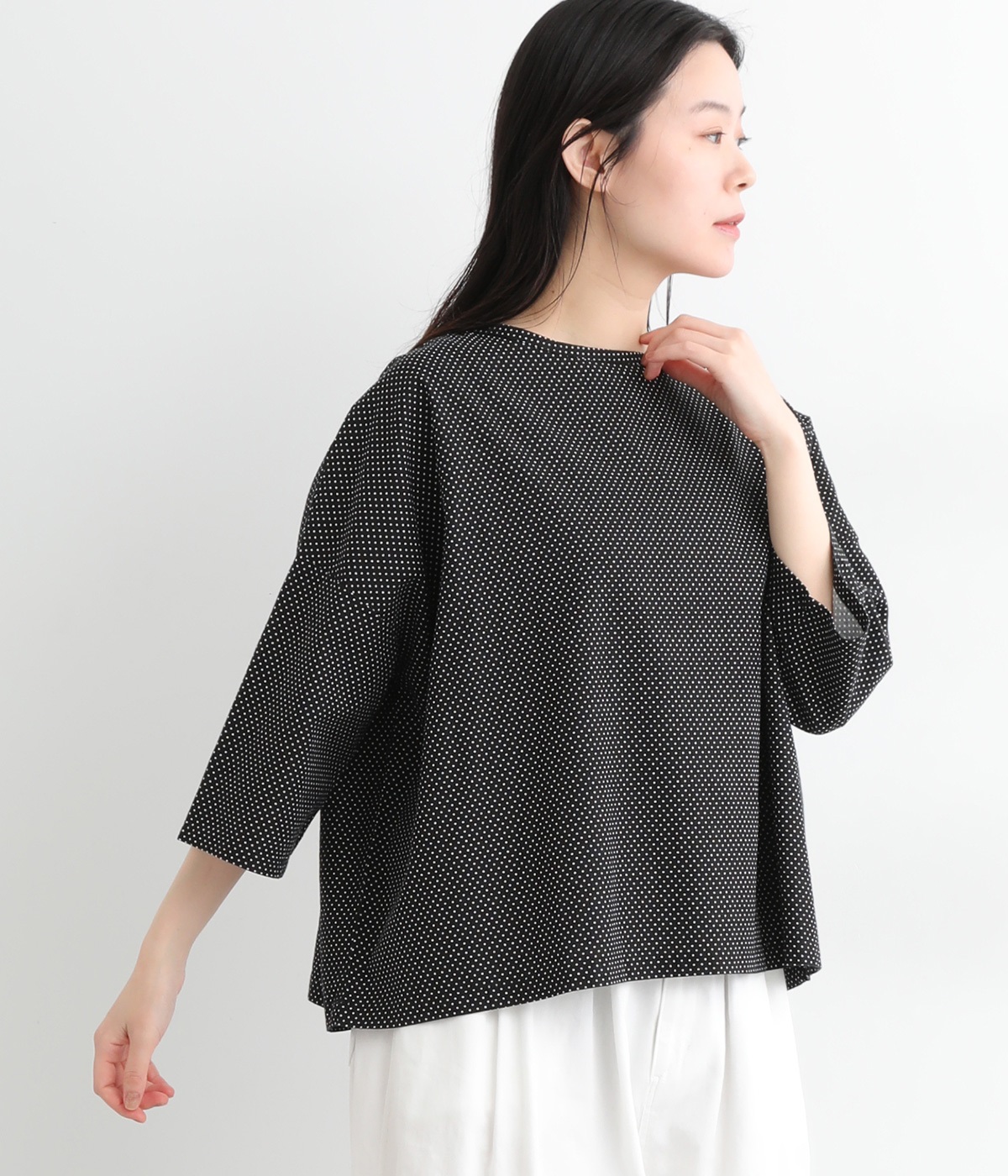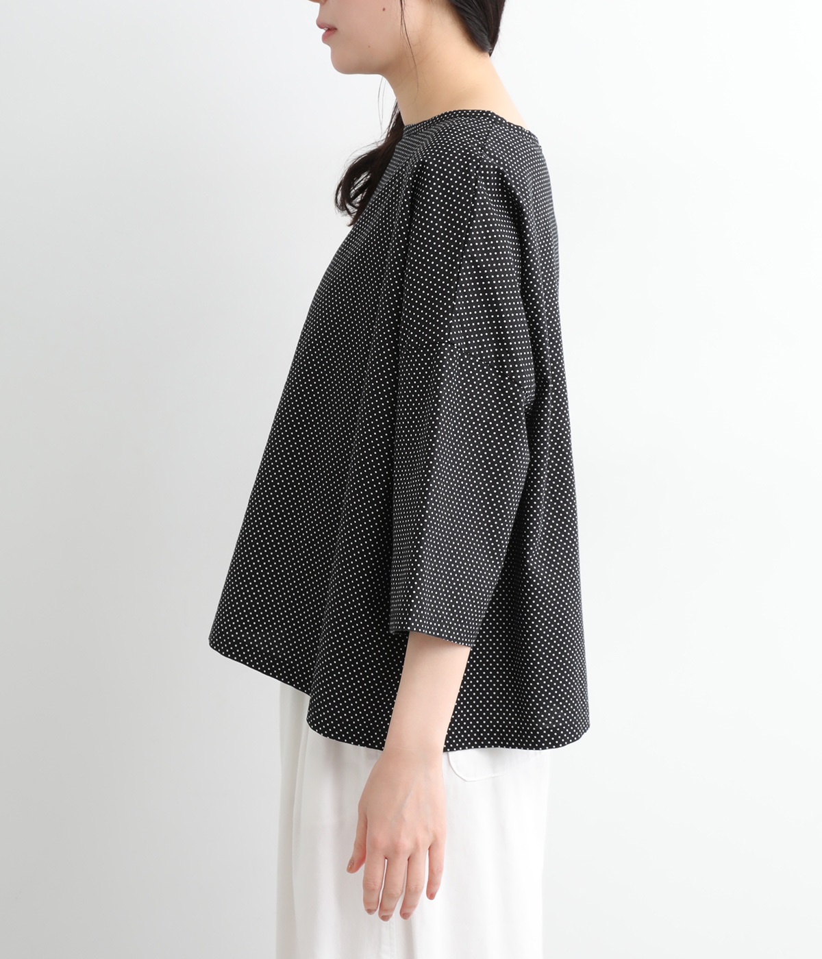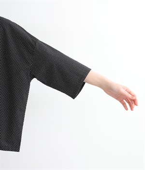 身幅をたっぷり取ったワイドシルエットがシンプルながらも目を惹きます。着用した際の脇の自然なドレープ感が総柄生地をより表情豊かに。7分袖ほどになるので季節の変わり目にも着まわせる一枚です。