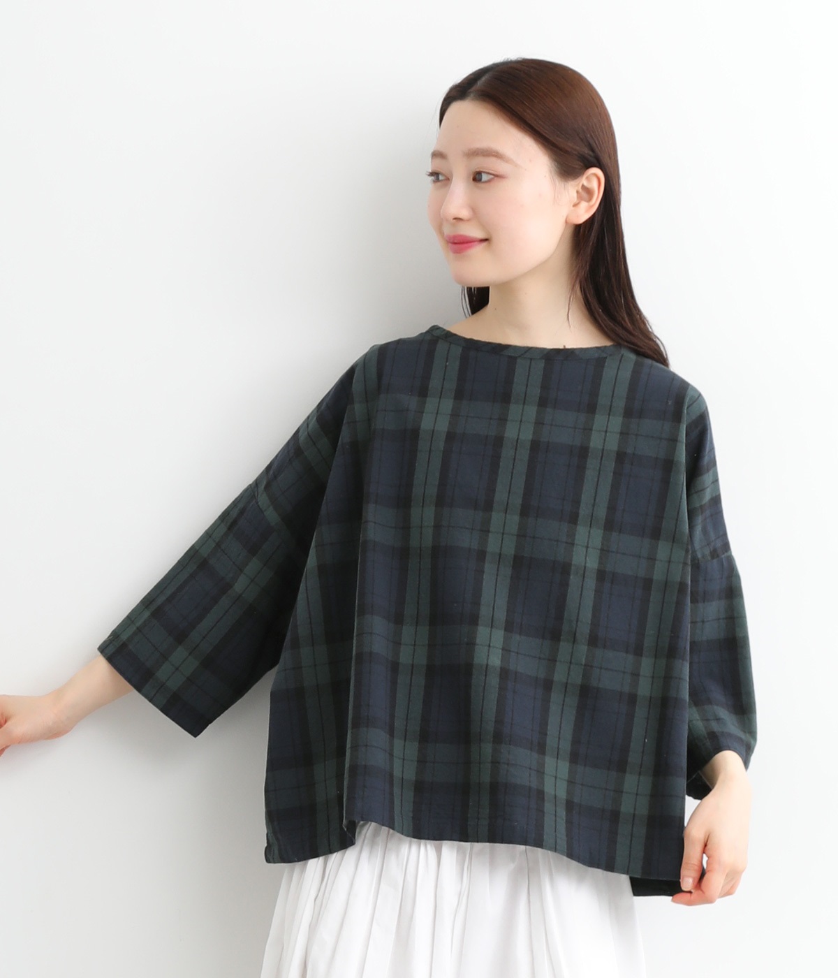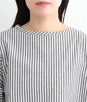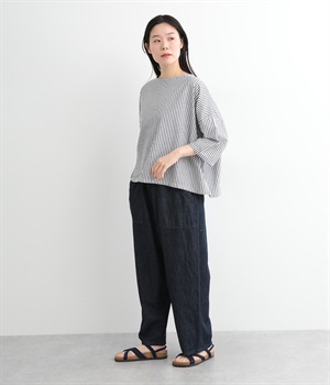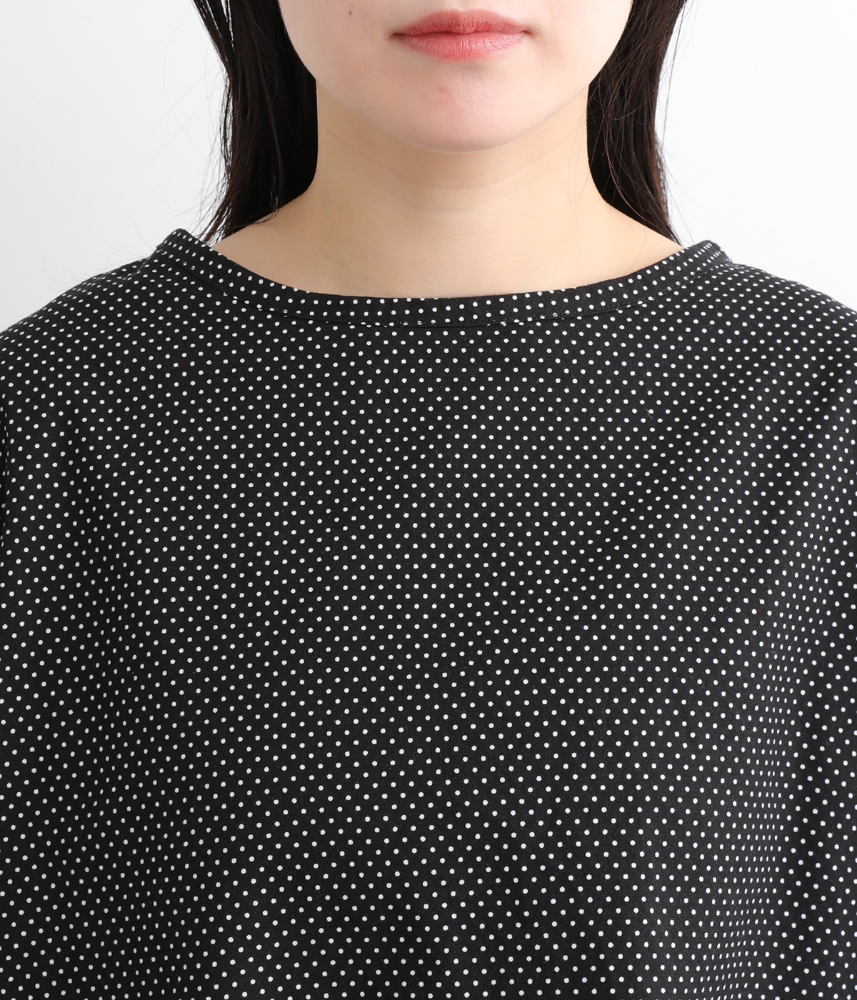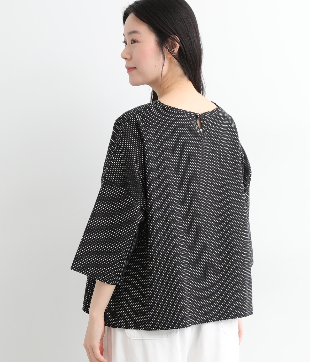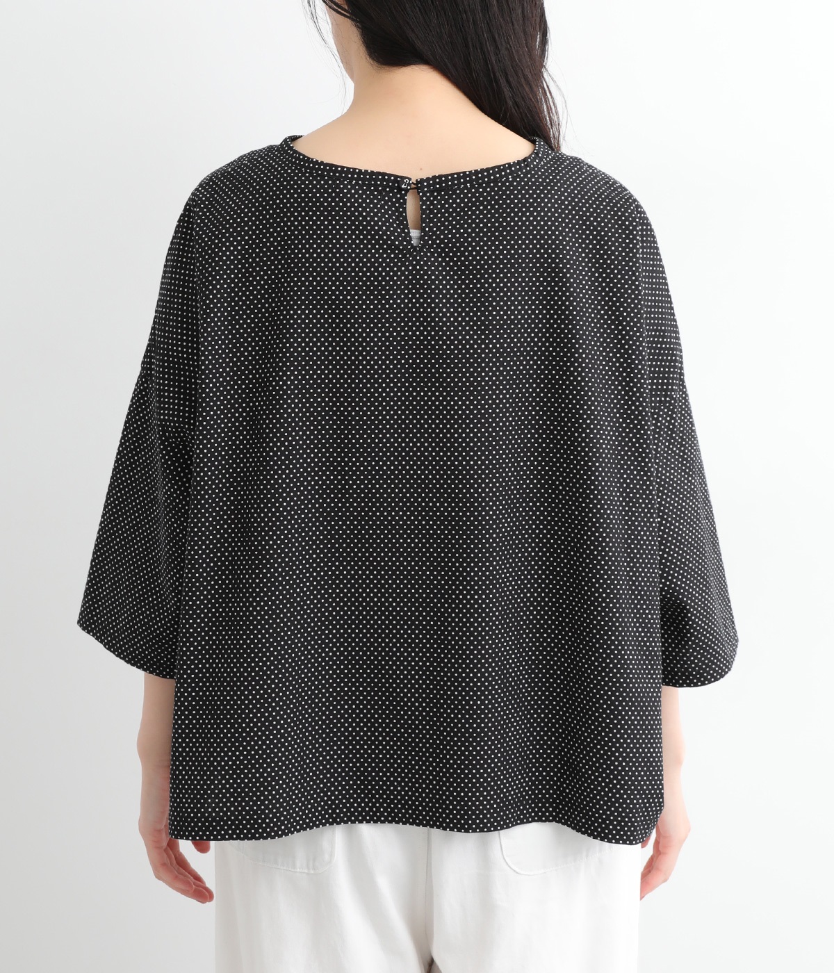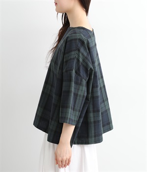 身幅をたっぷり取ったワイドシルエットがシンプルながらも目を惹きます。着用した際の脇の自然なドレープ感が総柄生地をより表情豊かに。7分袖ほどになるので季節の変わり目にも着まわせる一枚です。