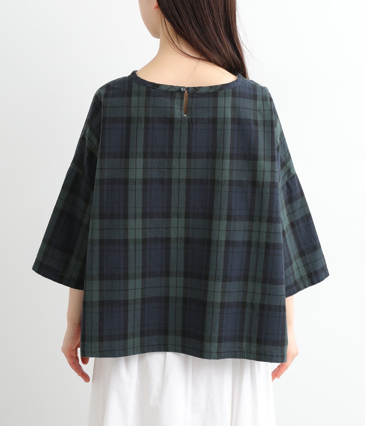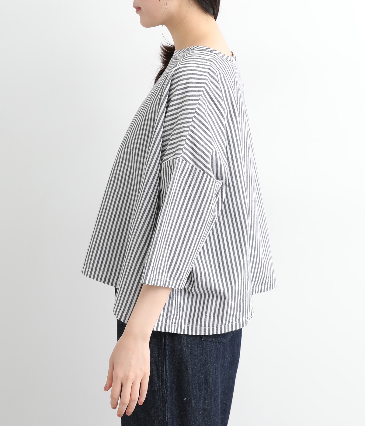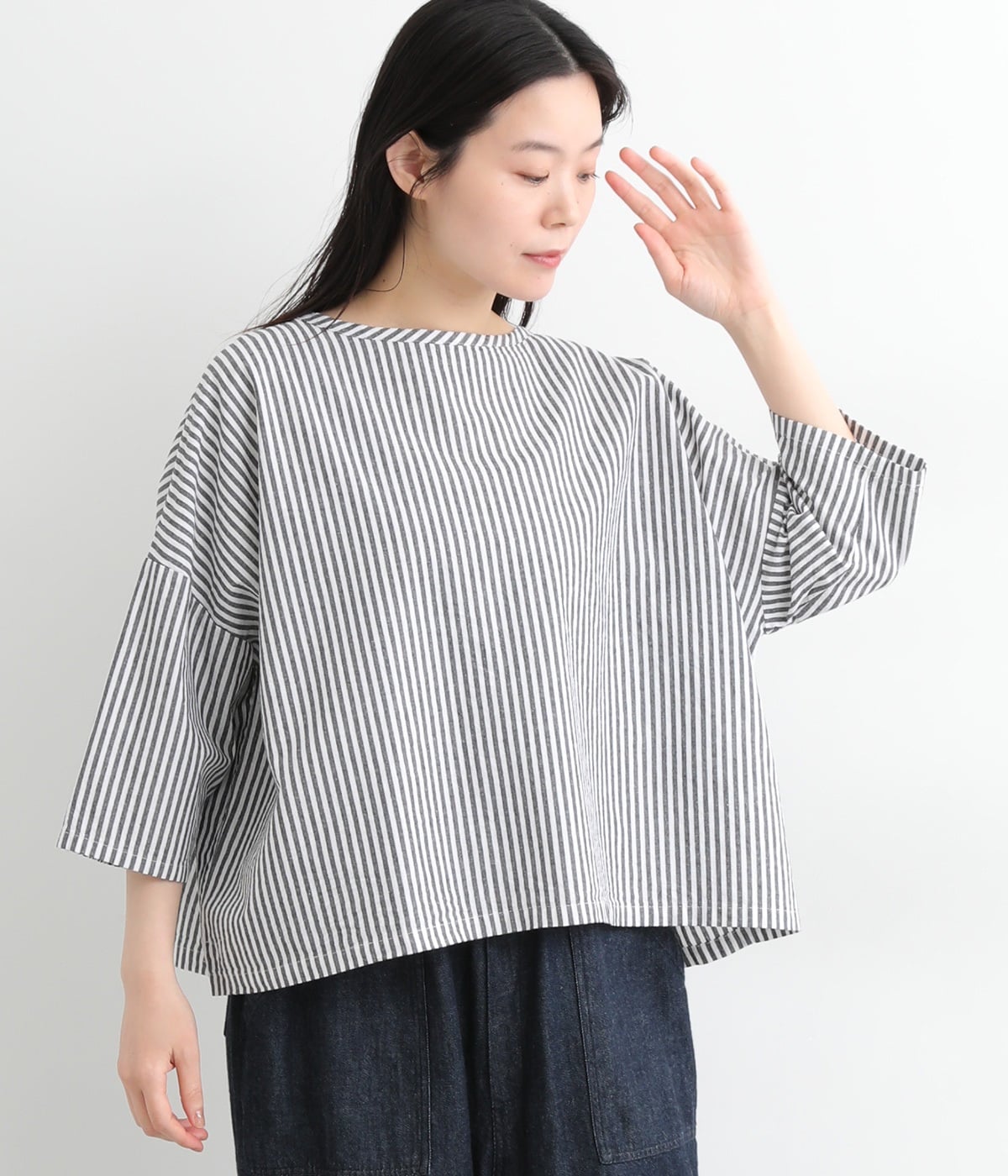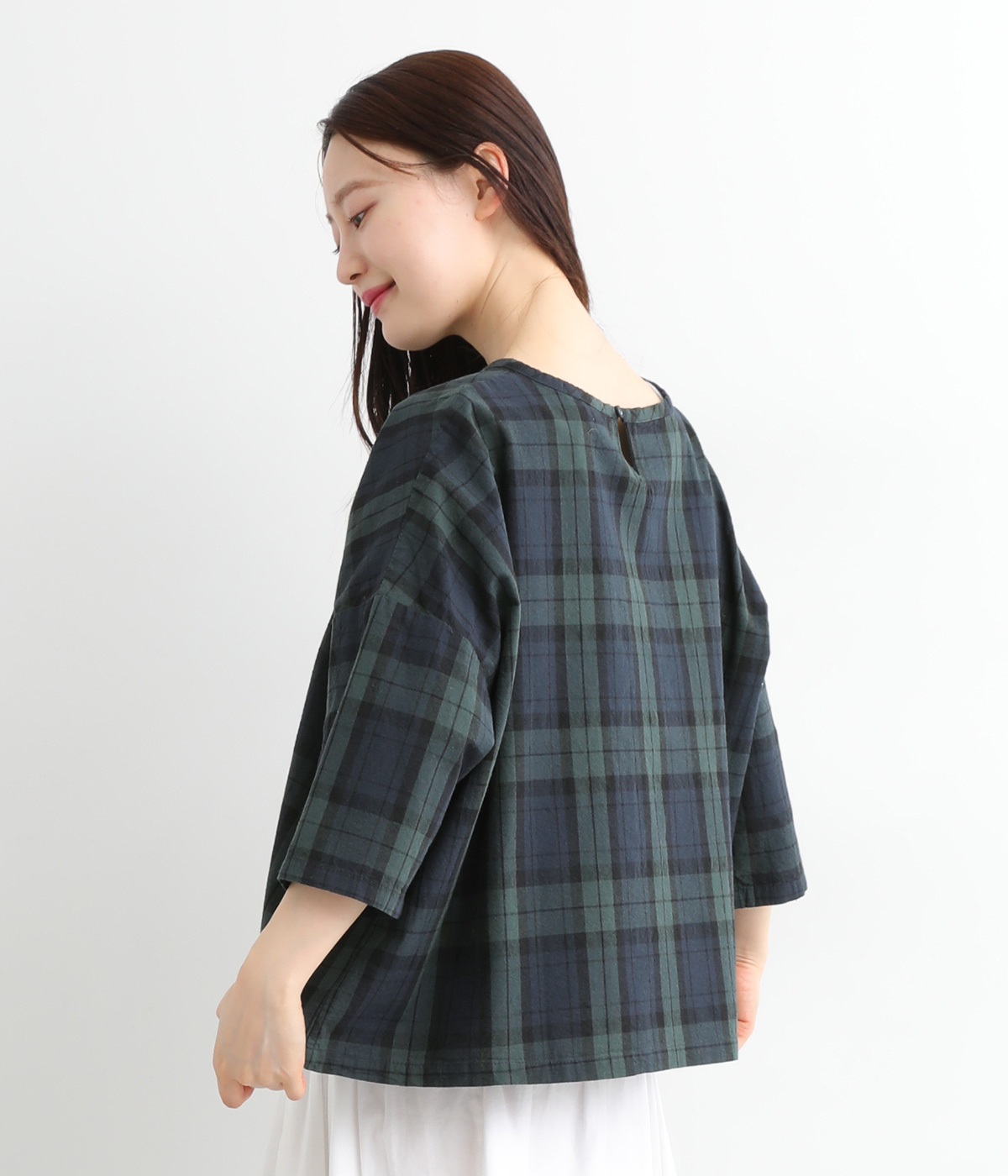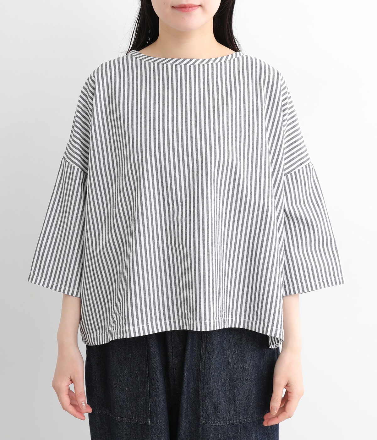 身幅をたっぷり取ったワイドシルエットがシンプルながらも目を惹きます。着用した際の脇の自然なドレープ感が総柄生地をより表情豊かに。7分袖ほどになるので季節の変わり目にも着まわせる一枚です。