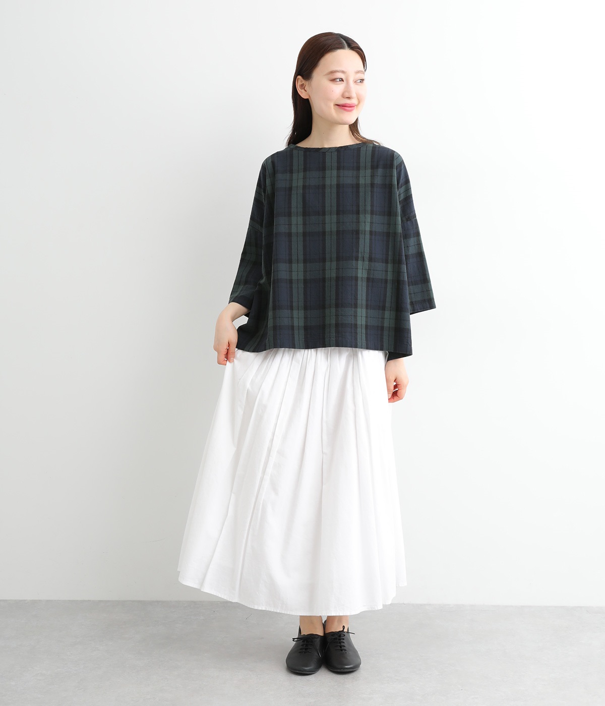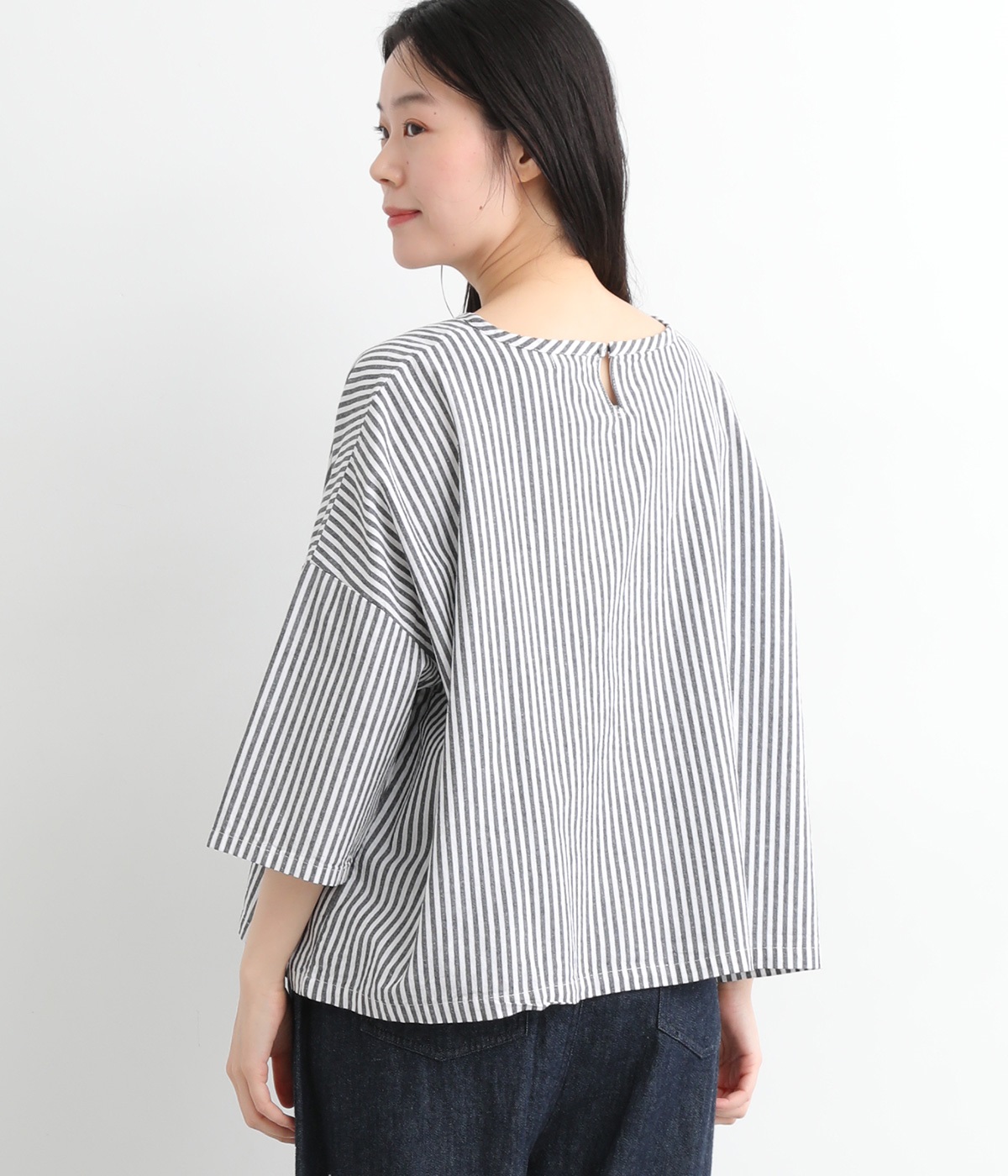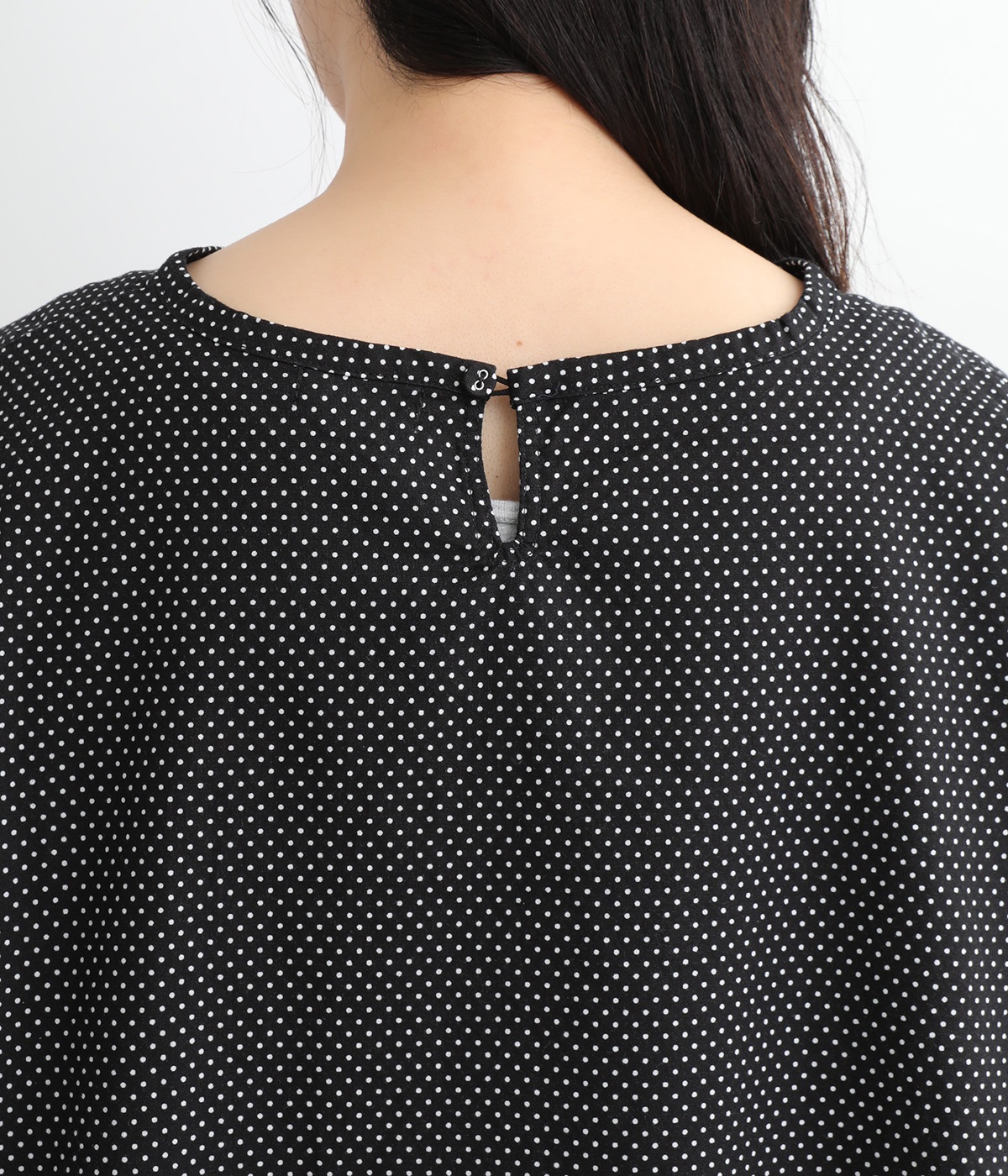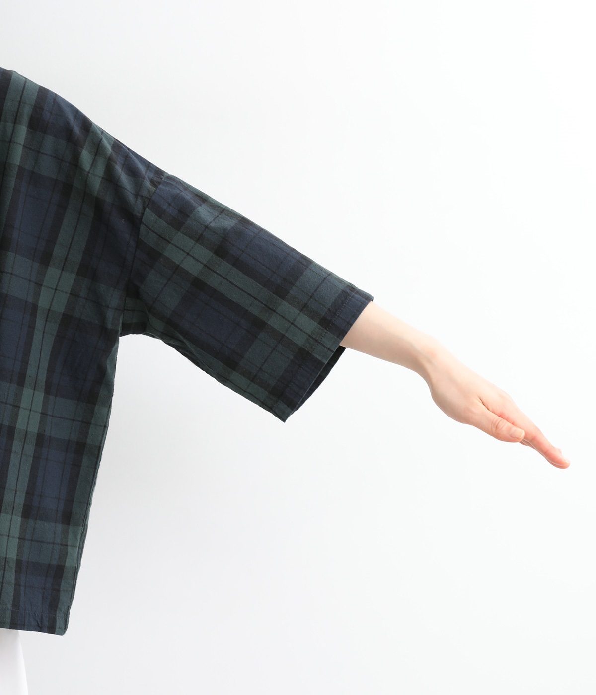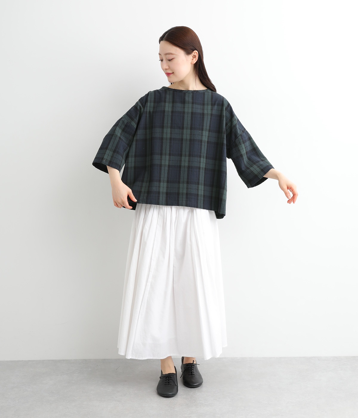 身幅をたっぷり取ったワイドシルエットがシンプルながらも目を惹きます。着用した際の脇の自然なドレープ感が総柄生地をより表情豊かに。7分袖ほどになるので季節の変わり目にも着まわせる一枚です。