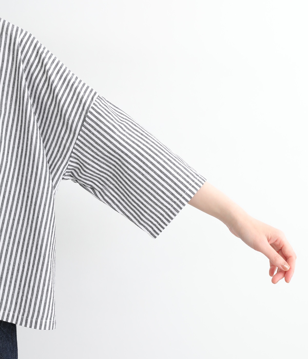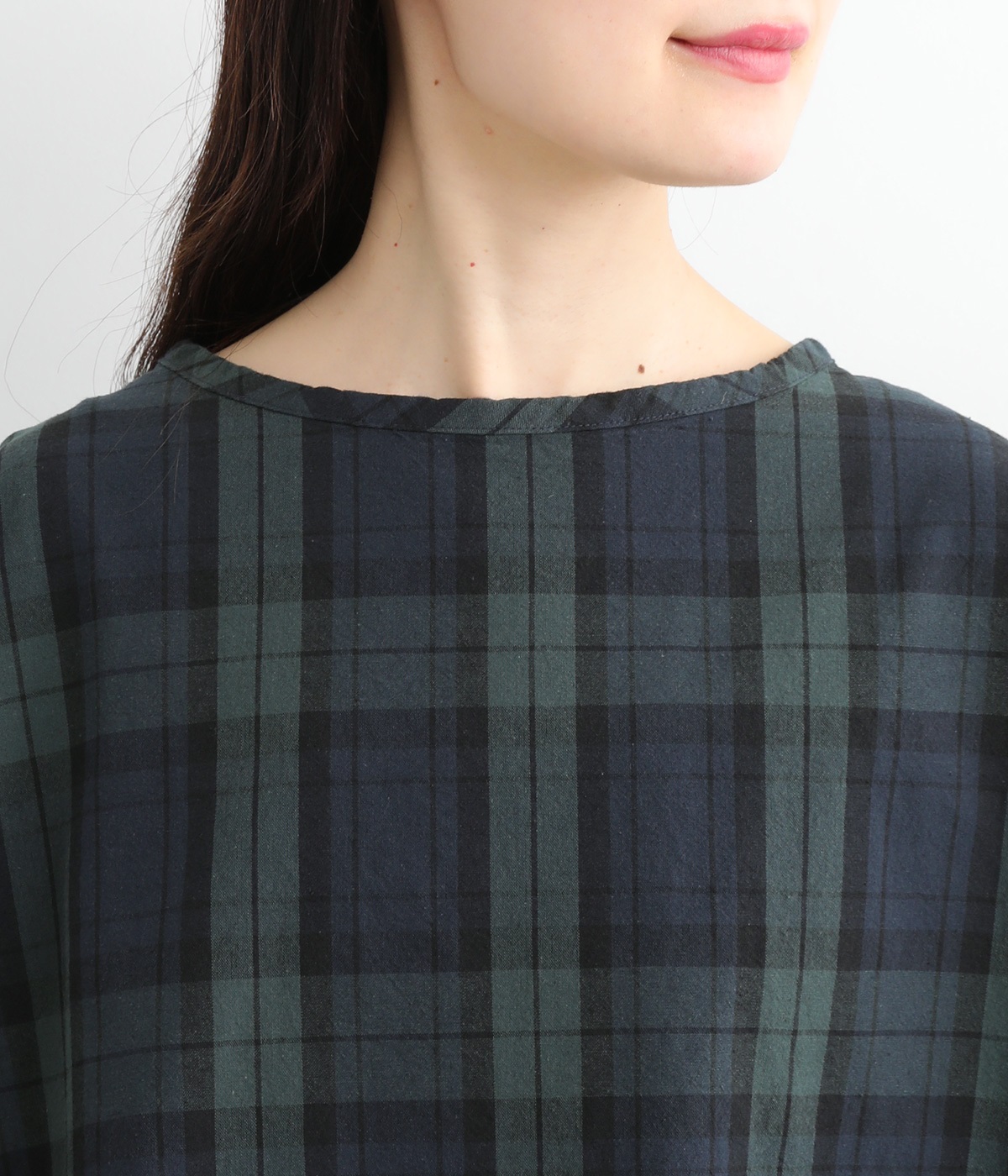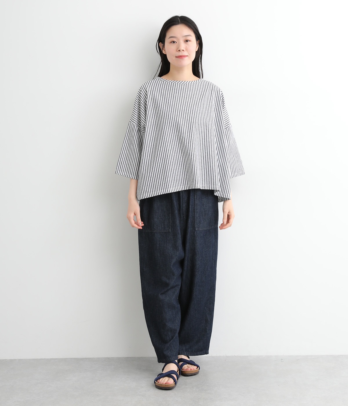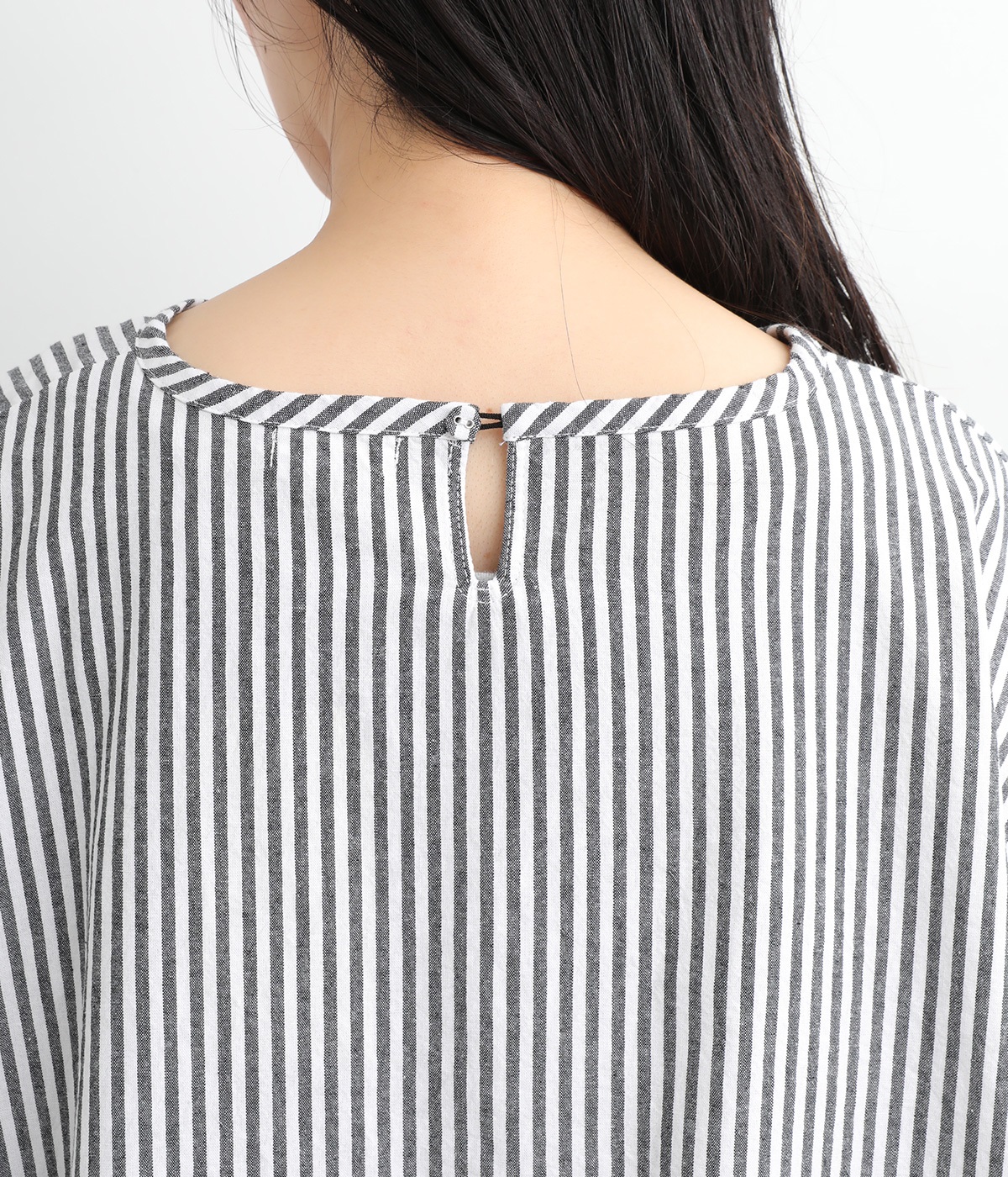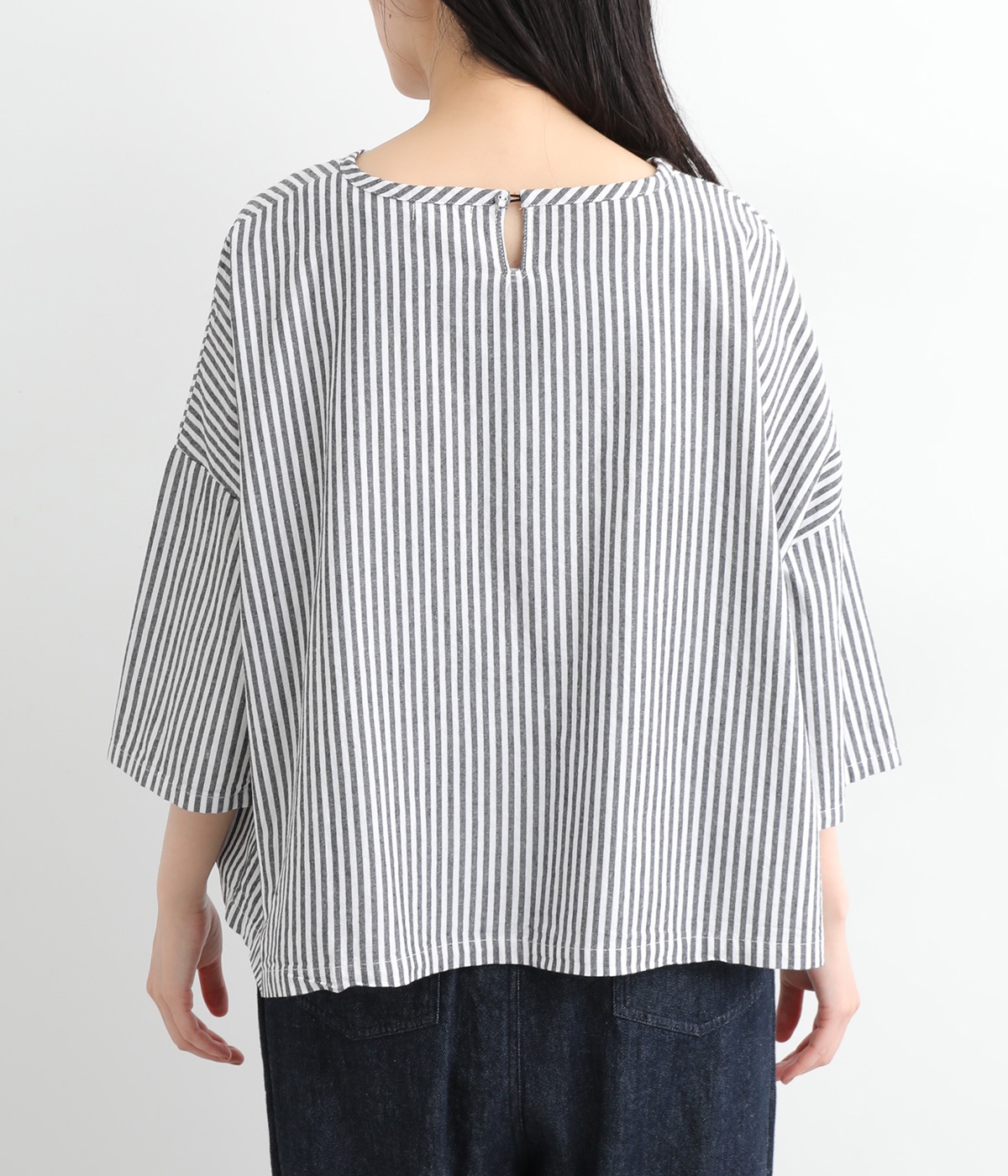 身幅をたっぷり取ったワイドシルエットがシンプルながらも目を惹きます。着用した際の脇の自然なドレープ感が総柄生地をより表情豊かに。7分袖ほどになるので季節の変わり目にも着まわせる一枚です。