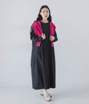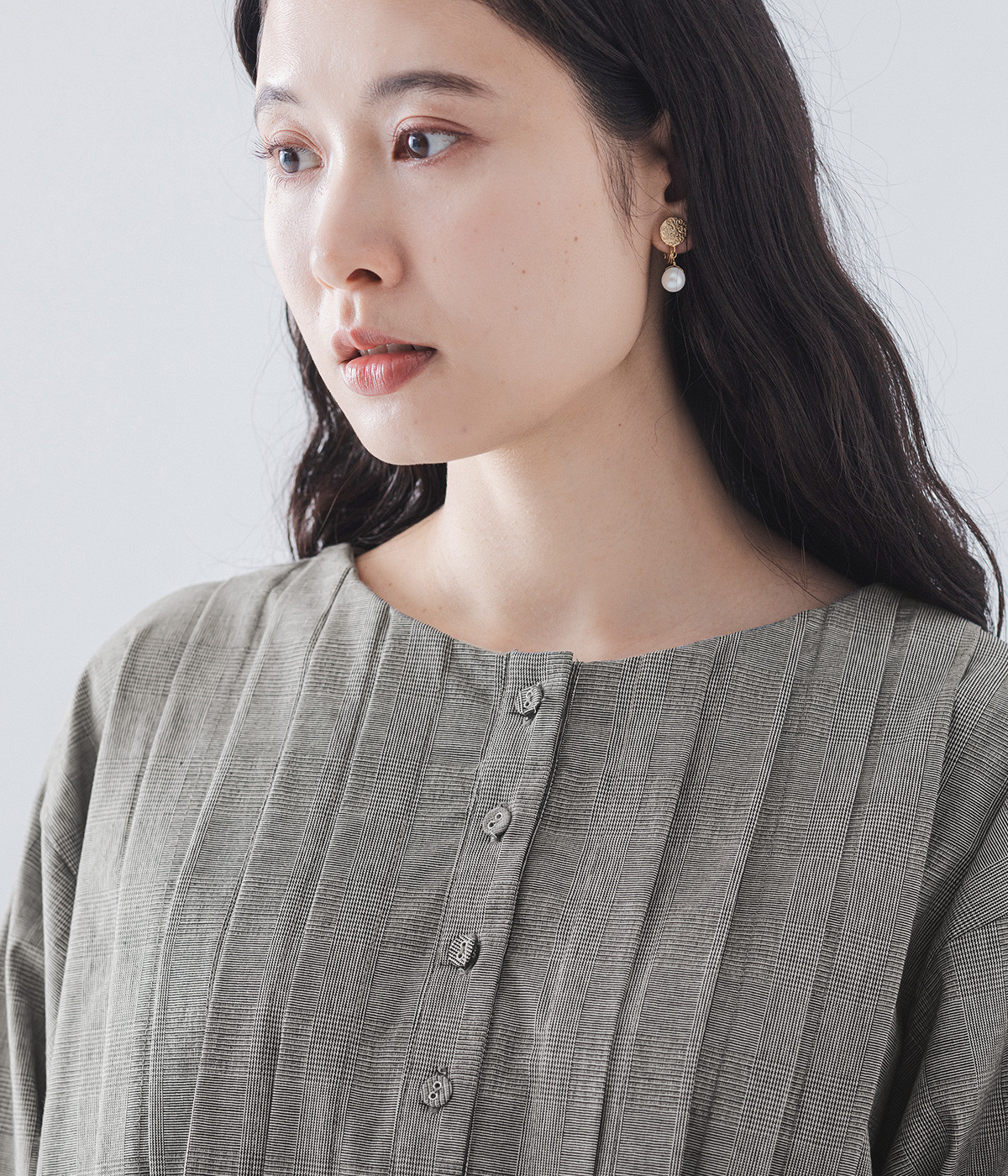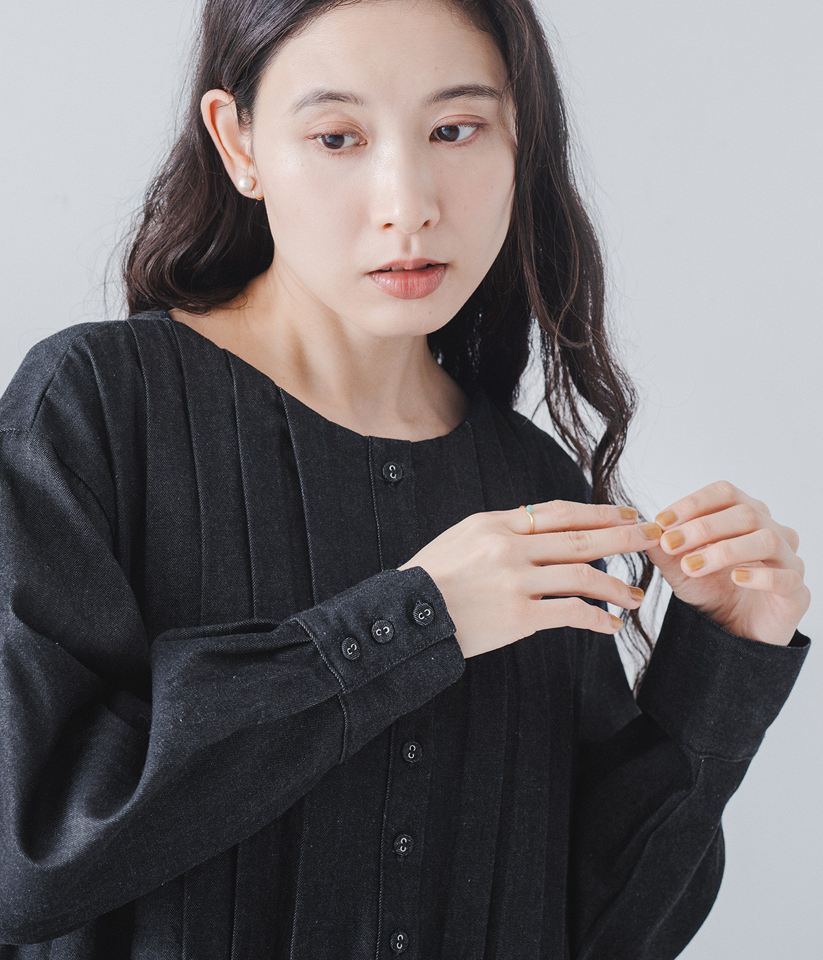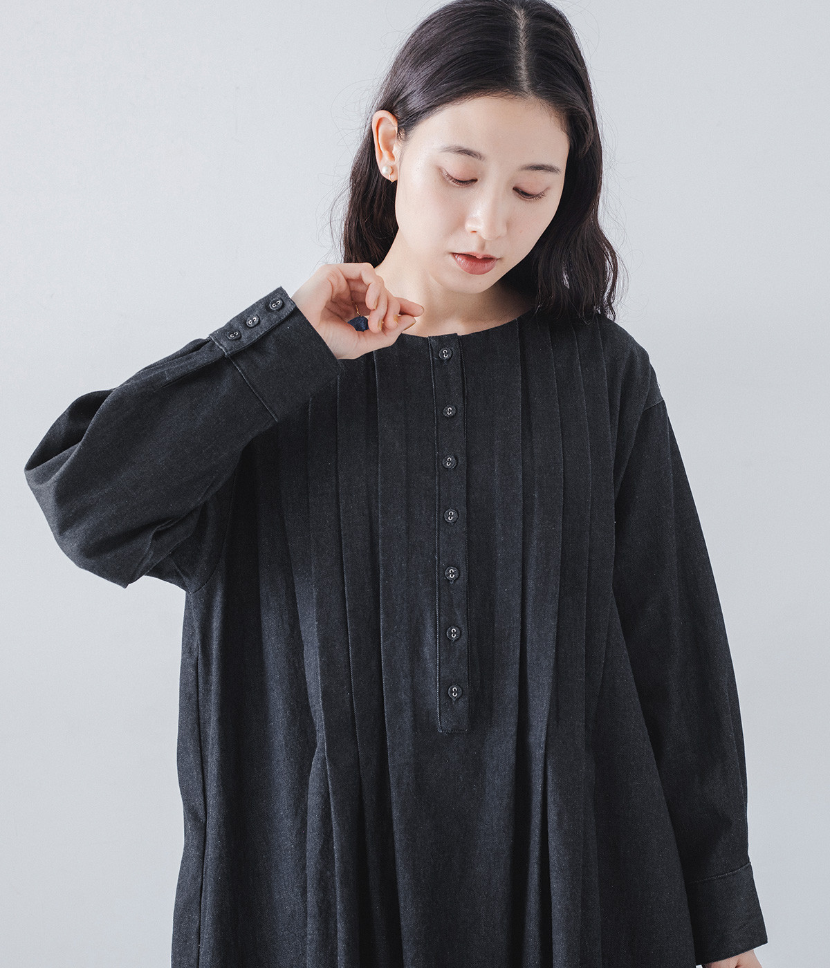 胸元をキャッチーに印象づけるヘンリーネック