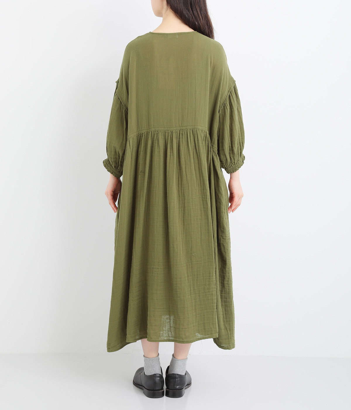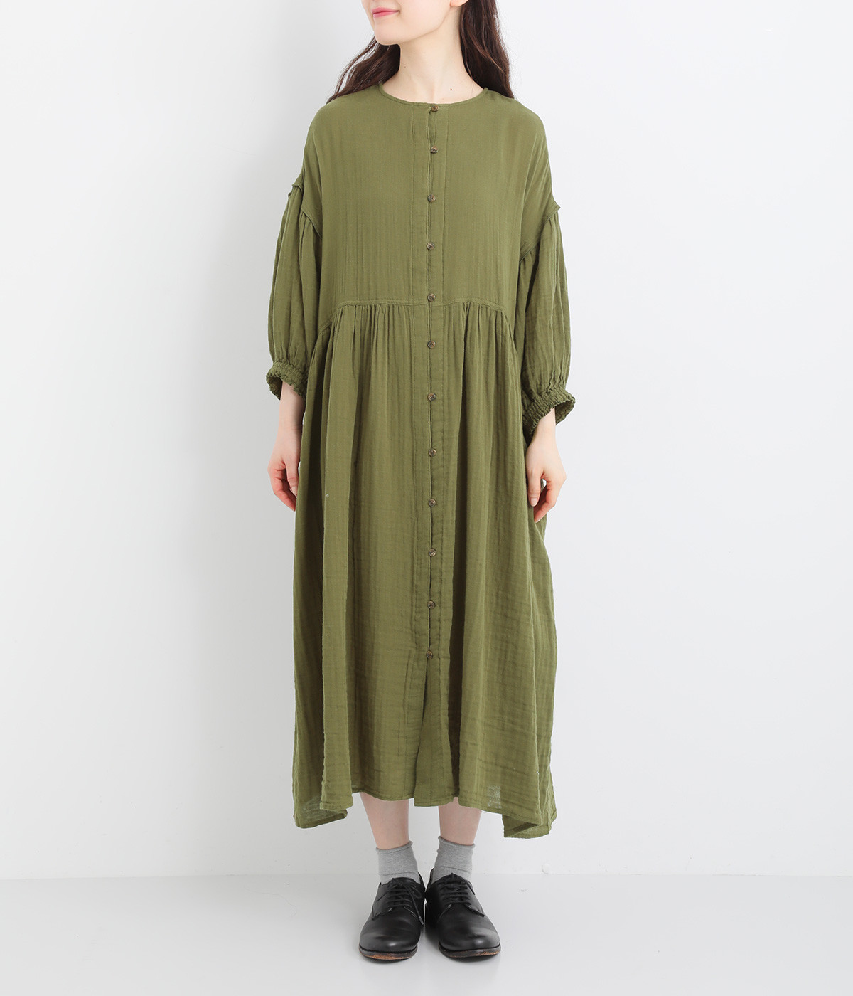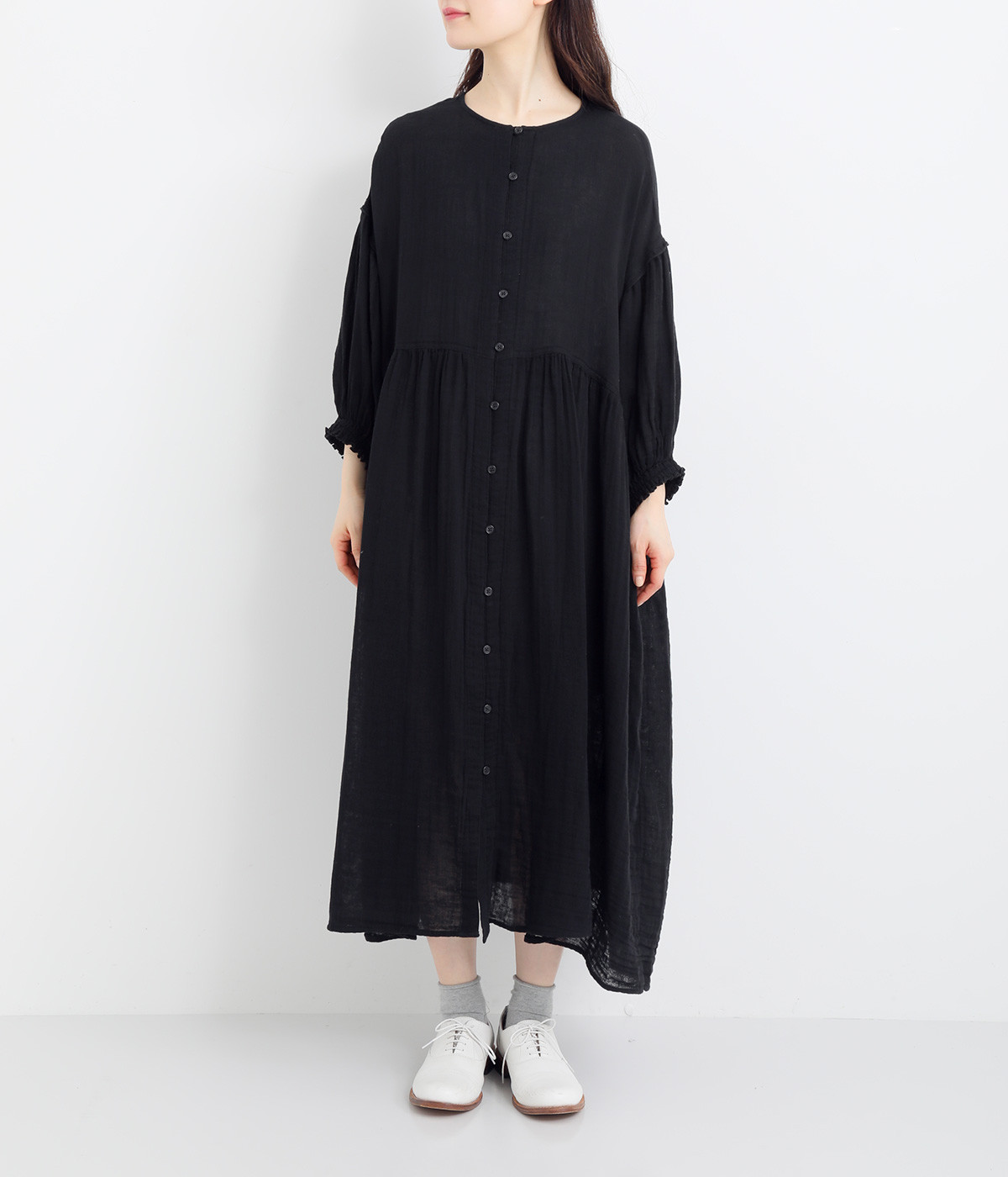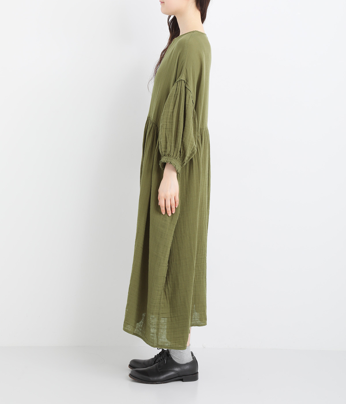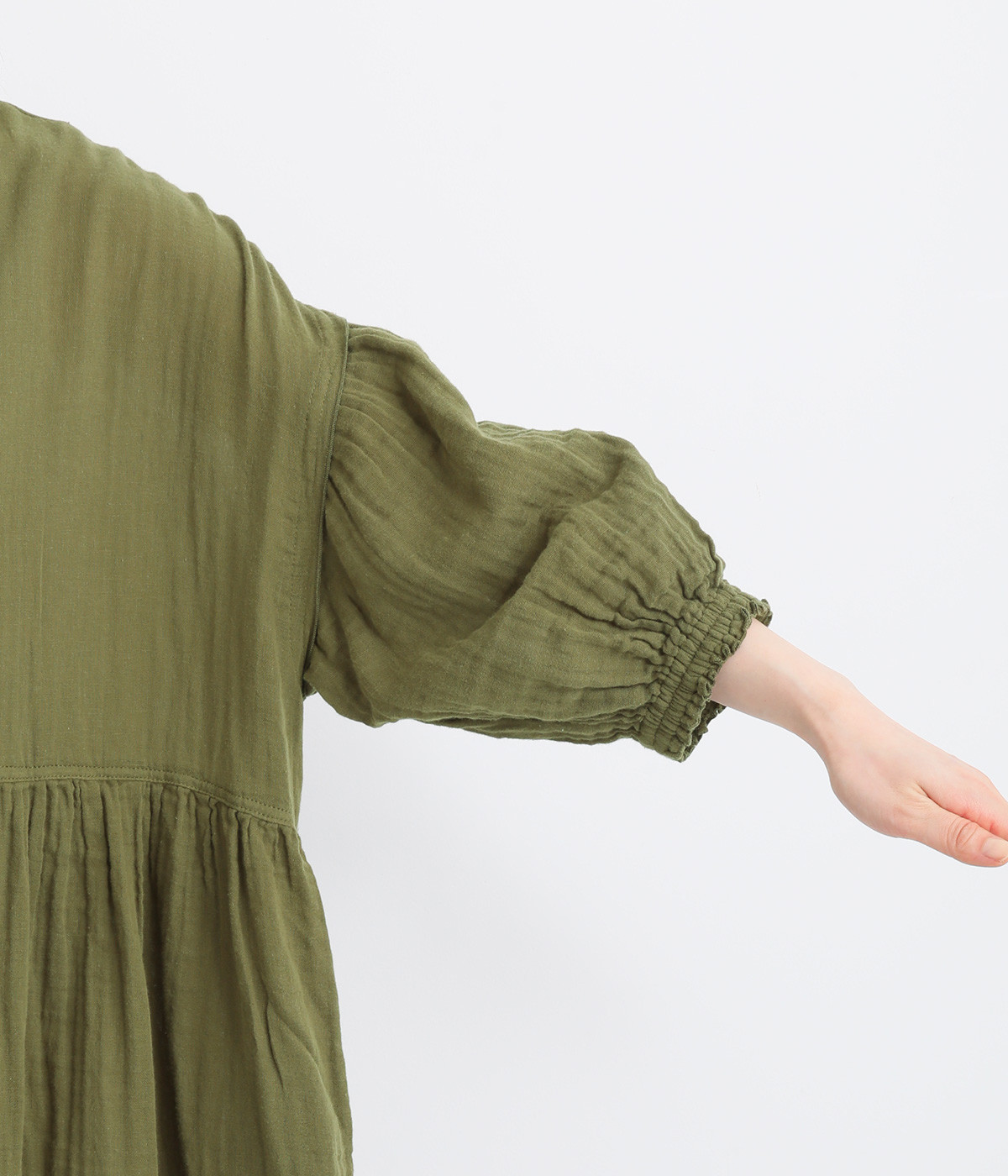 ウエスト切り替え下にギャザーをたっぷりと入れて生地の持つ風合いを活かしたワンピースです。立体感のあるバルーンスリーブは袖口ゴムシャーリングでメリハリをつけました。前をあけた羽織りスタイルもおすすめです。