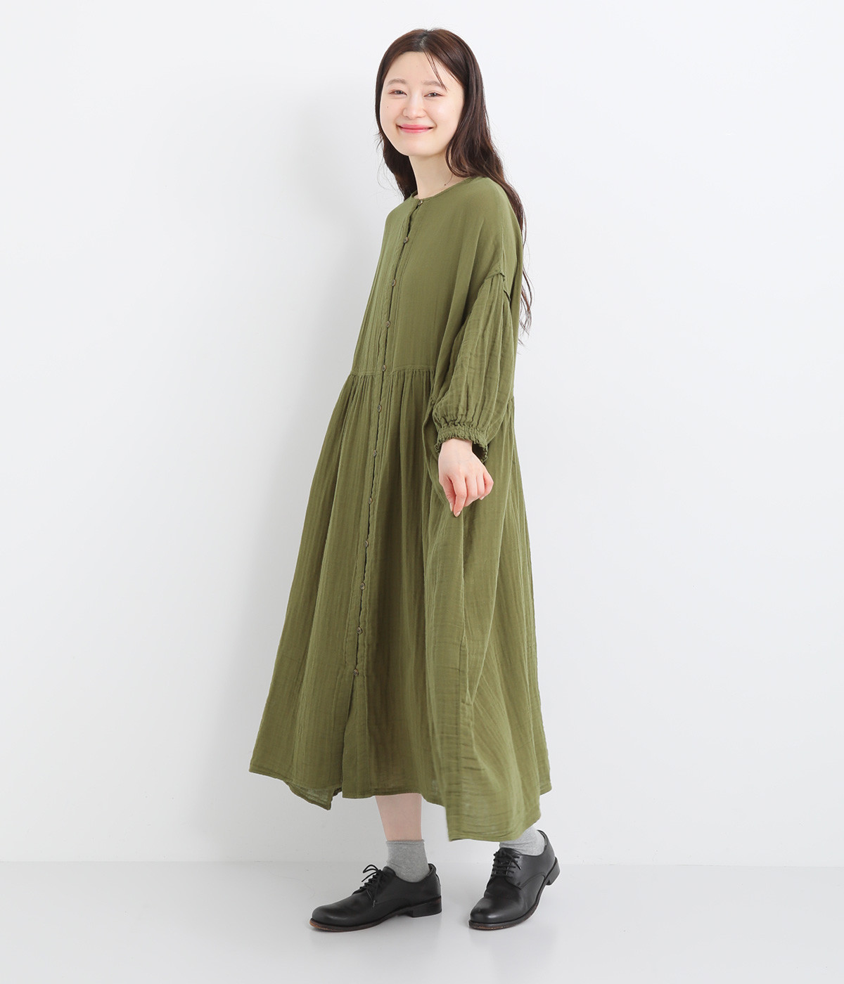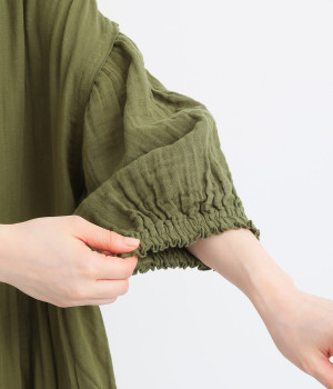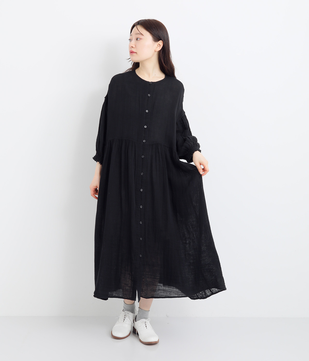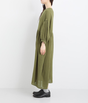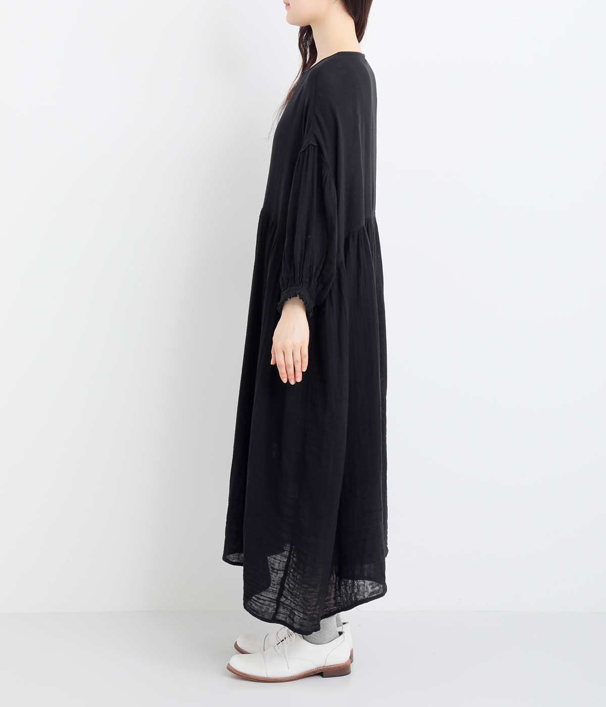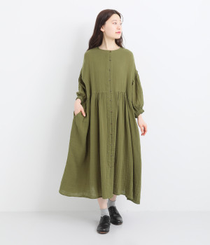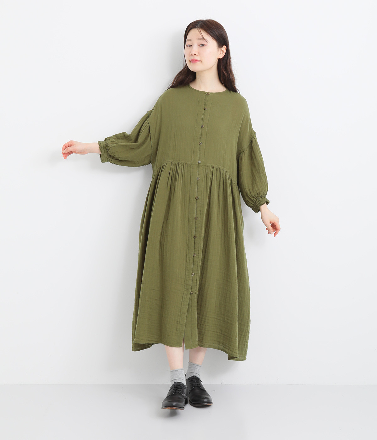ウエスト切り替え下にギャザーをたっぷりと入れて生地の持つ風合いを活かしたワンピースです。立体感のあるバルーンスリーブは袖口ゴムシャーリングでメリハリをつけました。前をあけた羽織りスタイルもおすすめです。