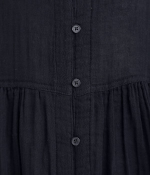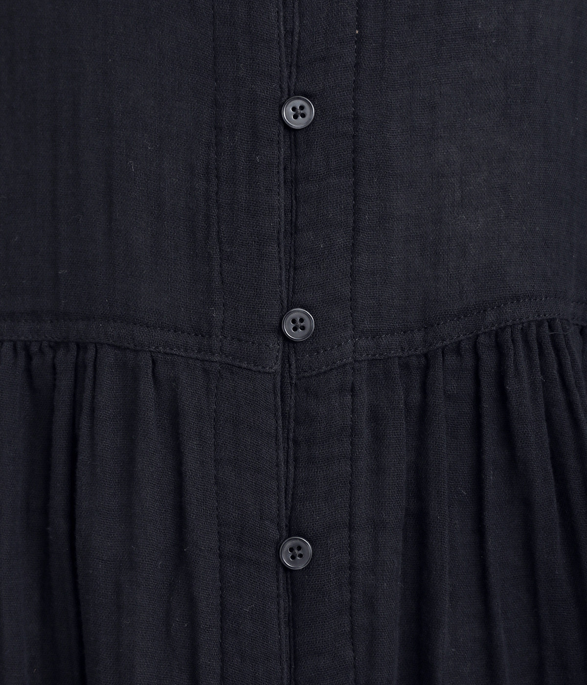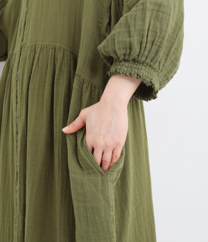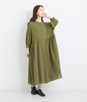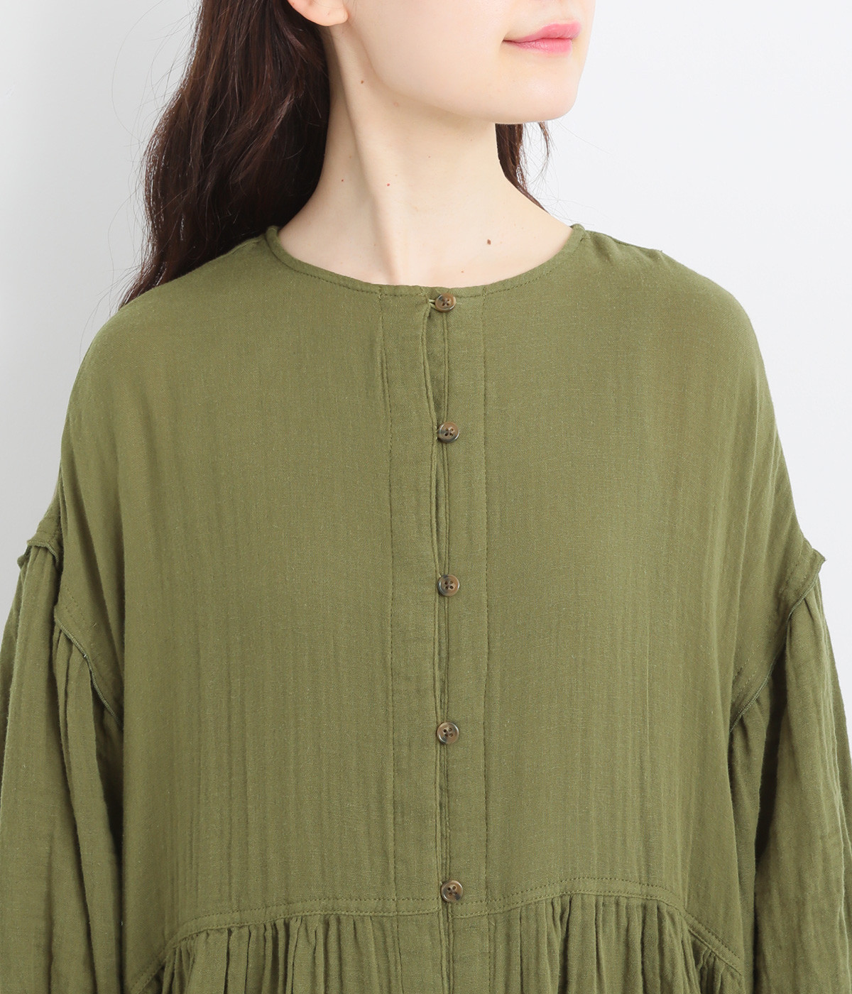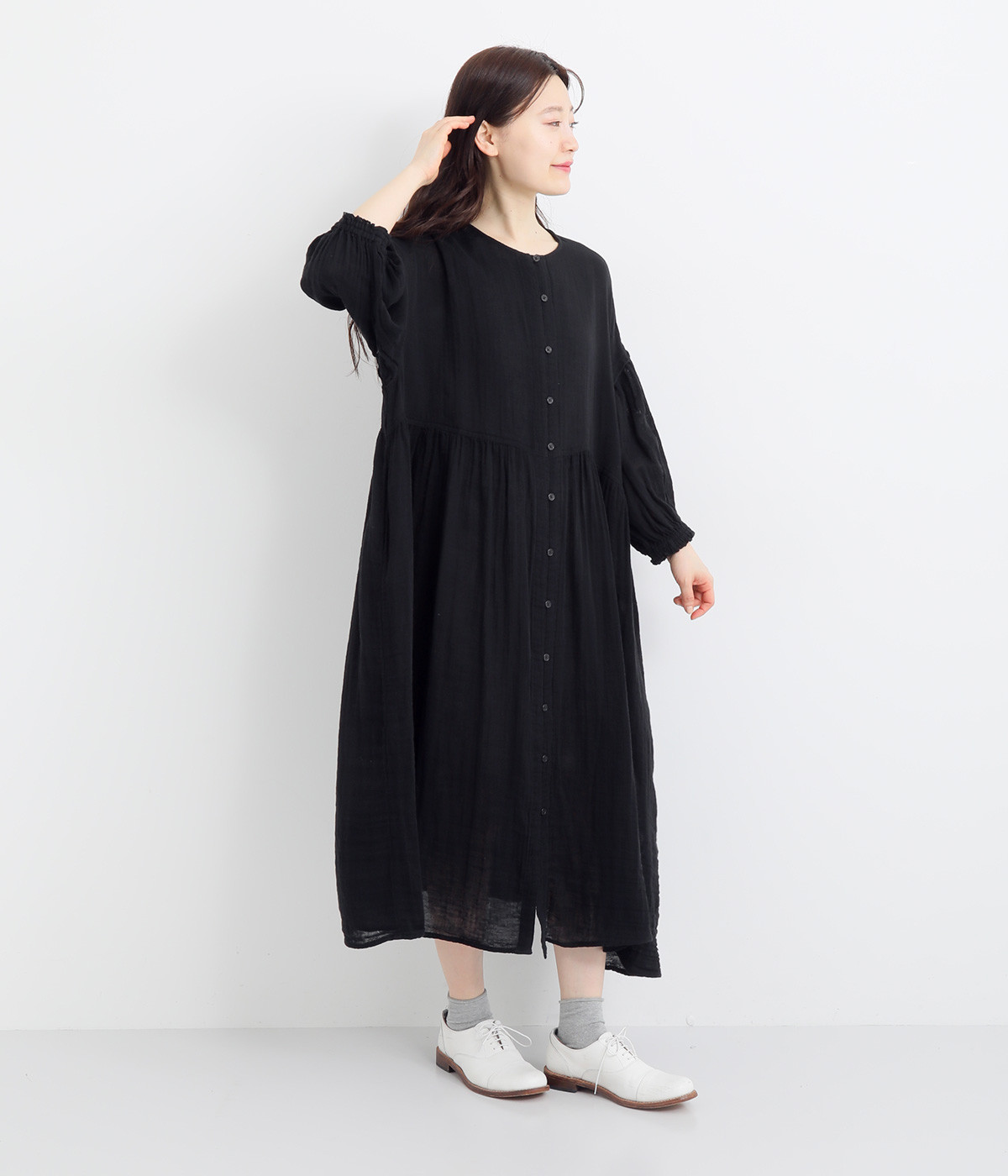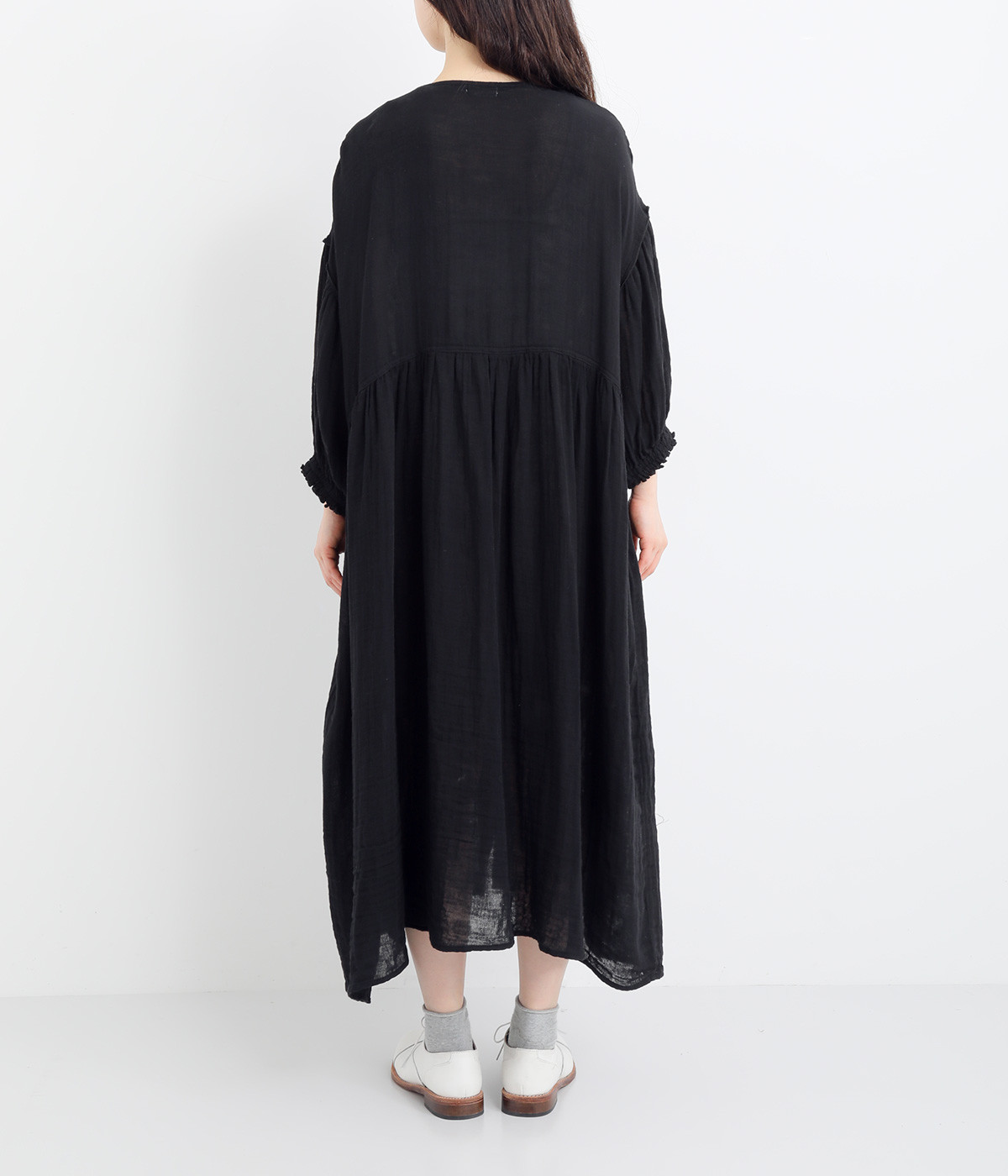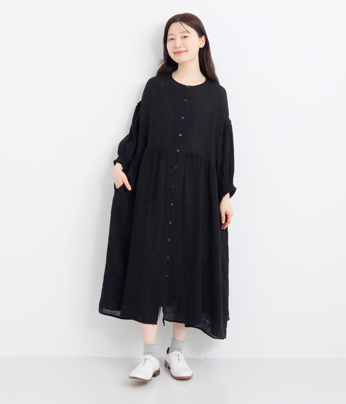 ウエスト切り替え下にギャザーをたっぷりと入れて生地の持つ風合いを活かしたワンピースです。立体感のあるバルーンスリーブは袖口ゴムシャーリングでメリハリをつけました。前をあけた羽織りスタイルもおすすめです。