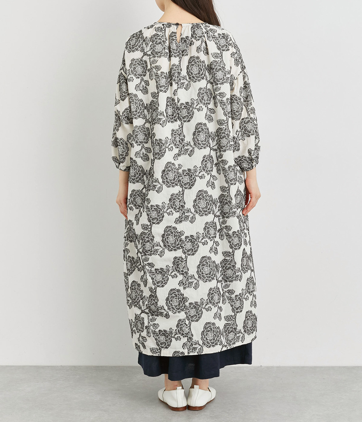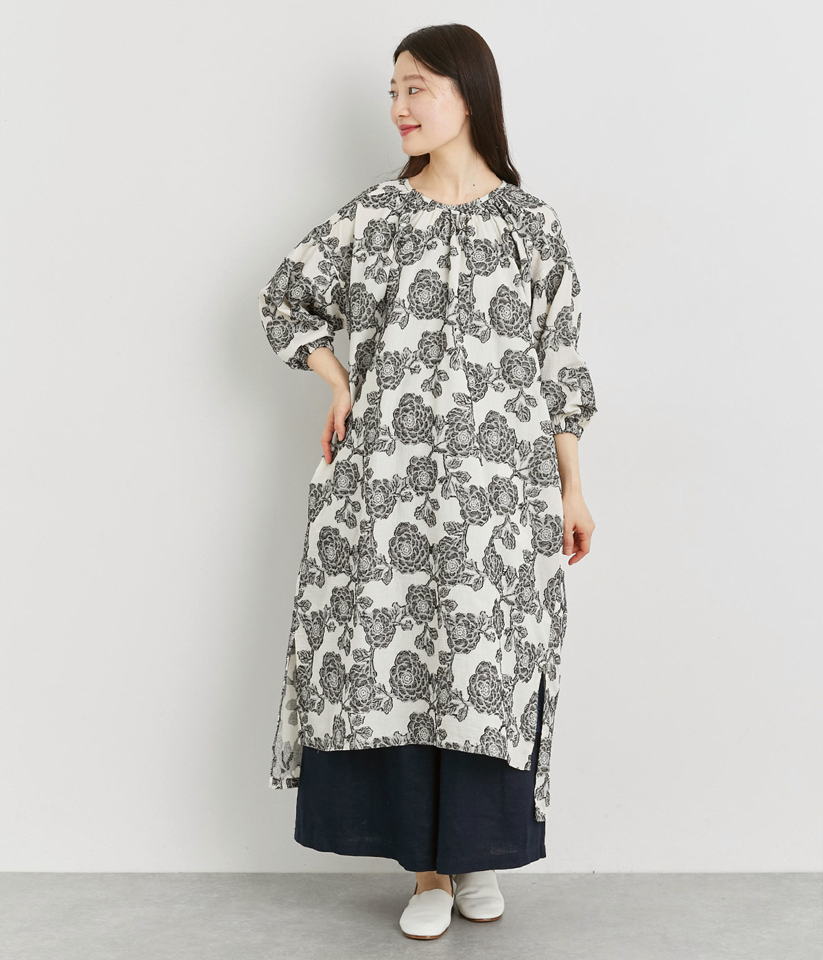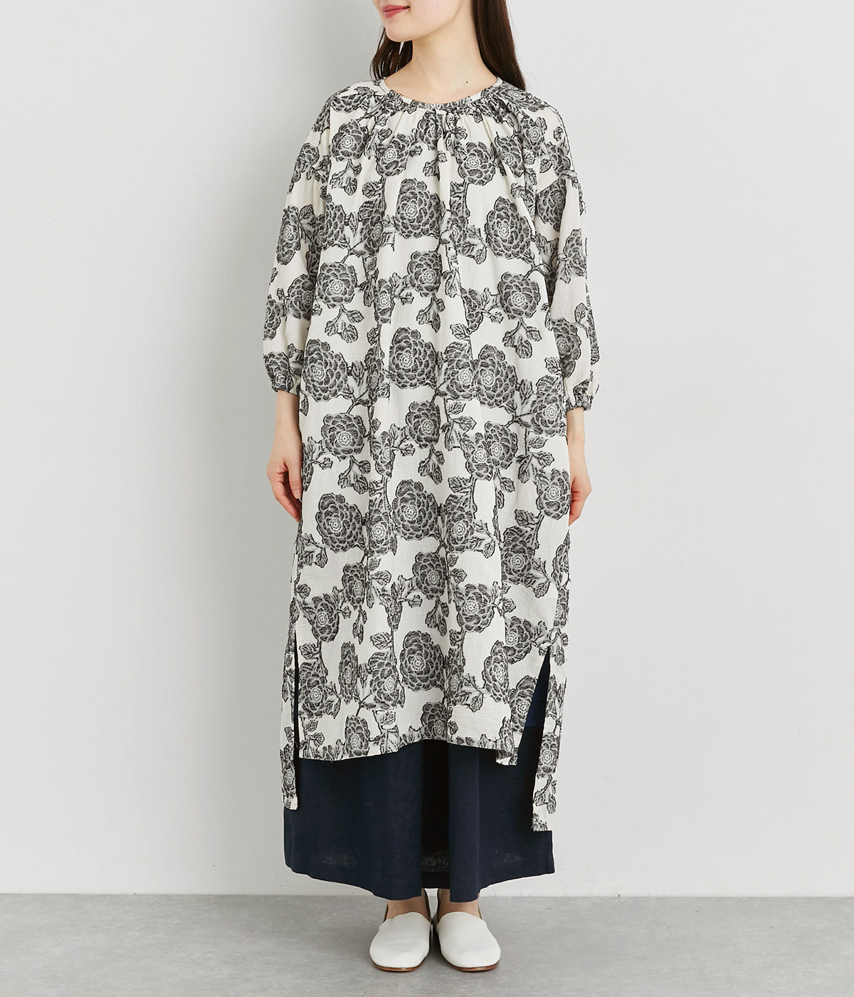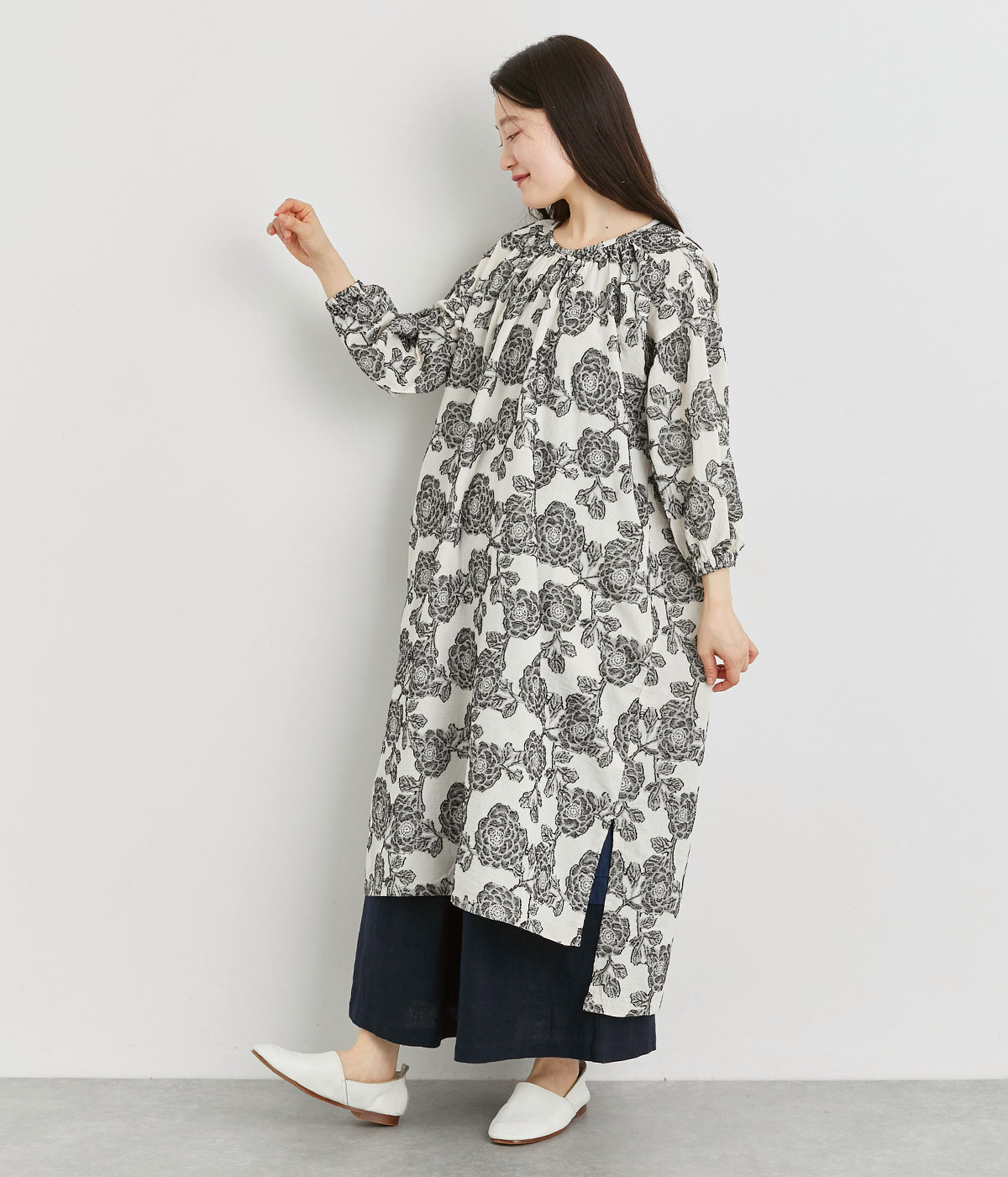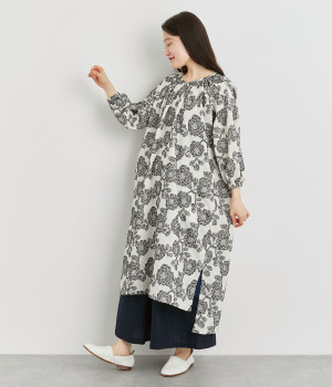 大胆な柄が目を惹き、一枚着でも存在感のあるワンピースです。前襟ぐりのギャザーやステッチ、肩のヨークがポイントになっています。サイドにスリットが入っているのでパンツとのレイヤードもおすすめです。