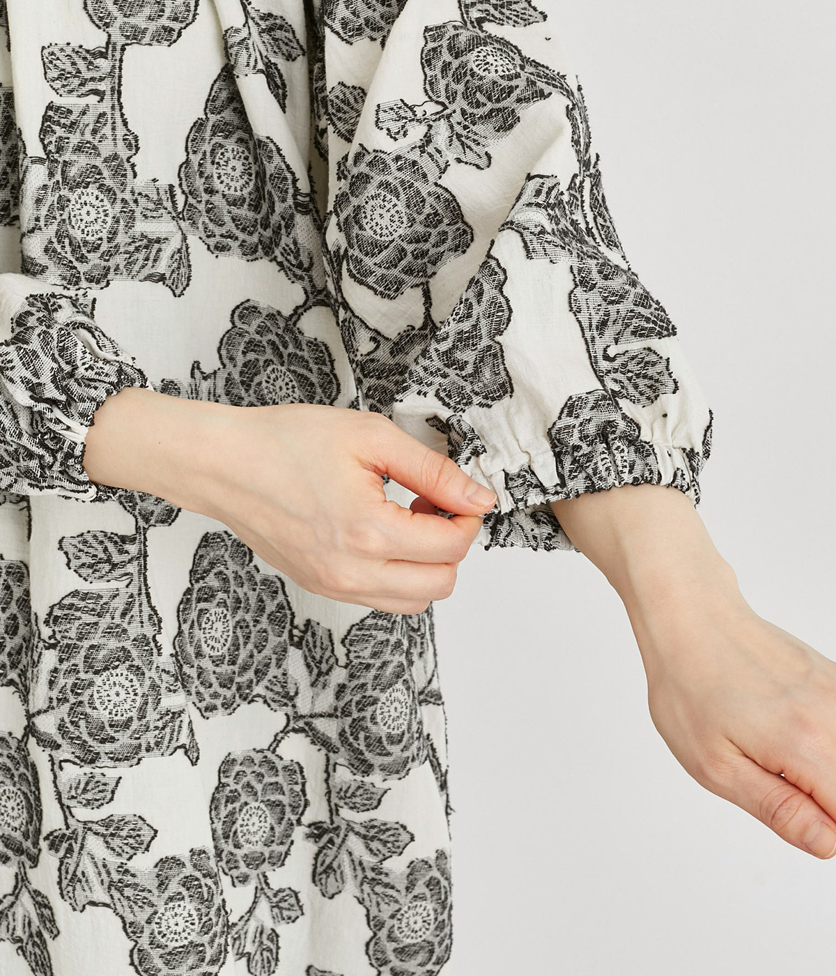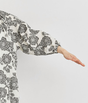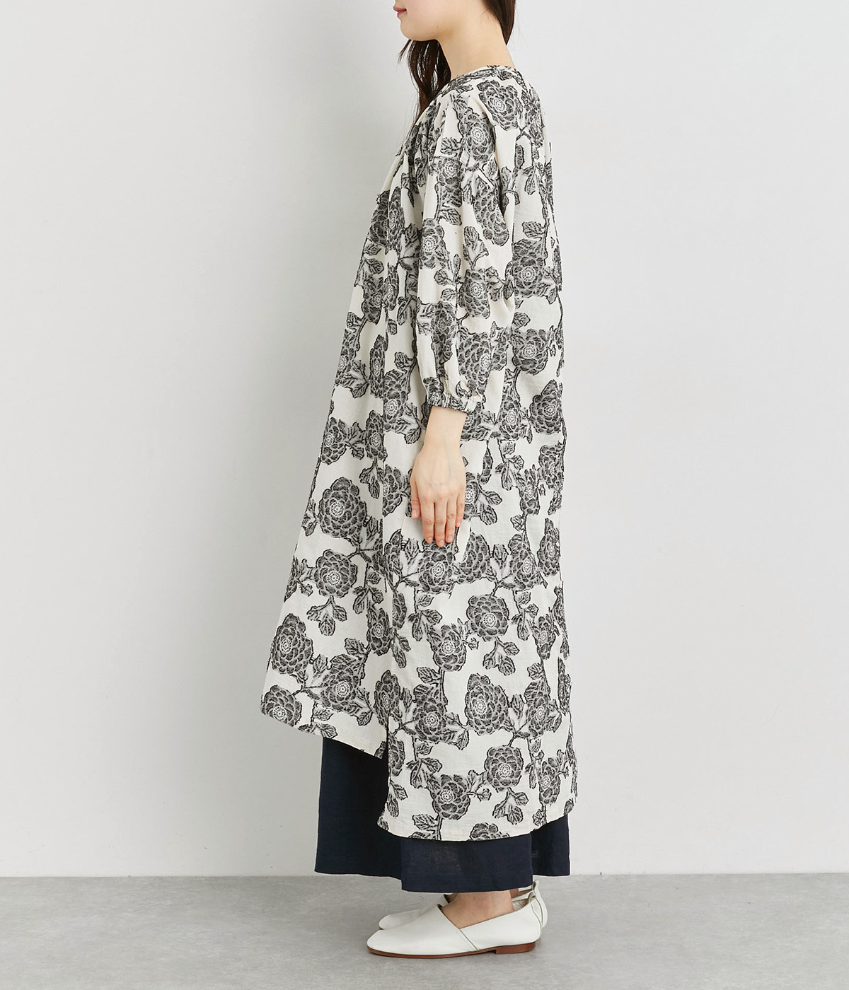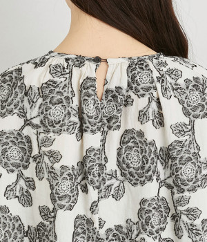 立体感のある花柄がモダンで目を惹くジャカード織の総柄生地を使用しました。肌離れのいいさらりとした素材が心地よく、着こなししだいでロングシーズン活躍します。