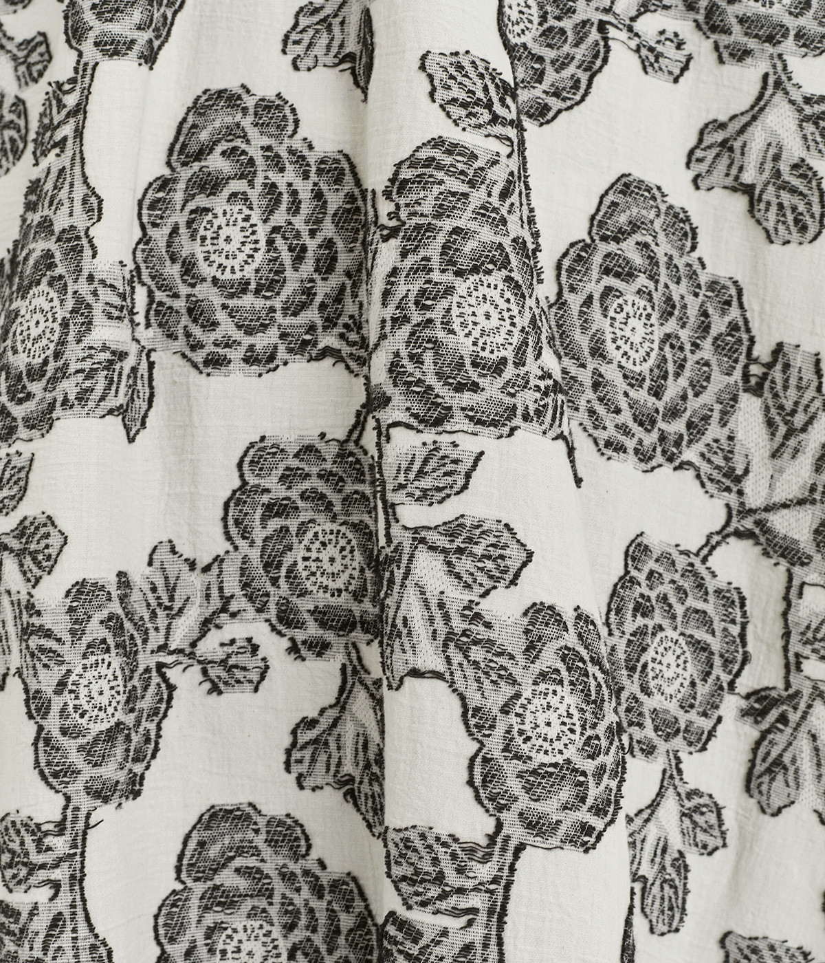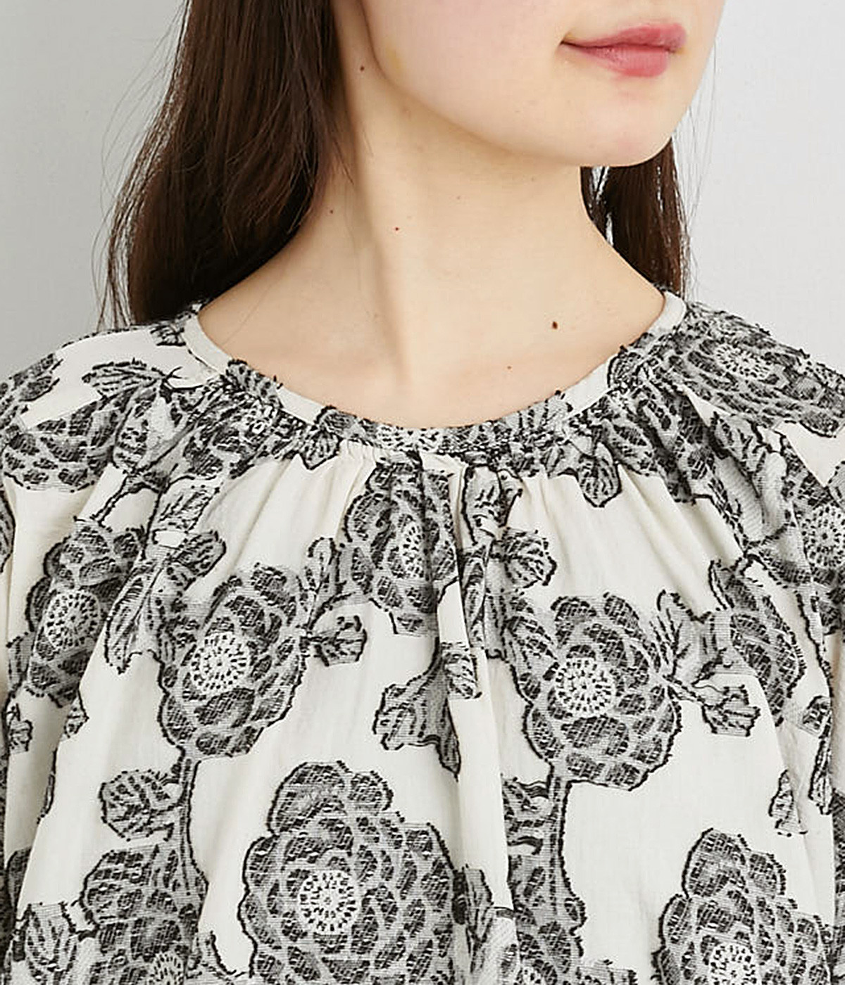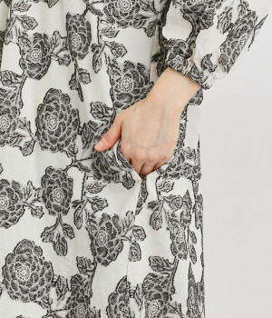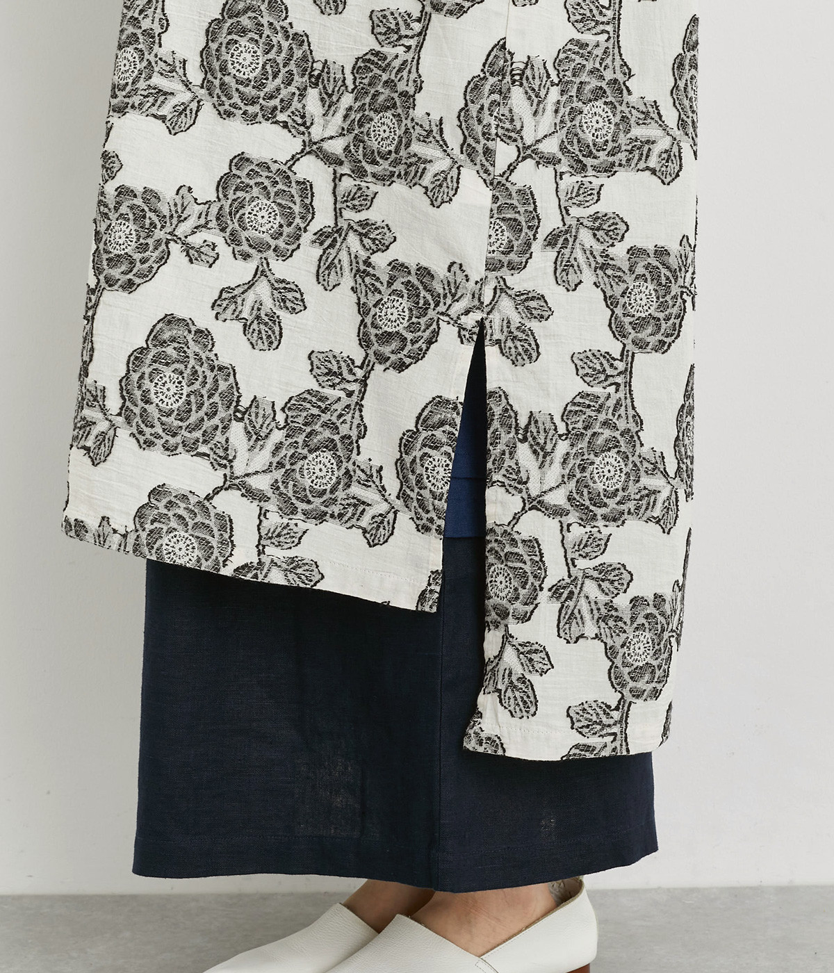 立体感のある花柄がモダンで目を惹くジャカード織の総柄生地を使用しました。肌離れのいいさらりとした素材が心地よく、着こなししだいでロングシーズン活躍します。