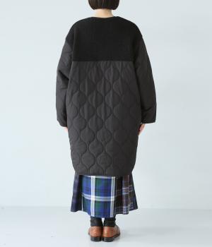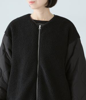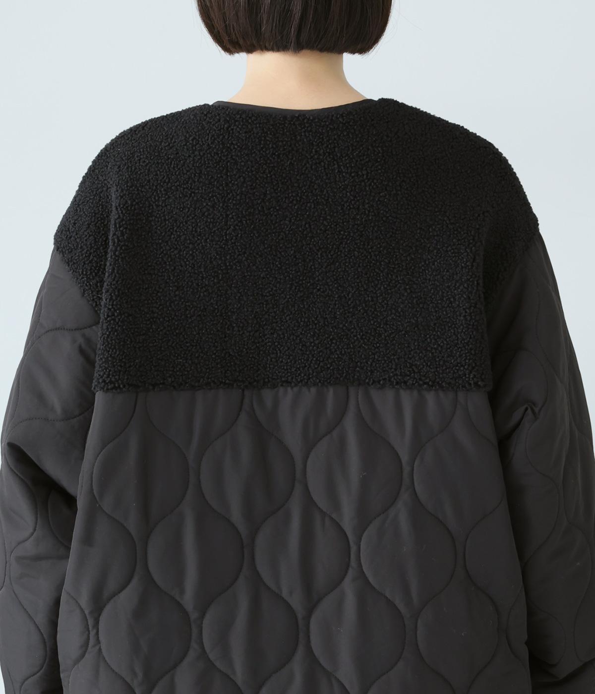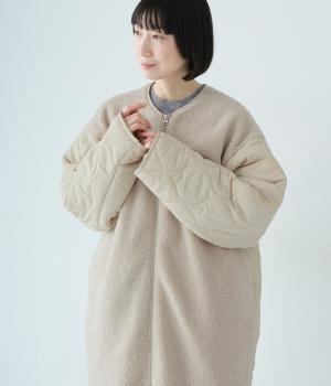 身頃にボア生地を使って、見た目も着心地もあたたかく仕上げた一枚。袖はひょうたん柄のキルティング生地で、すっきりとした印象に仕上げています。軽くて保温性のある中綿素材で、ストレスフリーに過ごすことができます。