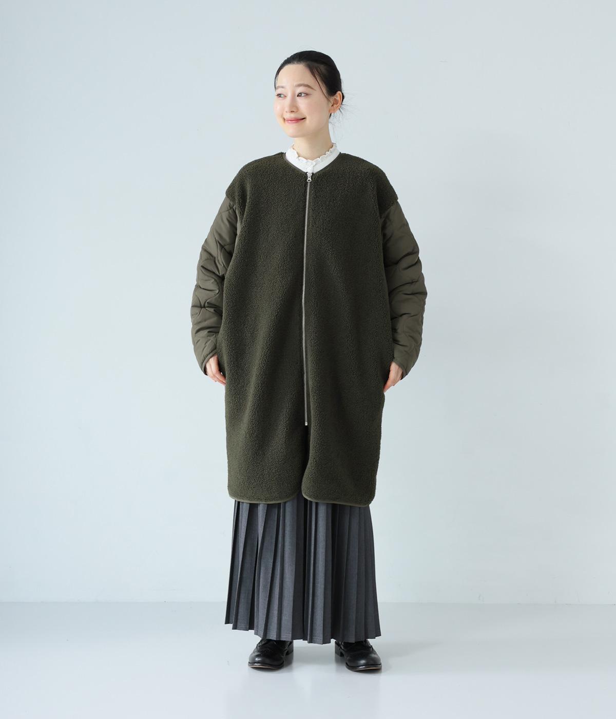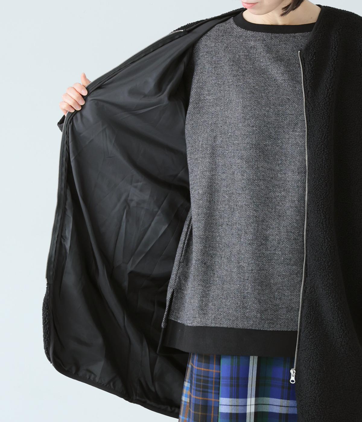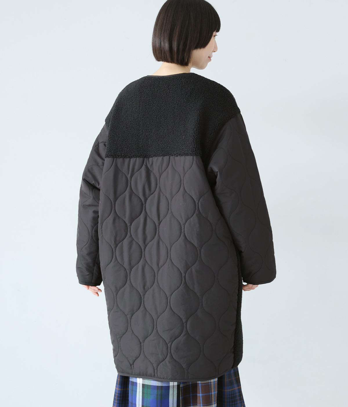 ノーカラーにフロントファスナーの洗練されたルックスで、大人のカジュアルスタイルにおすすめのコートです。ボア×キルティングで、シンプルながらも存在感たっぷり。裾は動きやすいラウンドカットのデザインです。