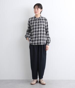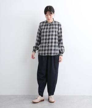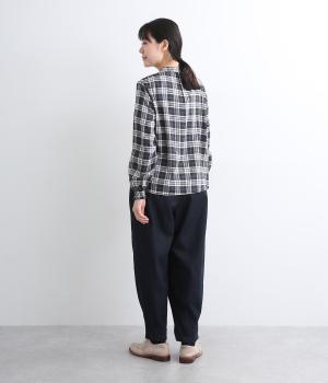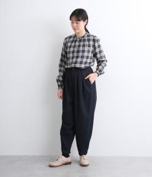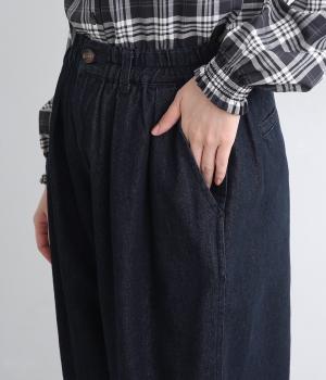 ゆったりとしたワイドシルエットで、脚のラインやヒップ、腰まわりまでカバー。裾のダーツがもたつきを抑え、すっきりとしたシルエットを作ってくれます。ウエストはボタンとジップに加え、総ゴム仕様で着心地も快適です。