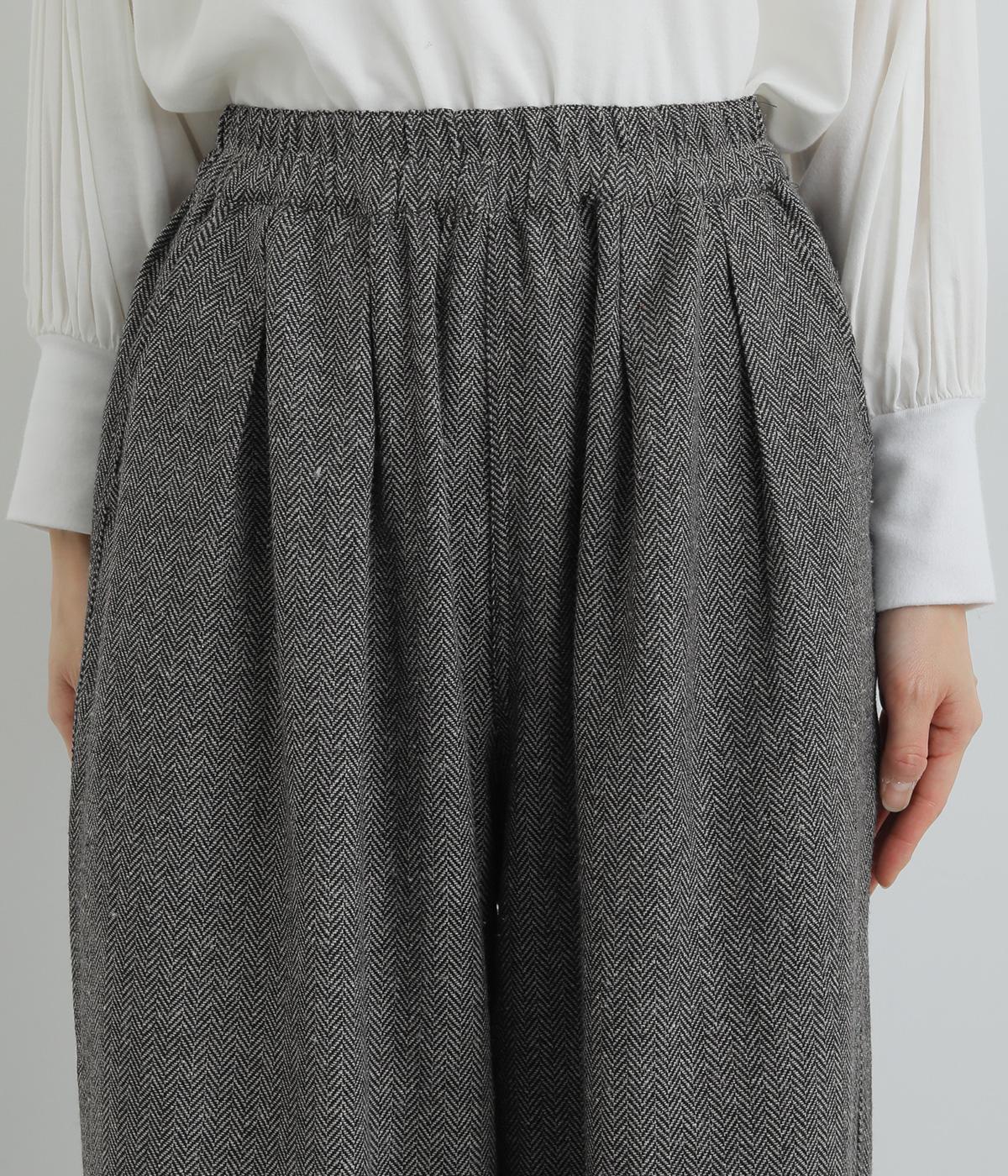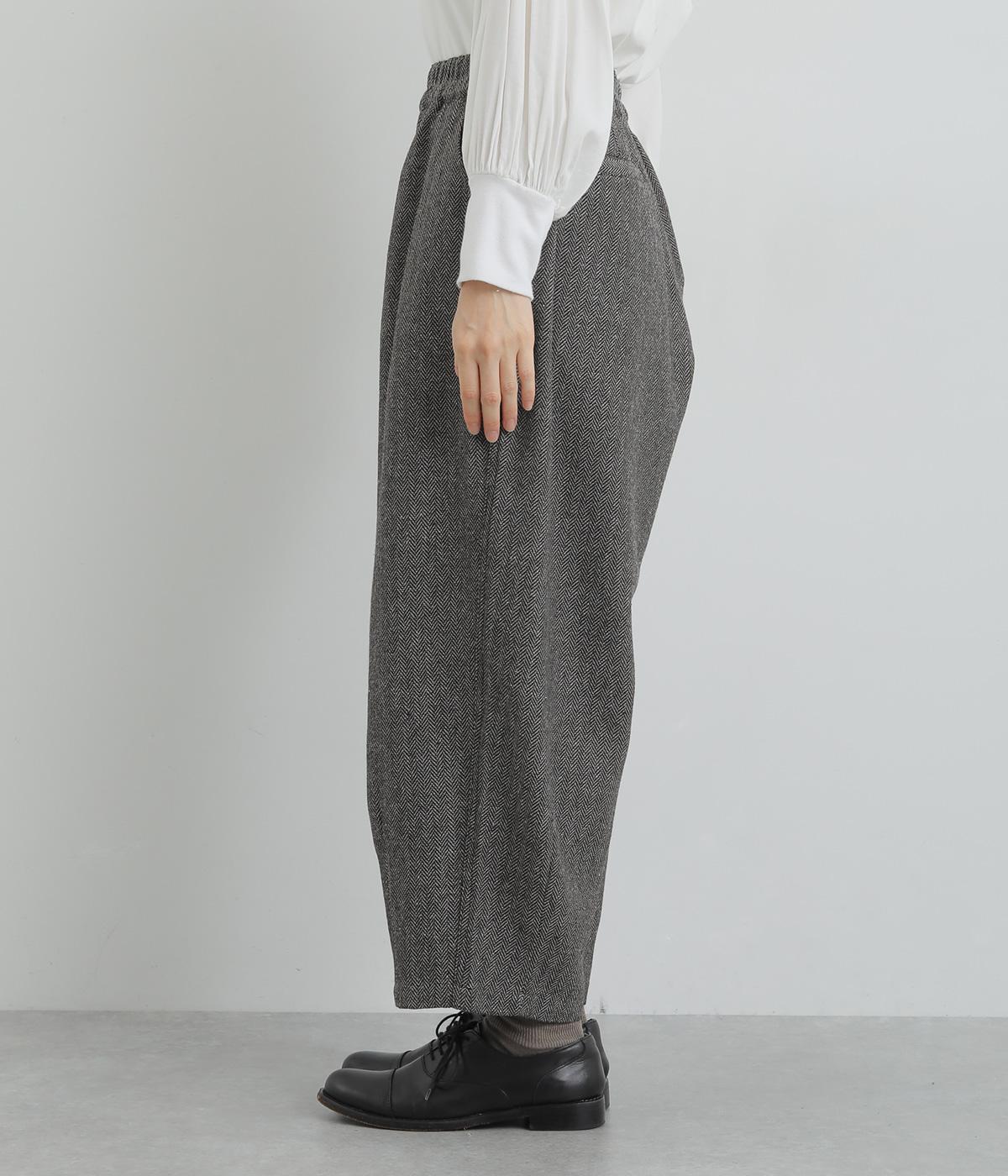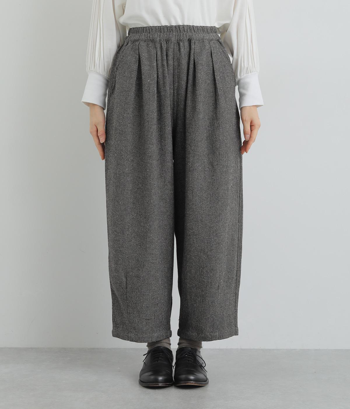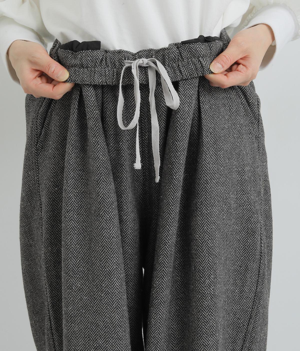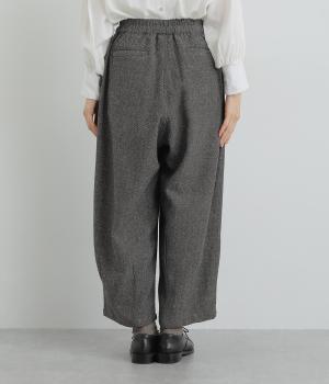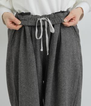 前ウエストにタックを、裾にダーツを入れ丸みを持たせたパンツ。体のラインを拾いにくいゆとりがありつつお洒落に見える、計算されたシルエットが魅力です。両サイドとヒップにポケットつき。ウエストは総ゴム仕様で、フィット感を高める内紐をプラスしました。