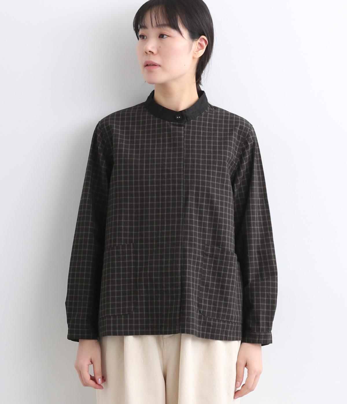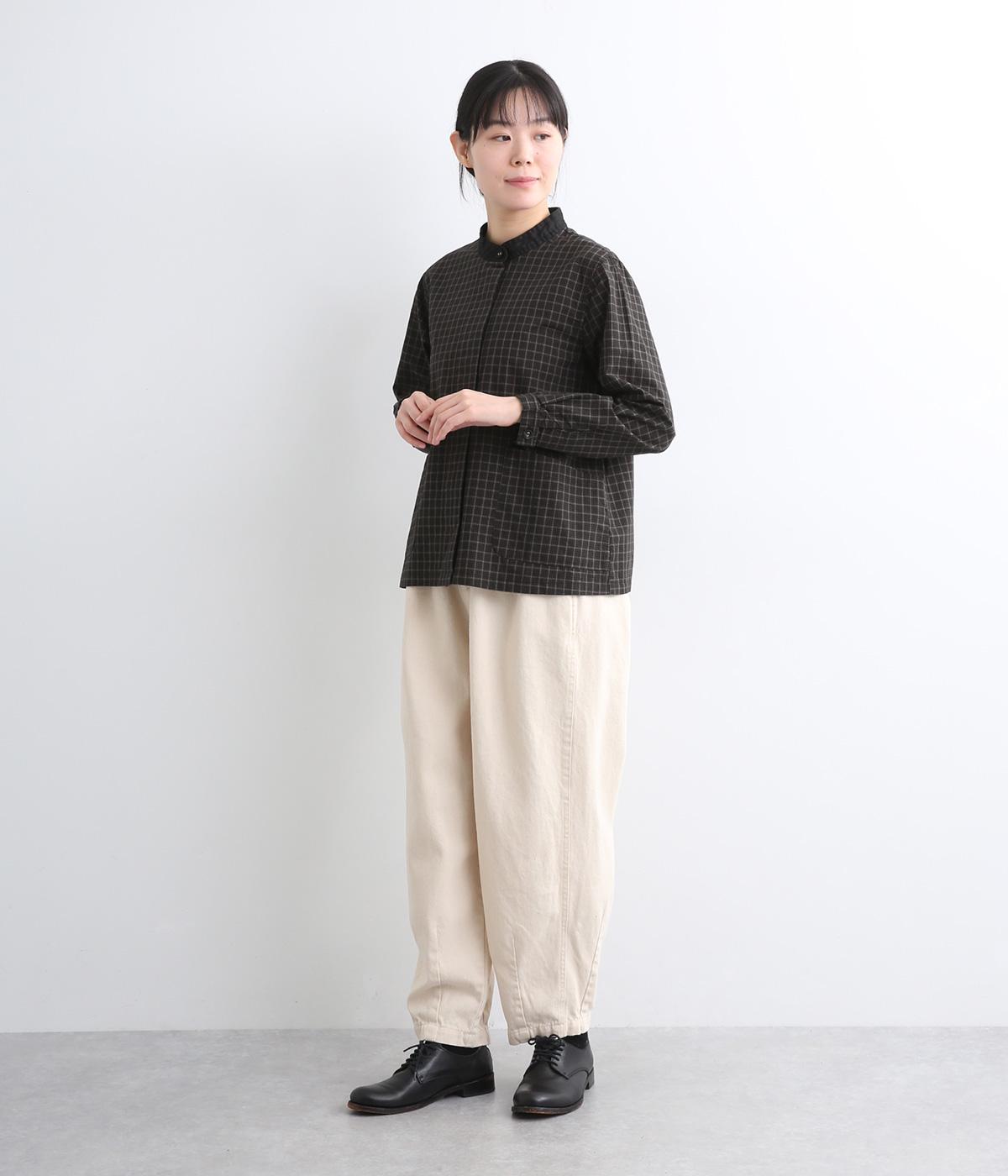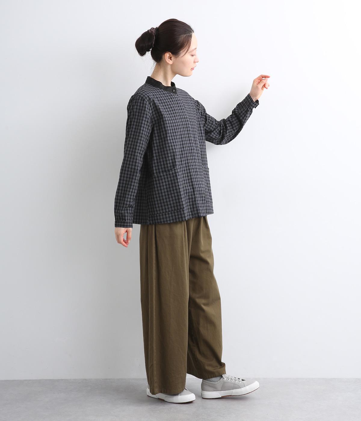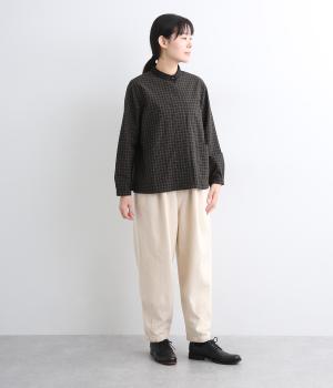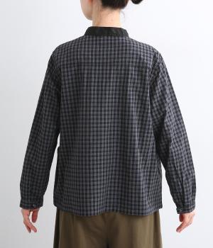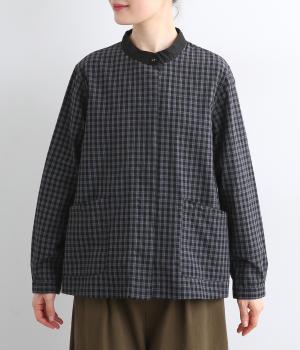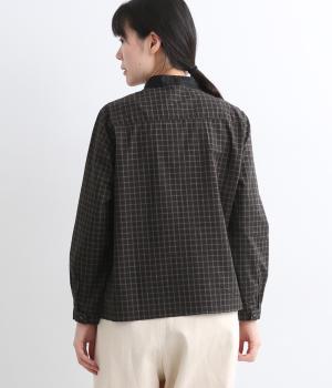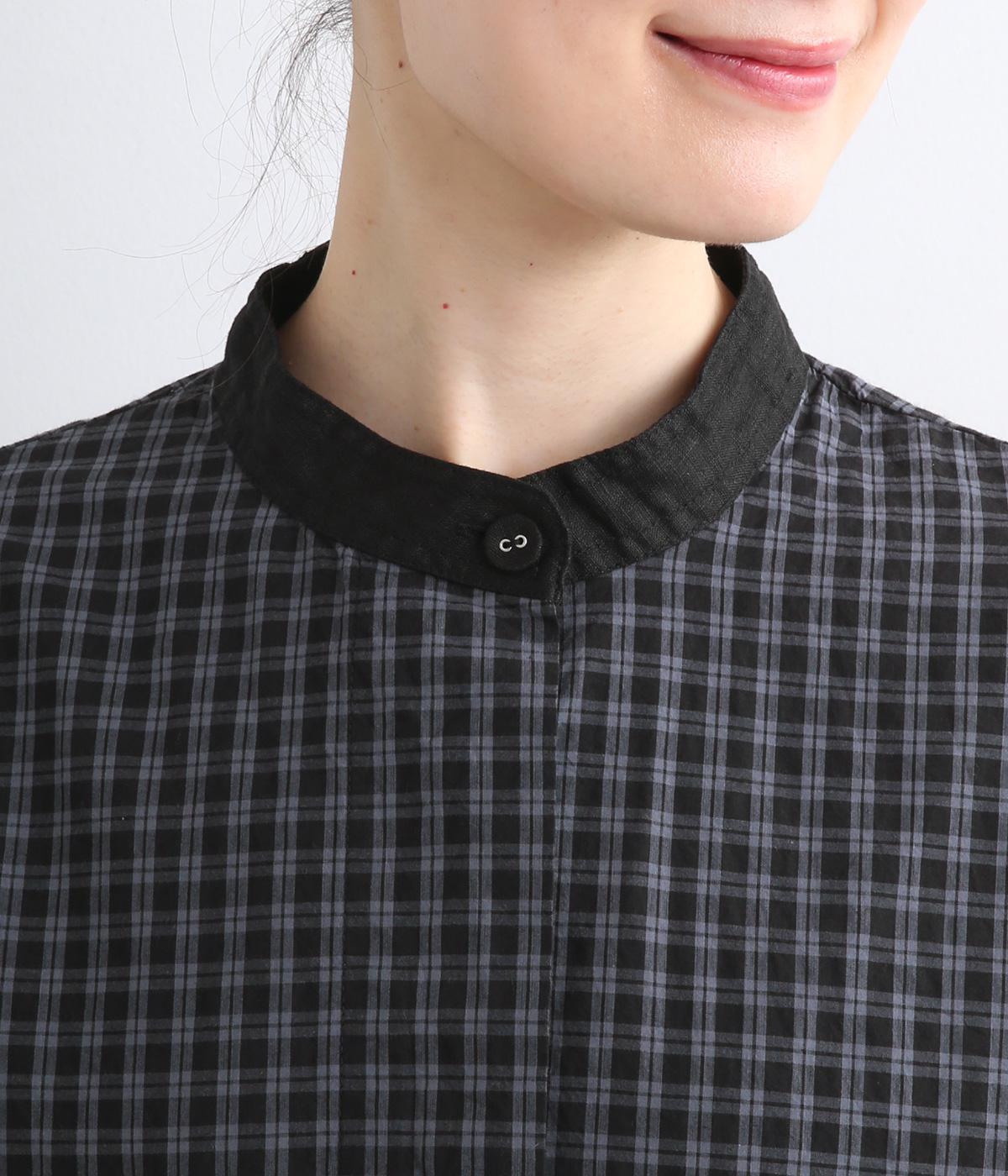 小さいピッチのチェック柄コットン地で仕立てたブラウスは、優しく落ち着いた印象。首元は無地のリネン生地で切り替えられており、配色アクセントになっています。