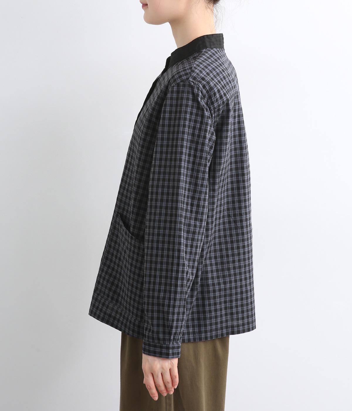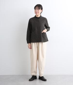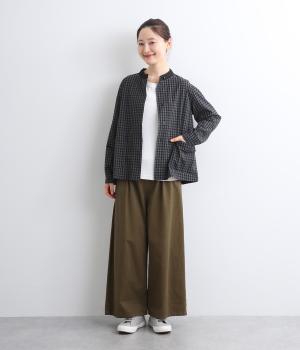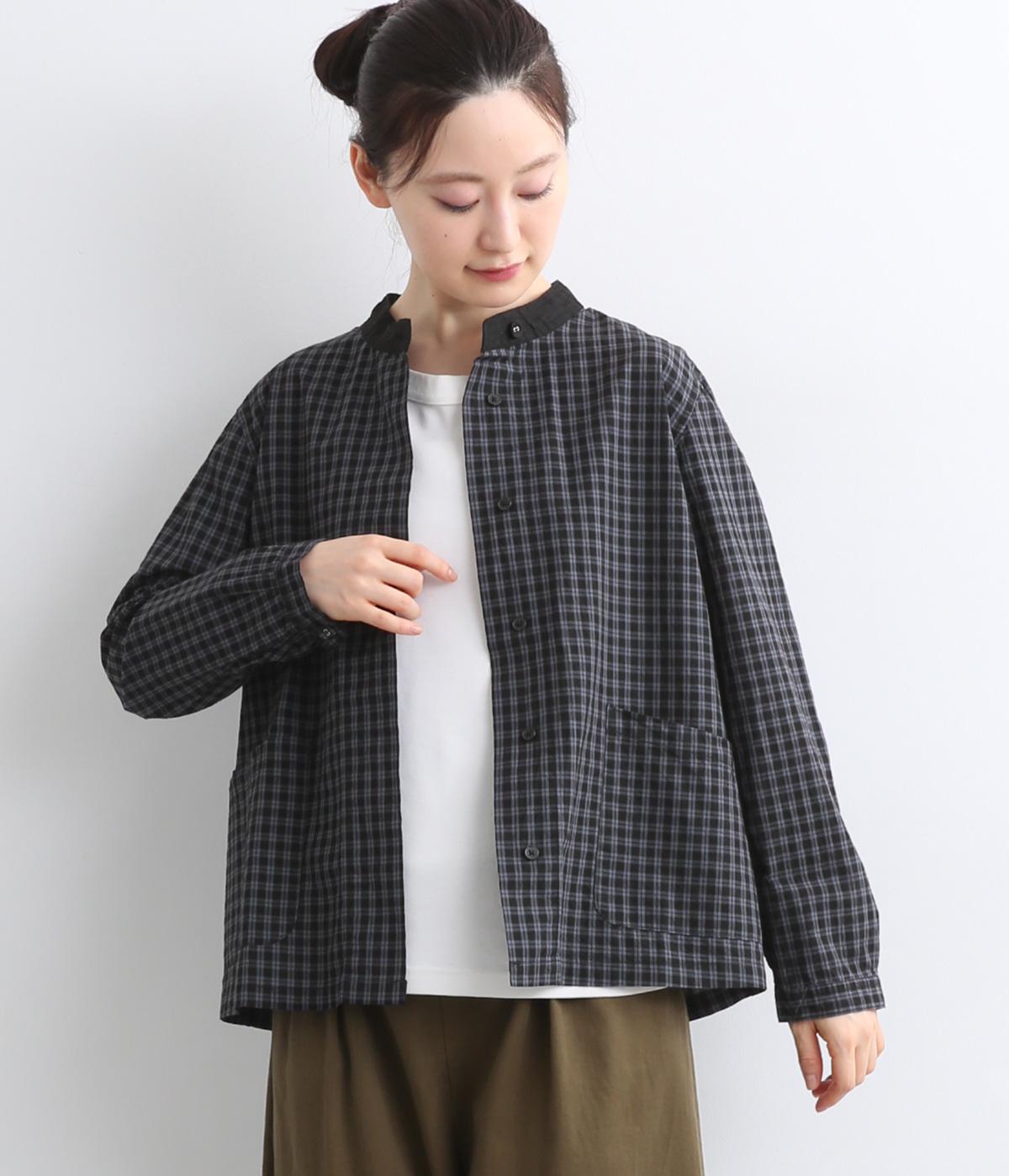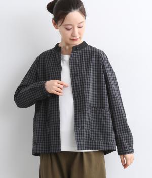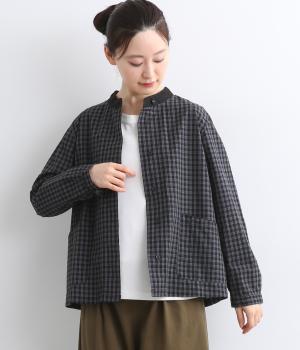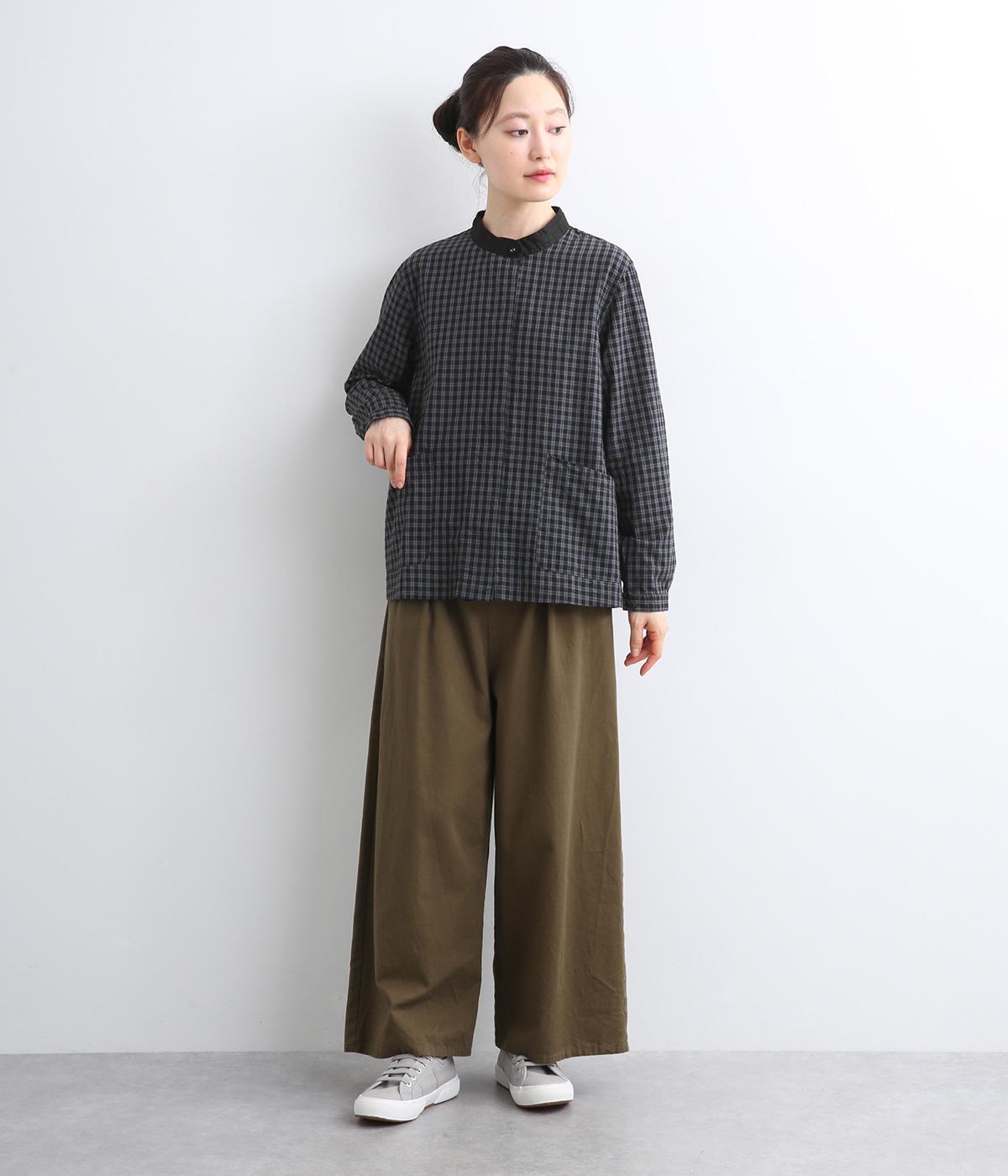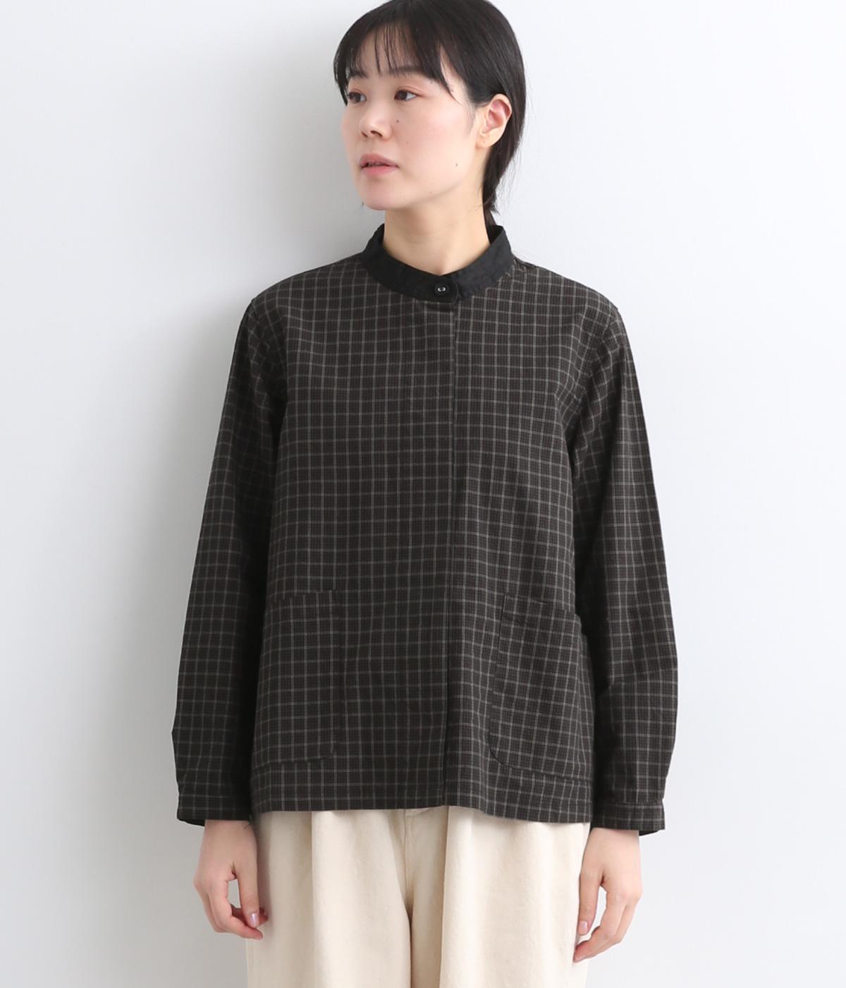 小さいピッチのチェック柄コットン地で仕立てたブラウスは、優しく落ち着いた印象。首元は無地のリネン生地で切り替えられており、配色アクセントになっています。