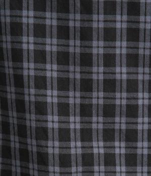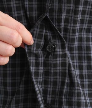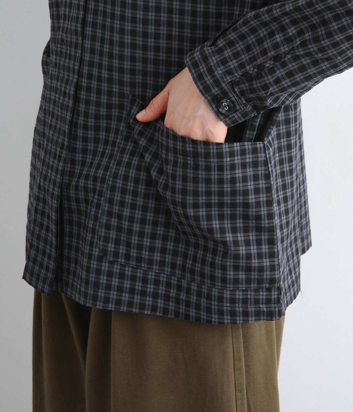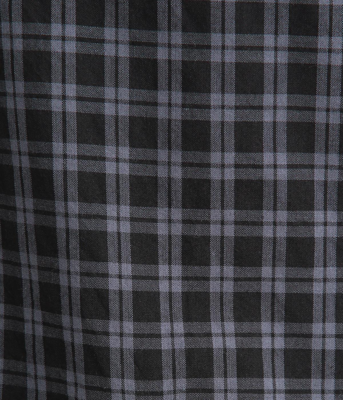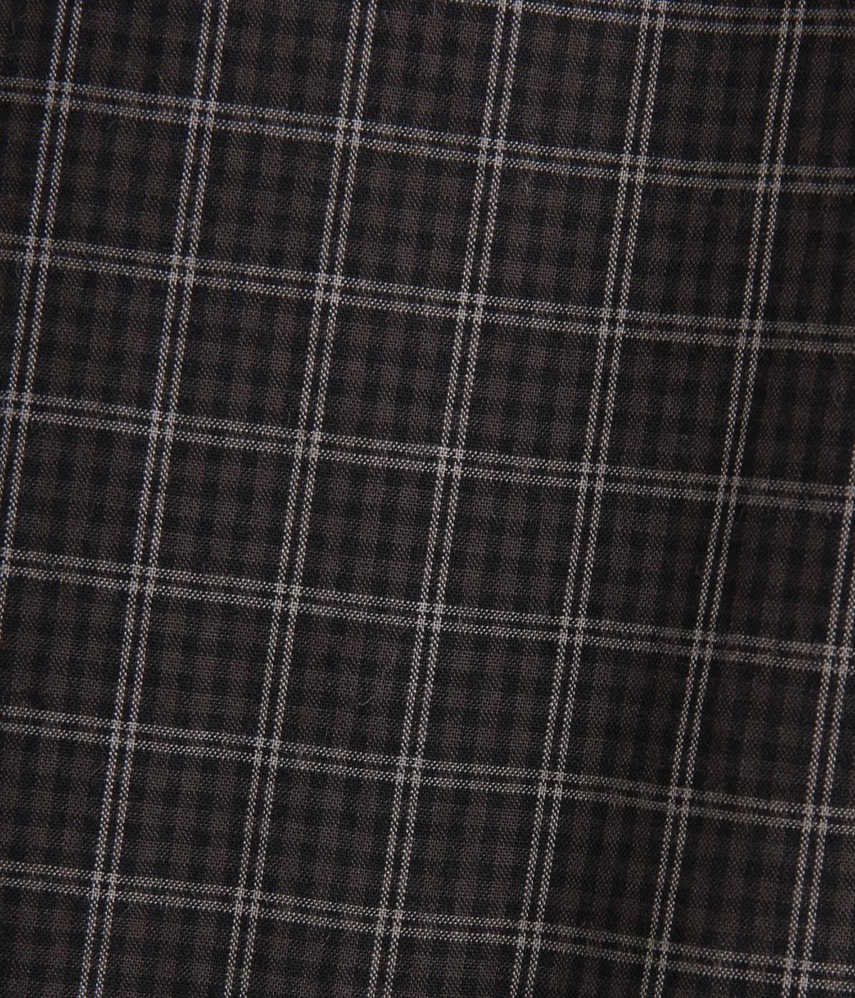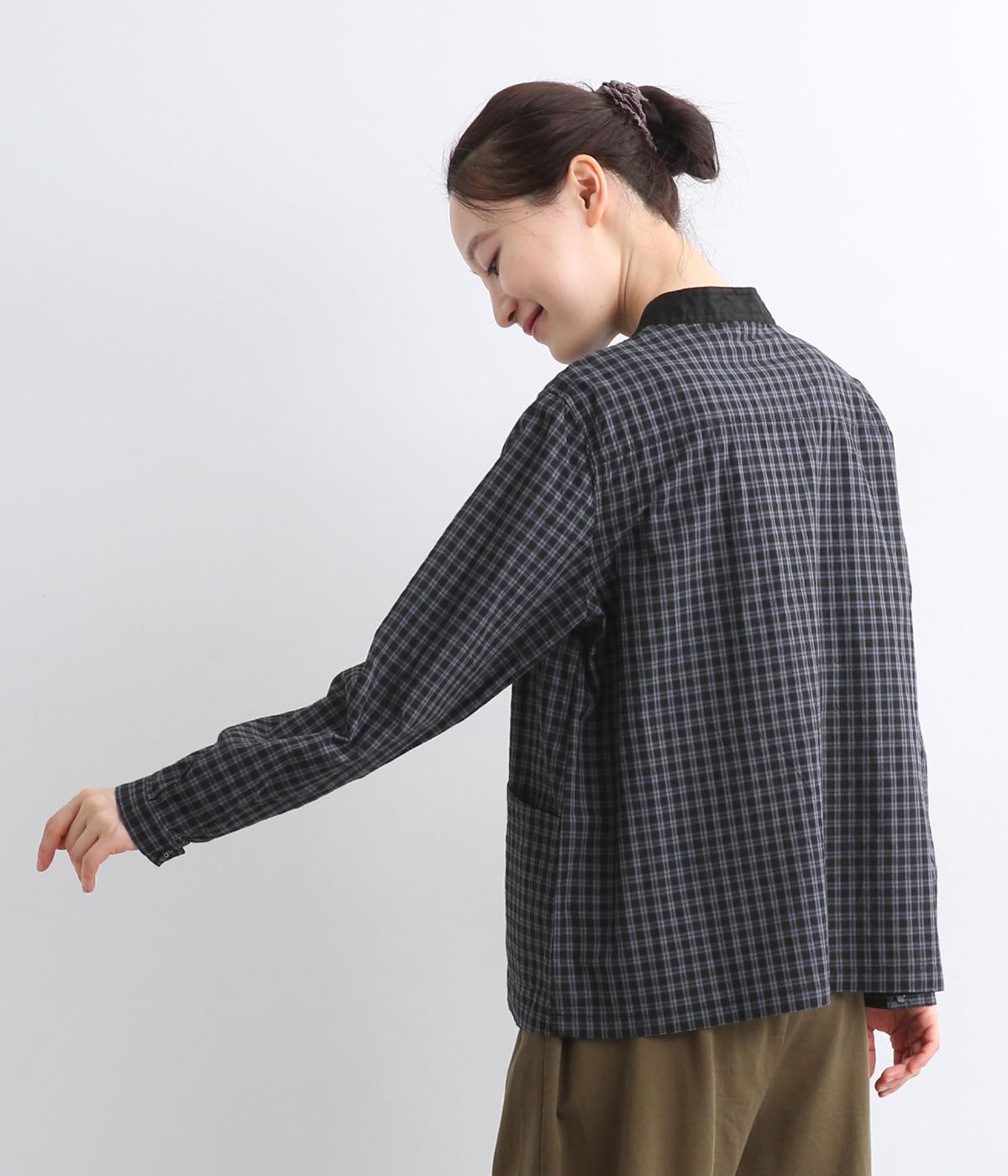 小さいピッチのチェック柄コットン地で仕立てたブラウスは、優しく落ち着いた印象。首元は無地のリネン生地で切り替えられており、配色アクセントになっています。