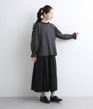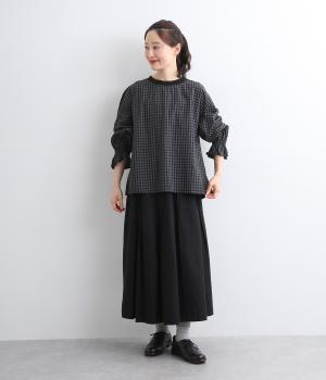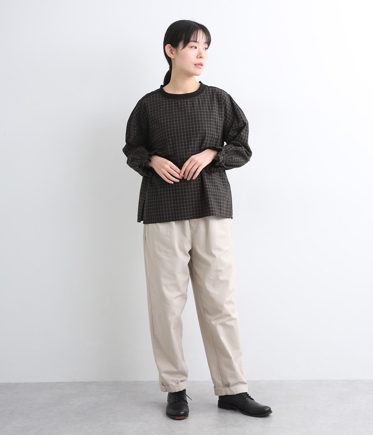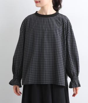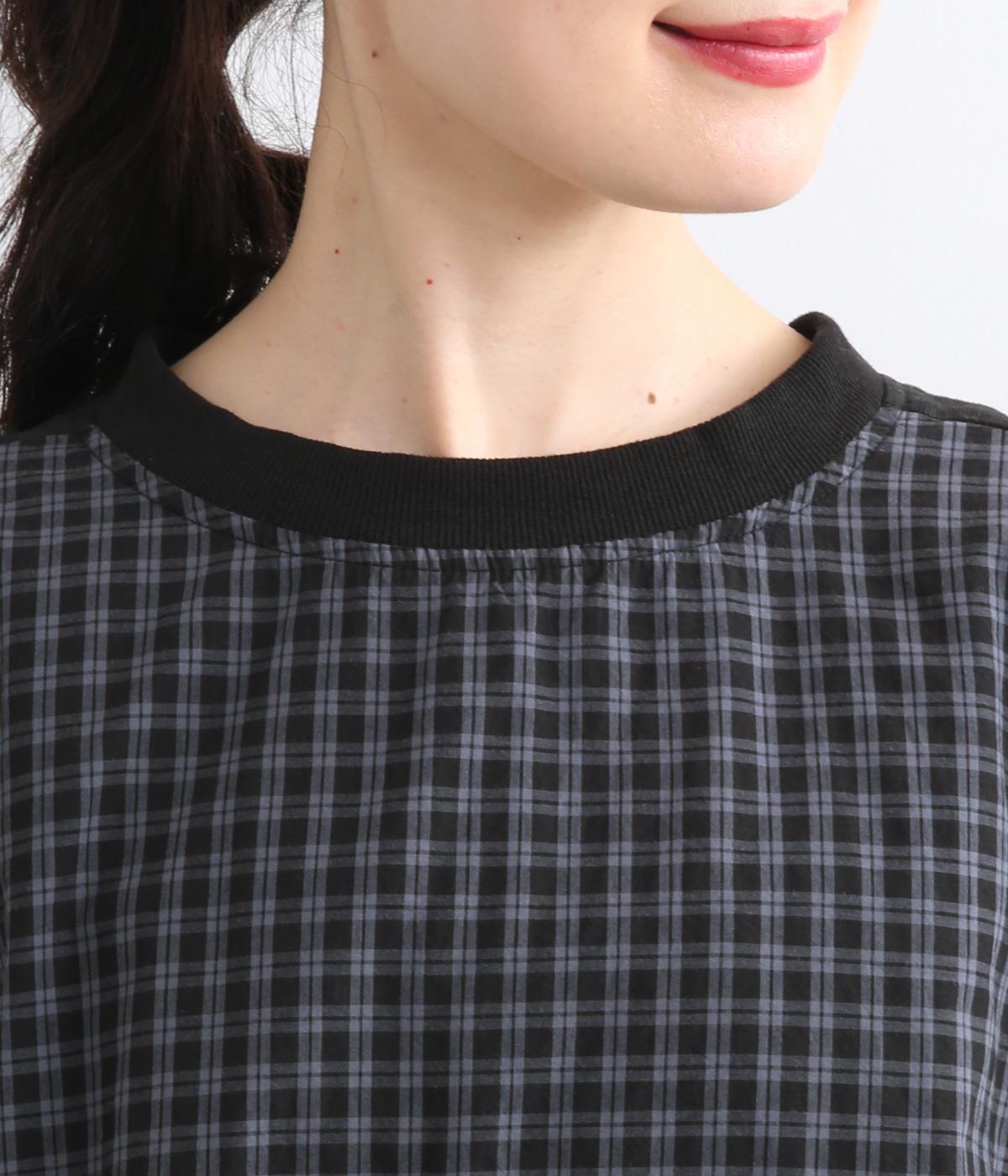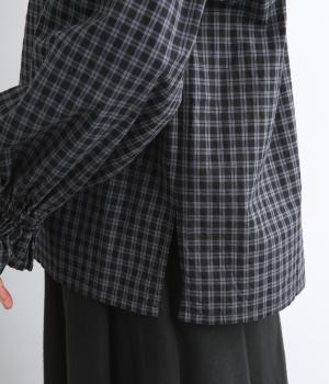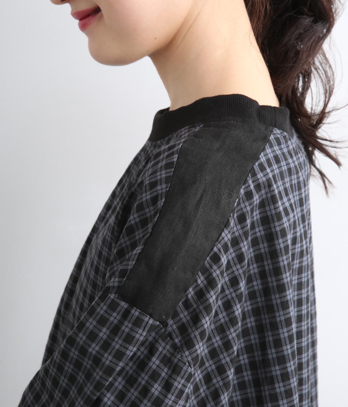 さらりとした肌触りで、快適に着られるコットンチェック生地。首もとはリブ、肩部分には無地リネン生地を切り替え、アクセントになっています。