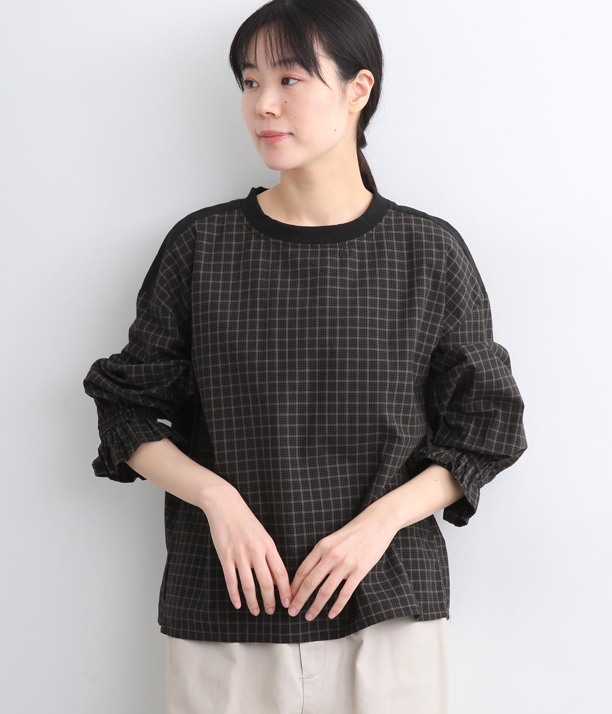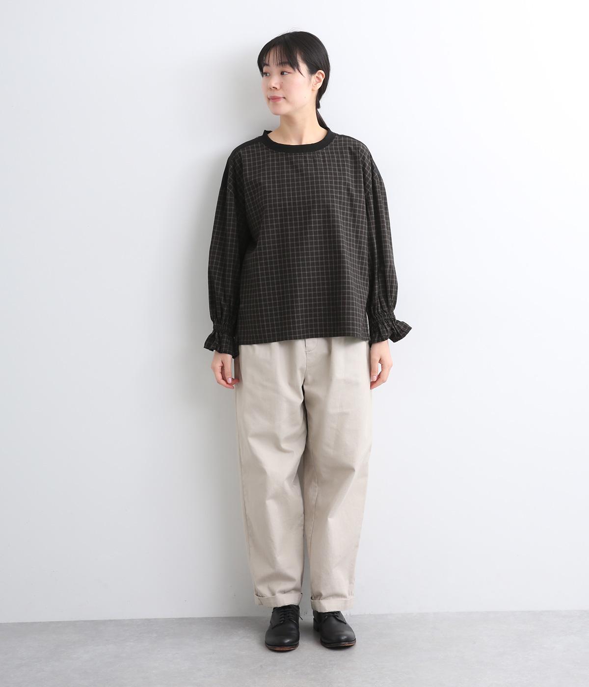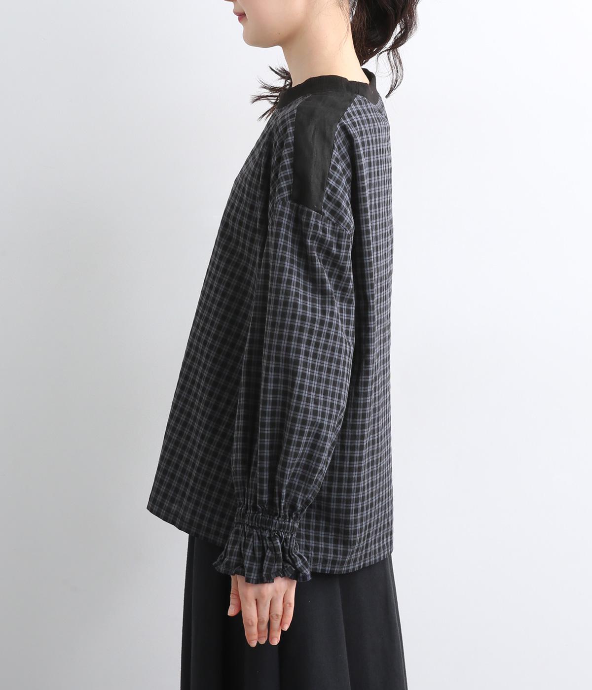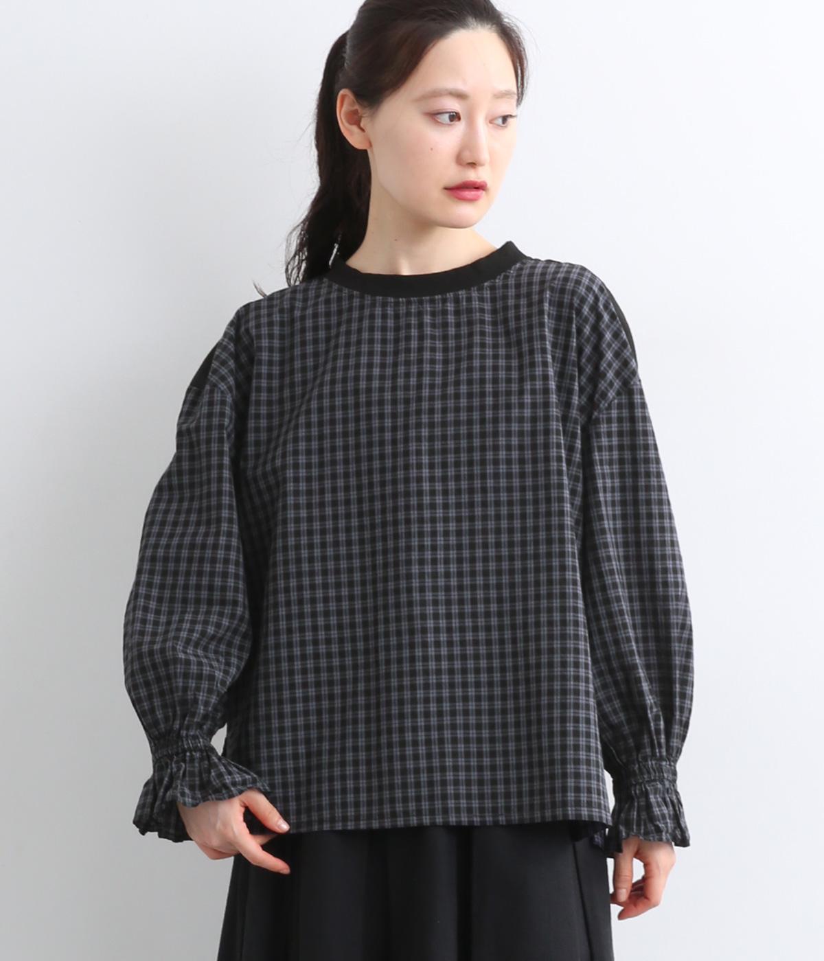 さらりとした肌触りで、快適に着られるコットンチェック生地。首もとはリブ、肩部分には無地リネン生地を切り替え、アクセントになっています。