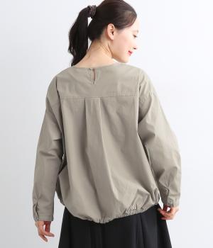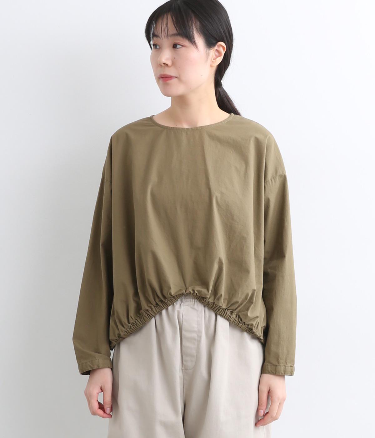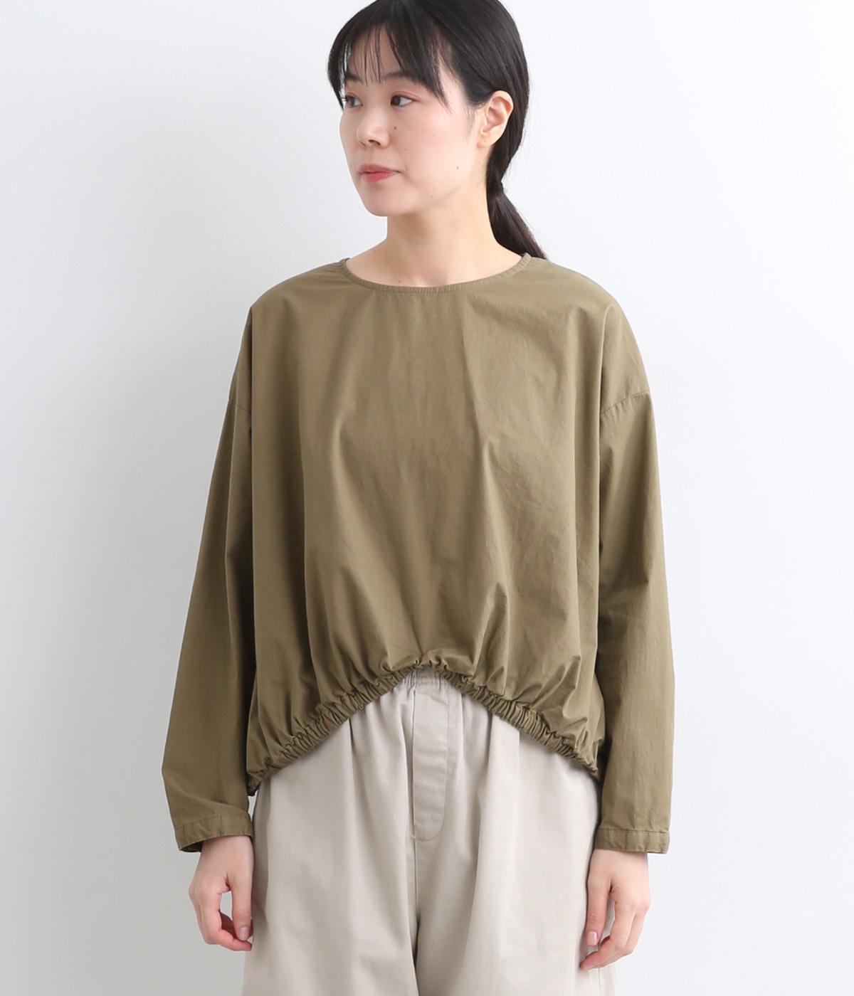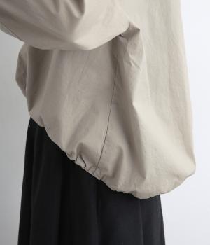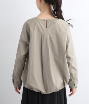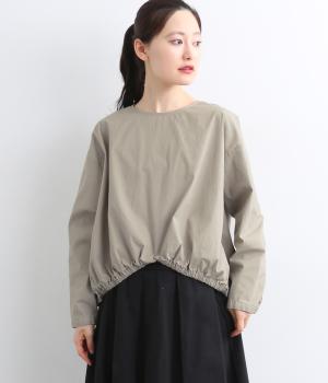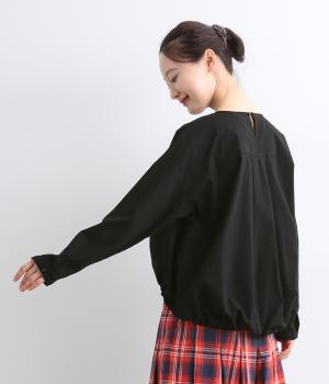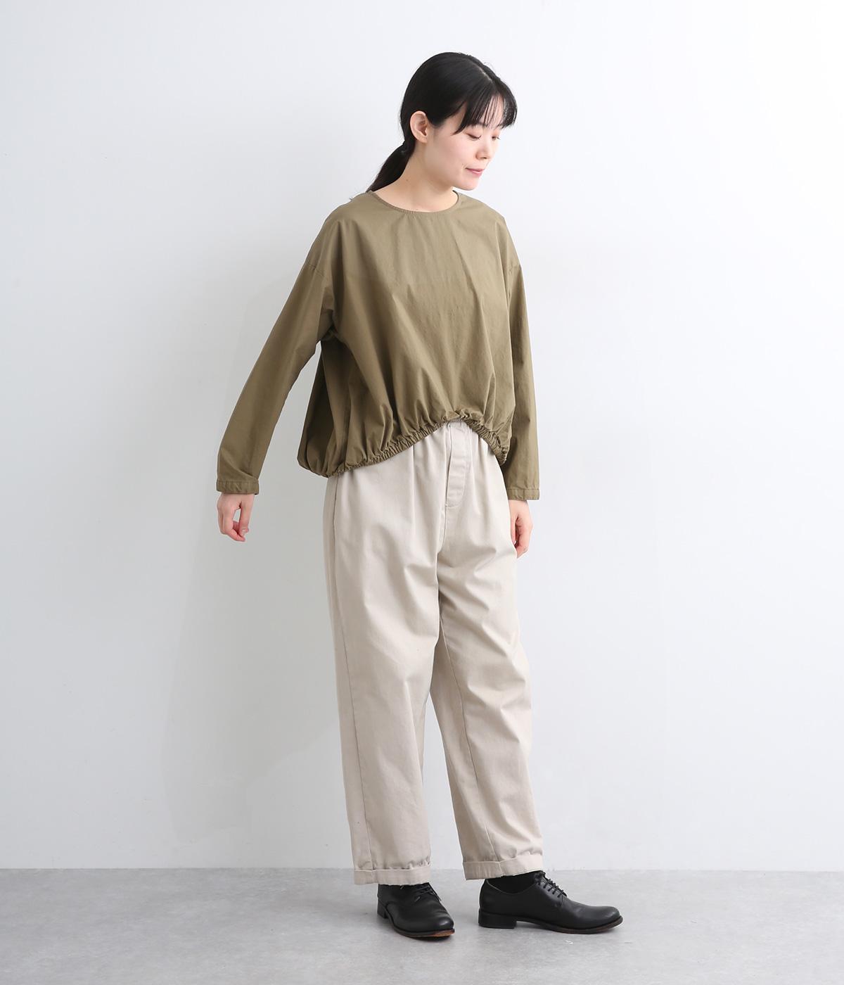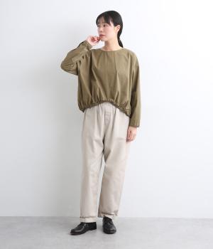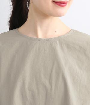 カットソー感覚でありながら、カジュアルになりすぎないデザイン。前後差のある裾にはゴム入りで、バルーンのような立体的なシルエットを生み出します。後ろにはタック入りできれいめな印象。襟ぐりが広めなのでスッキリ見えます。