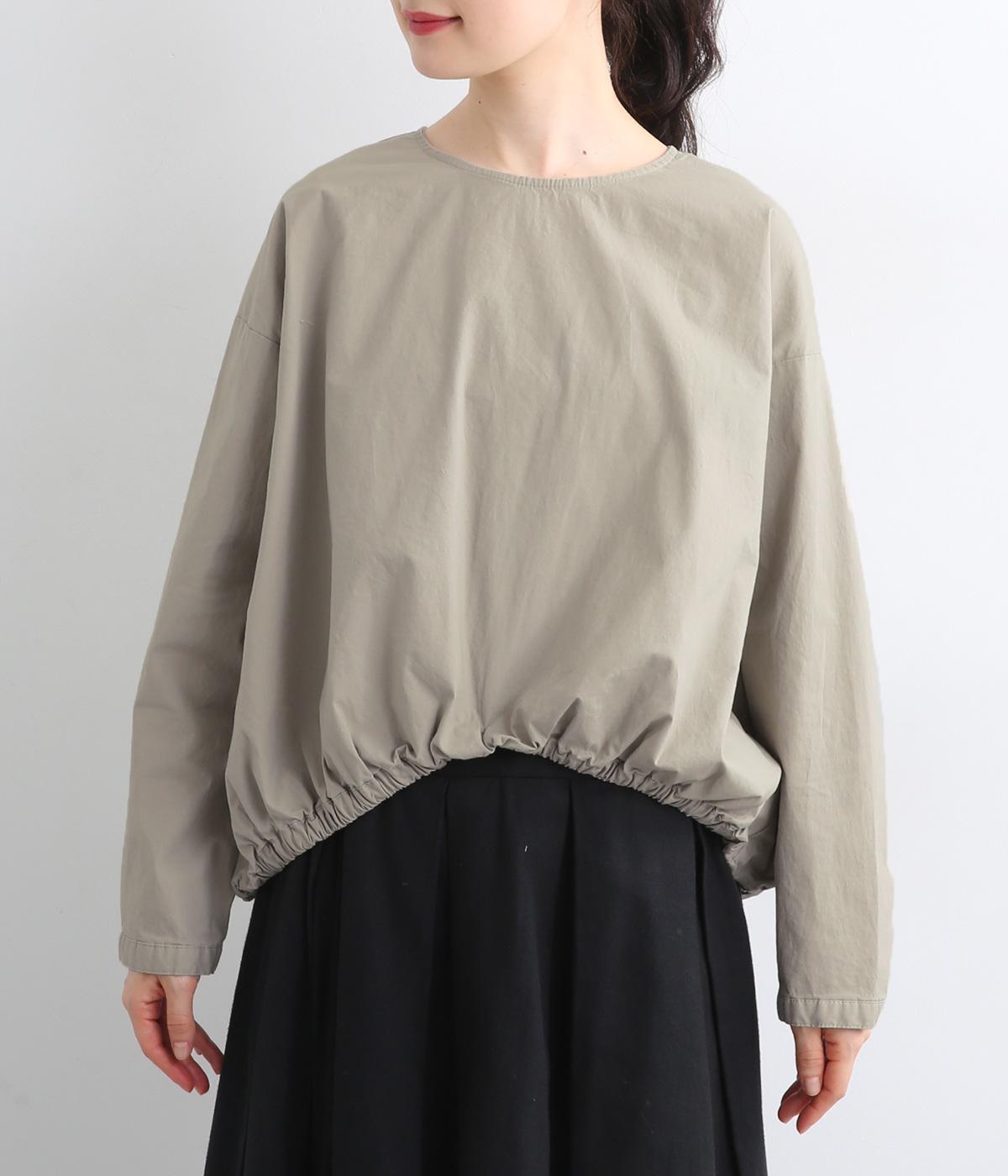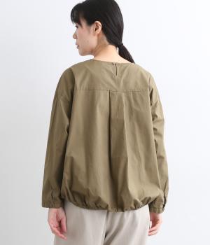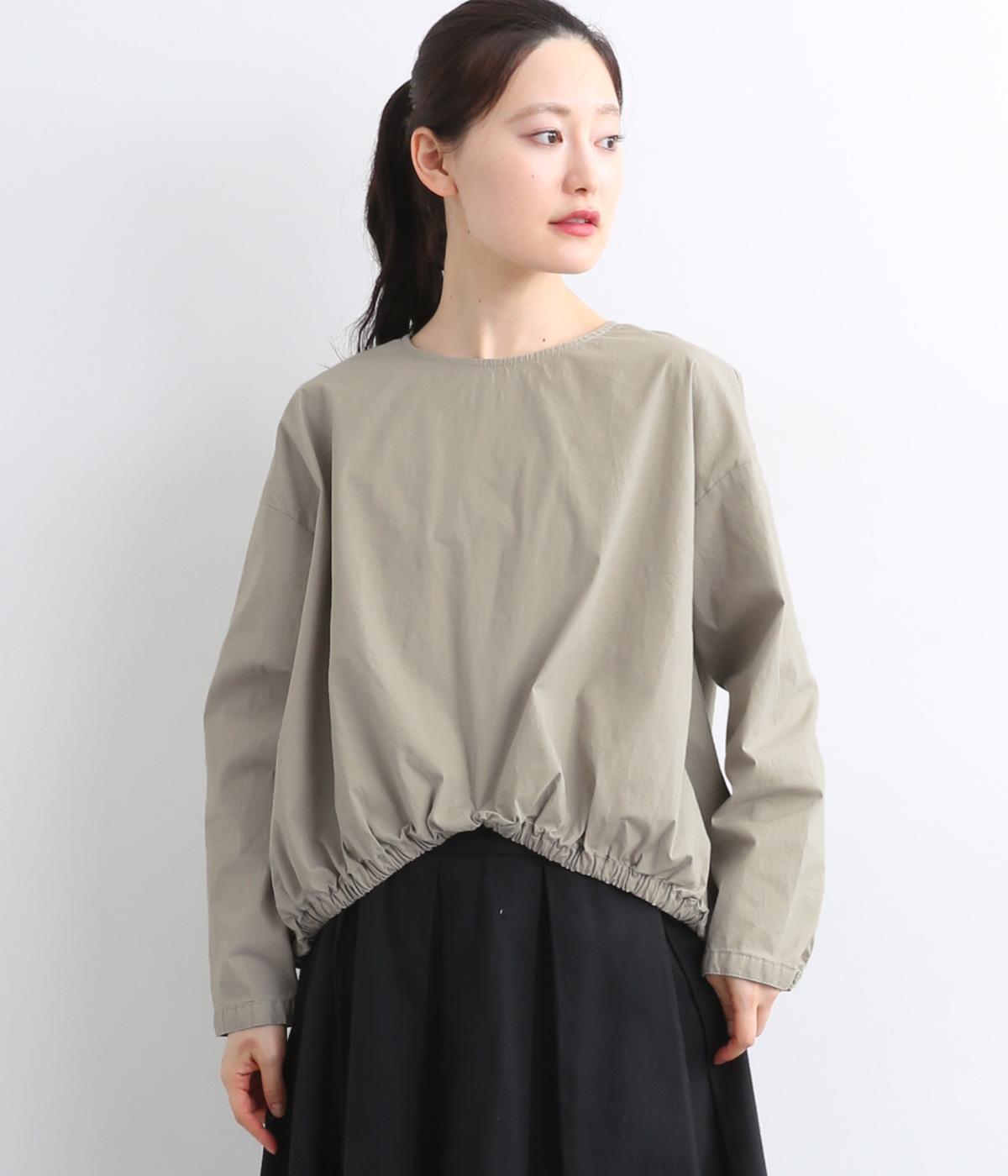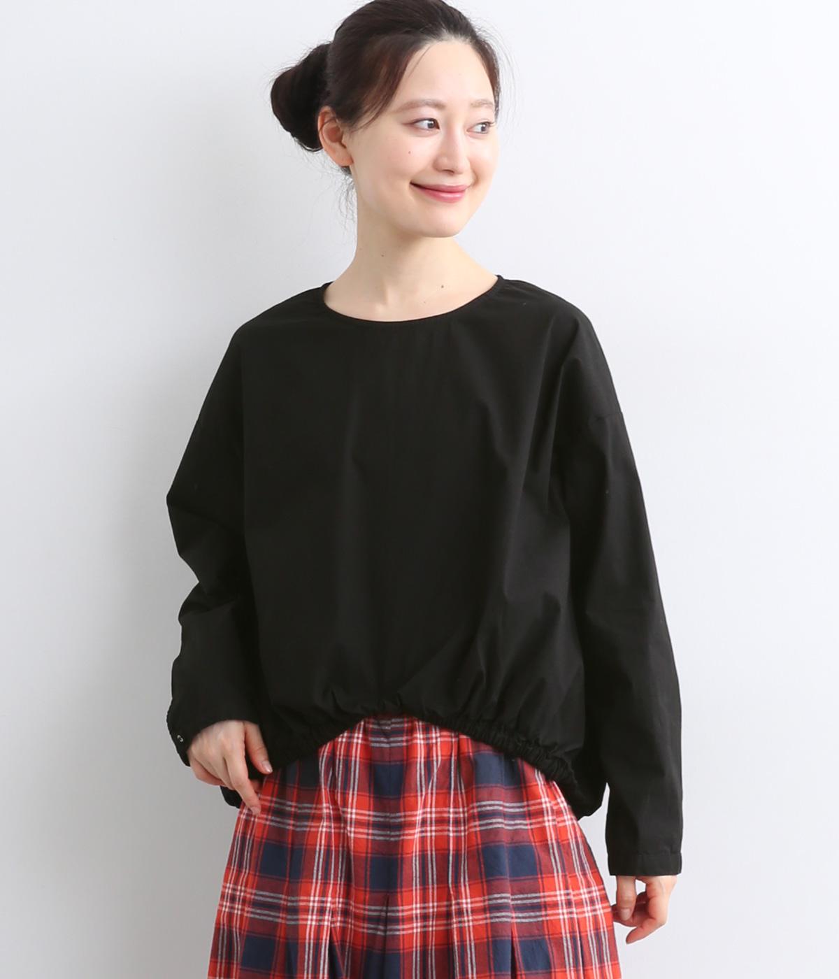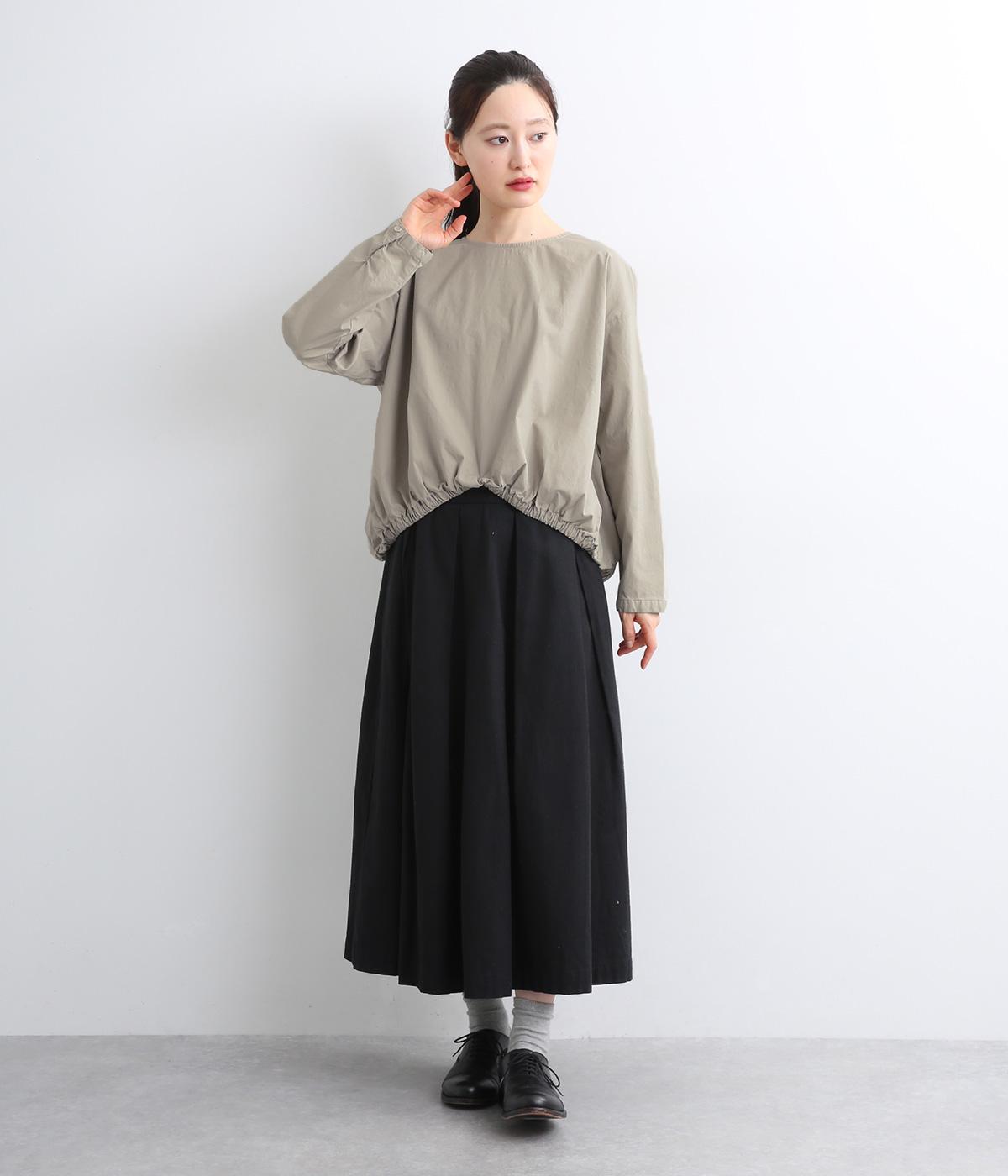 カットソー感覚でありながら、カジュアルになりすぎないデザイン。前後差のある裾にはゴム入りで、バルーンのような立体的なシルエットを生み出します。後ろにはタック入りできれいめな印象。襟ぐりが広めなのでスッキリ見えます。