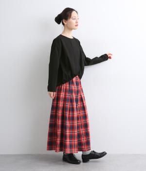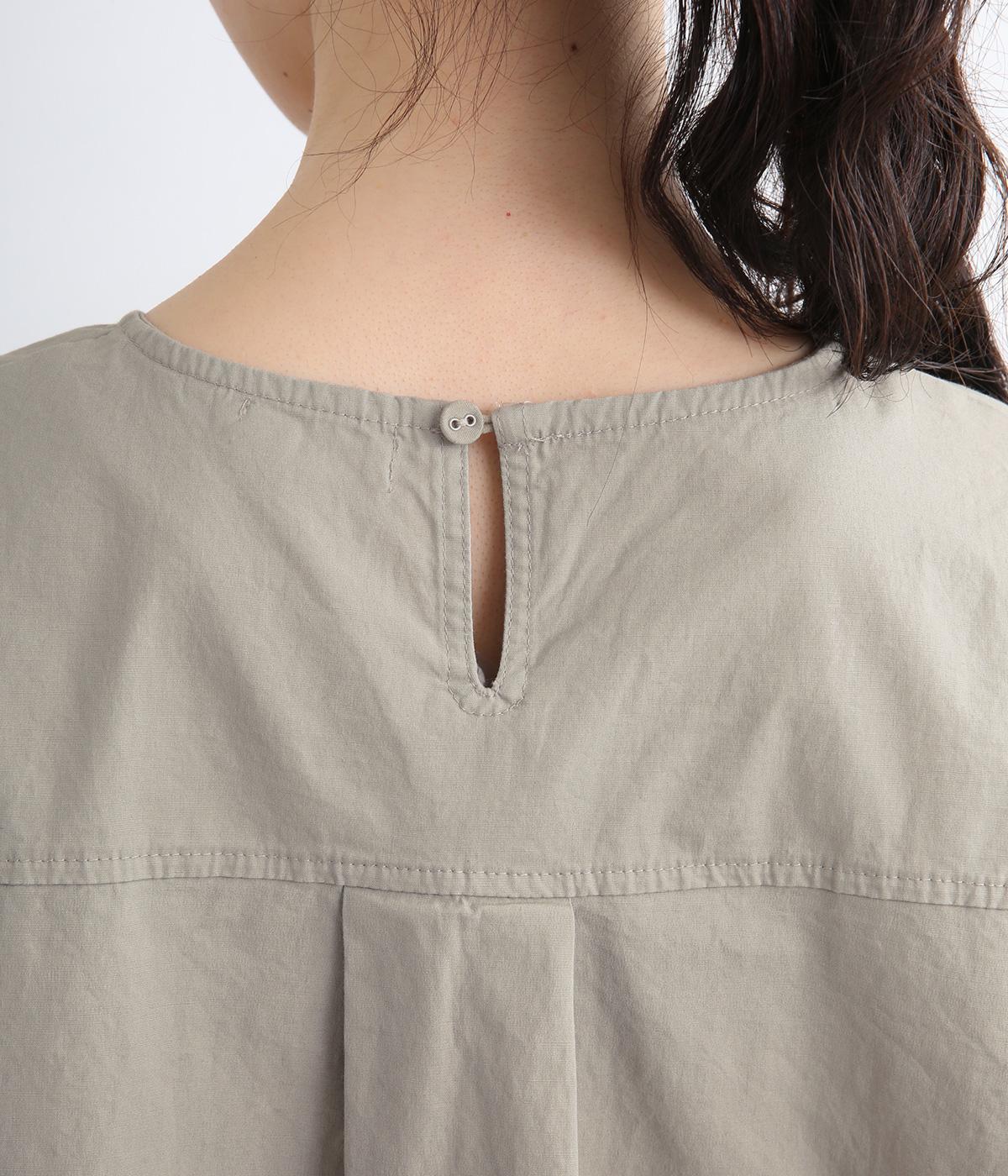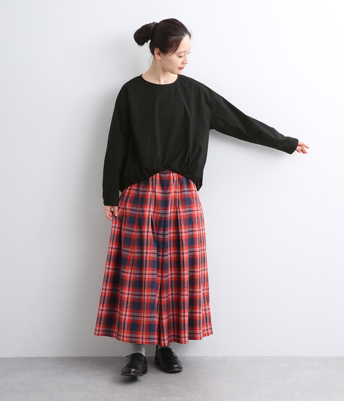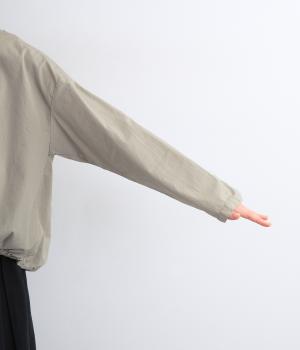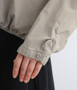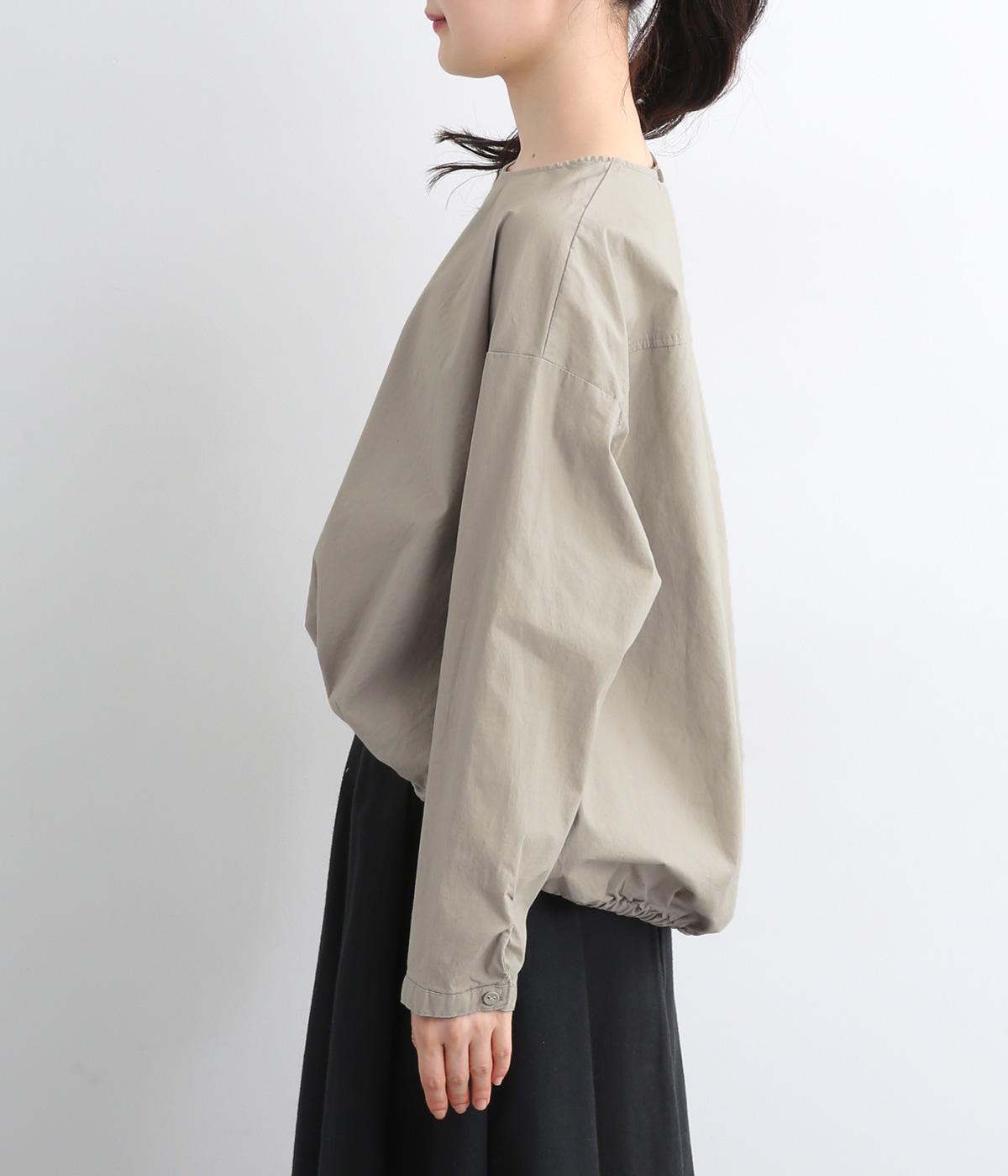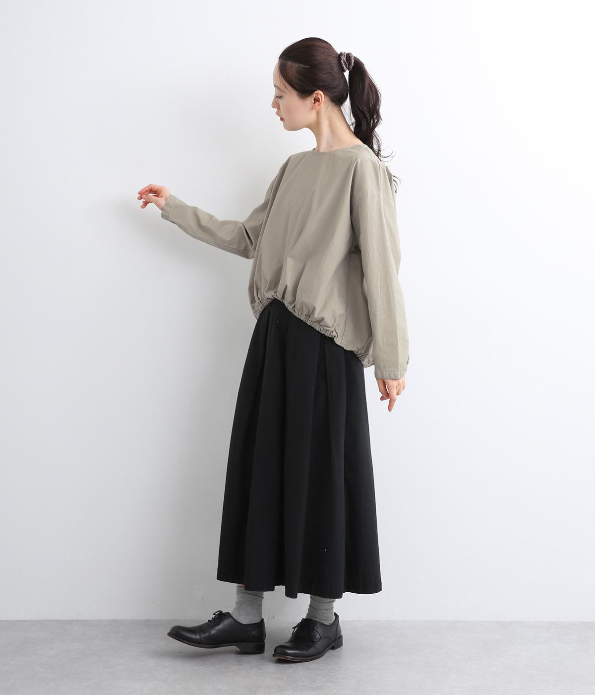 カットソー感覚でありながら、カジュアルになりすぎないデザイン。前後差のある裾にはゴム入りで、バルーンのような立体的なシルエットを生み出します。後ろにはタック入りできれいめな印象。襟ぐりが広めなのでスッキリ見えます。