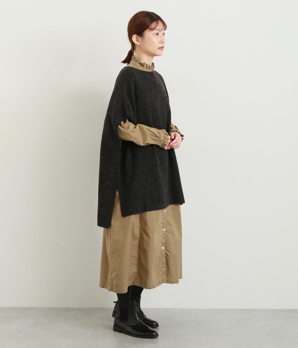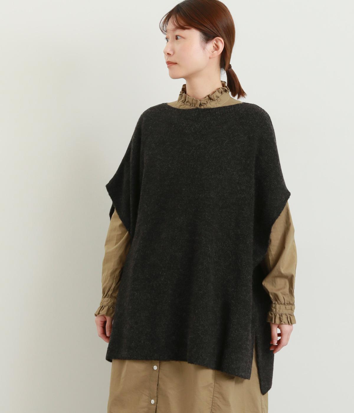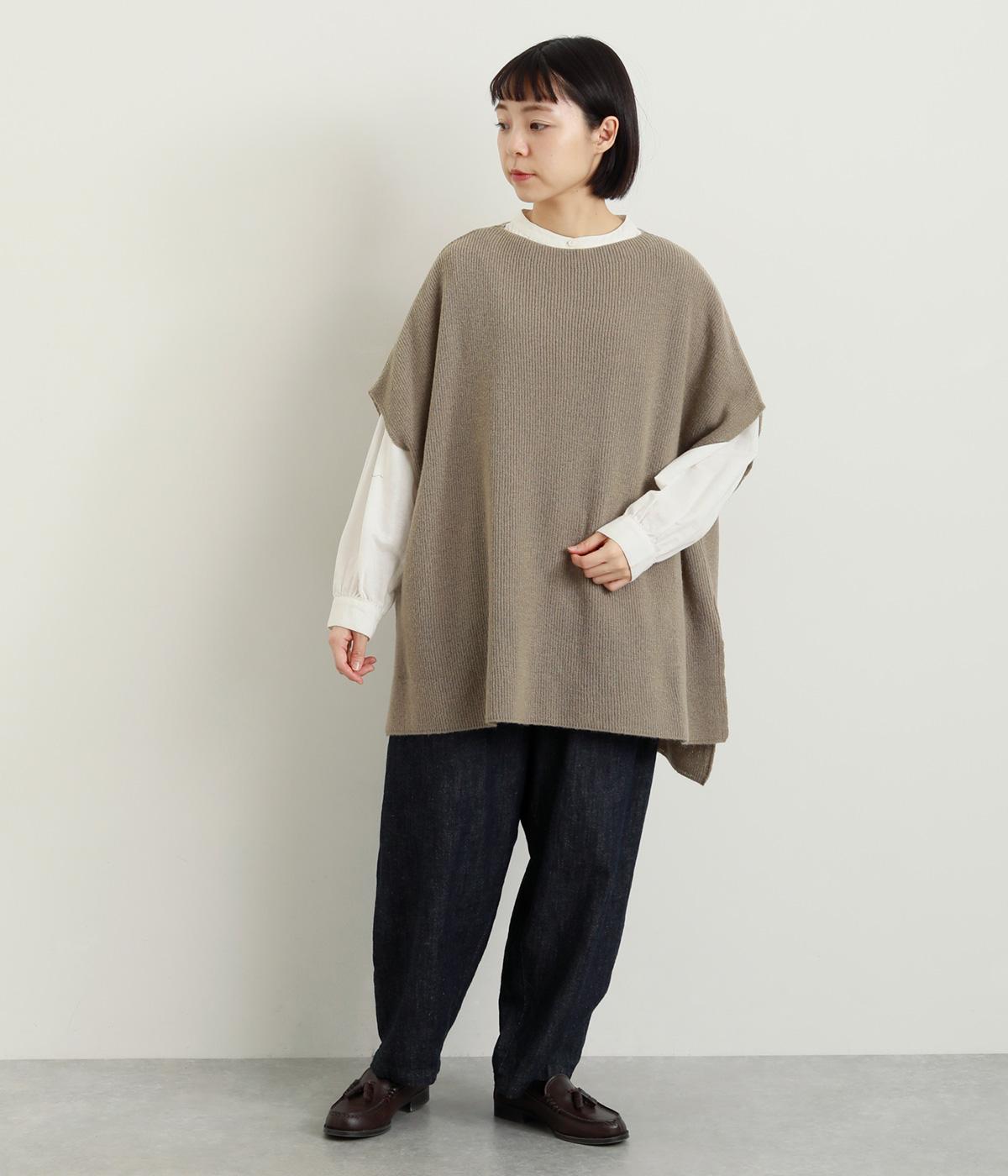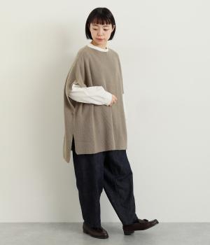 ほどよいゆとりを持たせたワイドなかたちで、体のラインを拾いにくいデザインです。肩を落としたポンチョ風のシルエットが自然な丸みをつくり、女性らしい印象をつくります。サイドスリットが抜け感を演出し、カジュアルにもきれいめにも合わせやすい万能な一枚です。