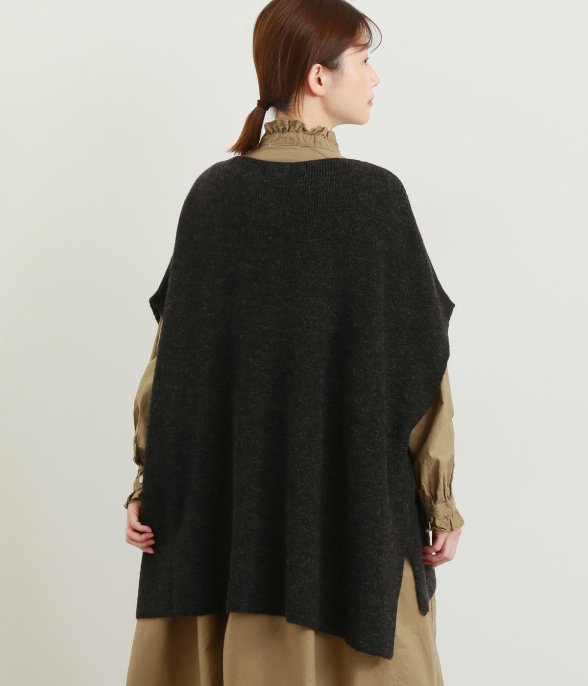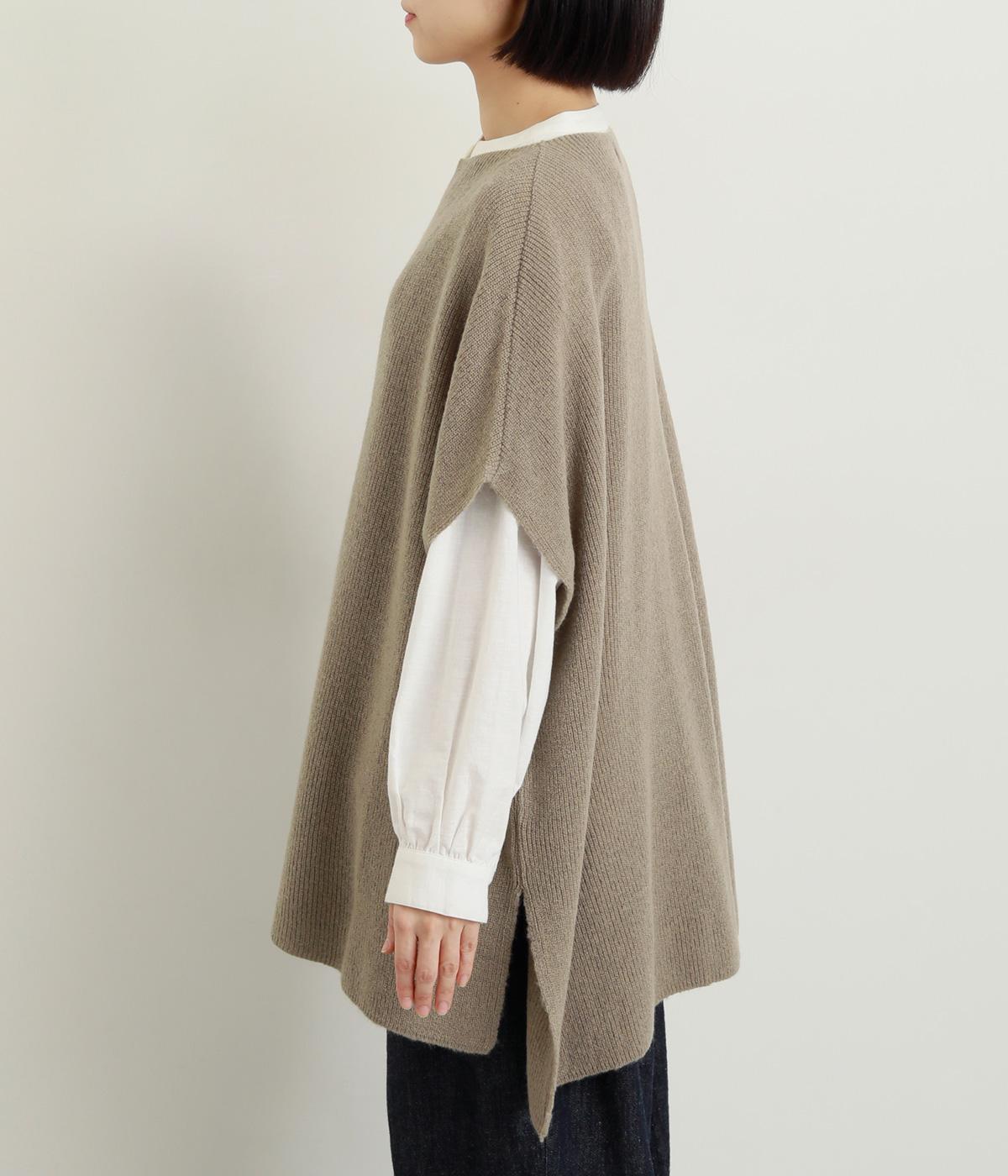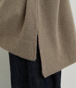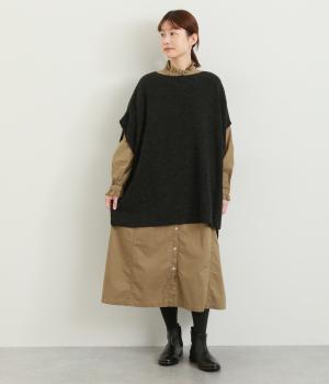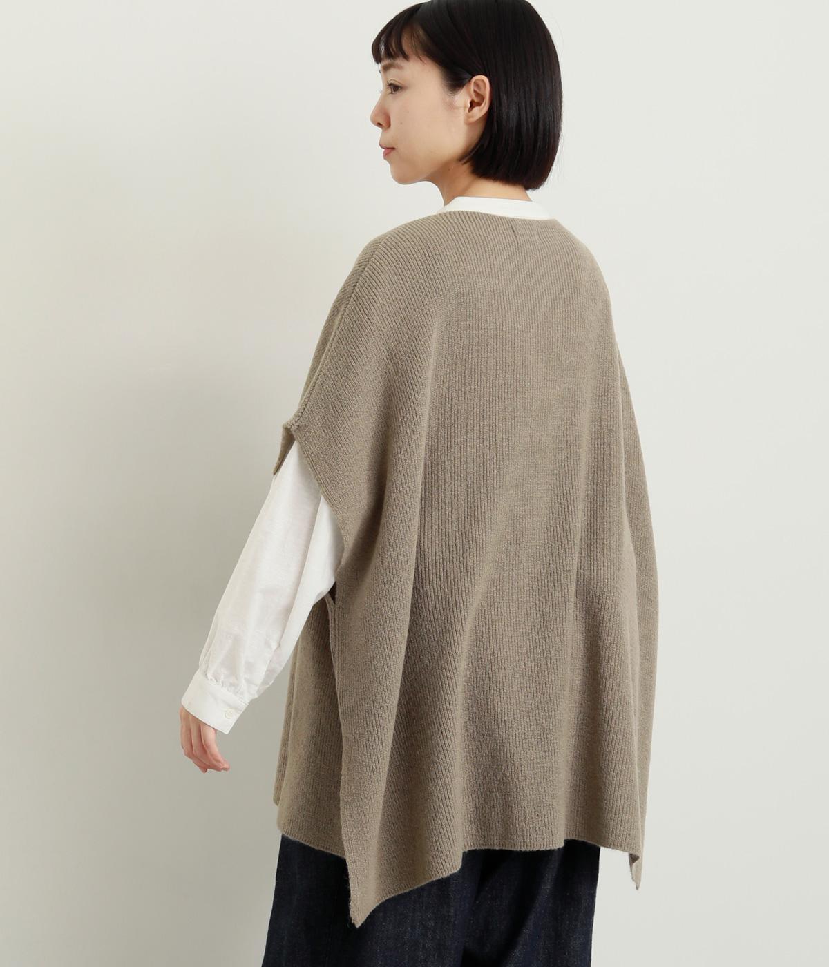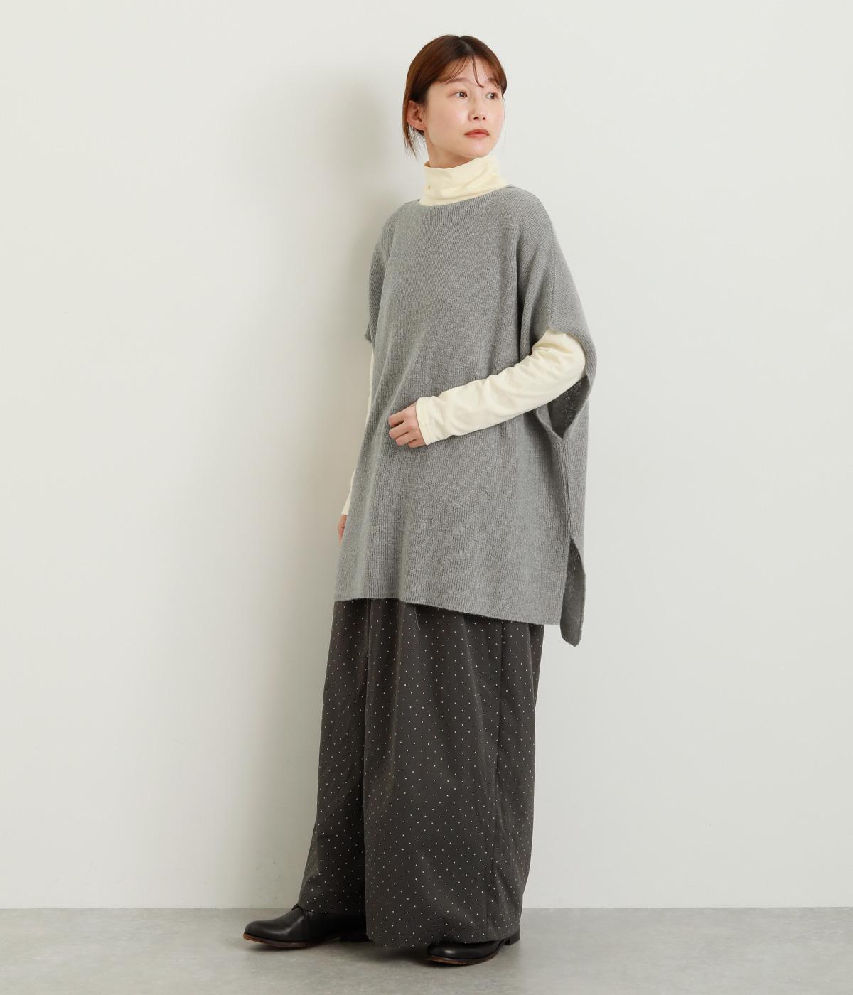 ほどよいゆとりを持たせたワイドなかたちで、体のラインを拾いにくいデザインです。肩を落としたポンチョ風のシルエットが自然な丸みをつくり、女性らしい印象をつくります。サイドスリットが抜け感を演出し、カジュアルにもきれいめにも合わせやすい万能な一枚です。