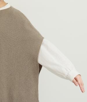 あぜ編みならではの凹凸が表情ゆたかで、空気をふくむようにふんわりと仕上げた生地。伸びやかにやわらかく体に沿う着心地なので、長時間の着用でも快適です。