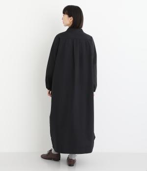 体がゆったりと泳ぐロングワンピース。ハリのある生地がふわりと広がるフォルムをきれいに表現してくれます。袖口にゴムを入れて丸みを持たせた袖と、ラウンド裾が女性らしいやわらかなムードを演出。前を開けてロングアウターのように羽織っても素敵です。