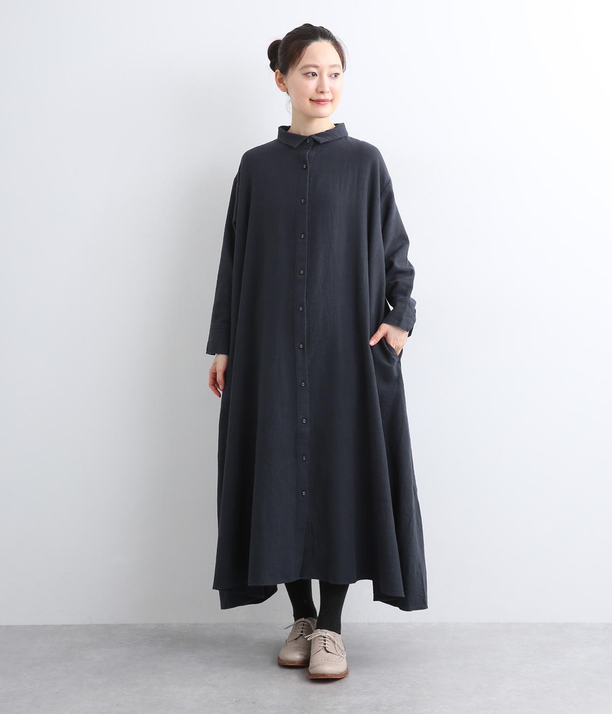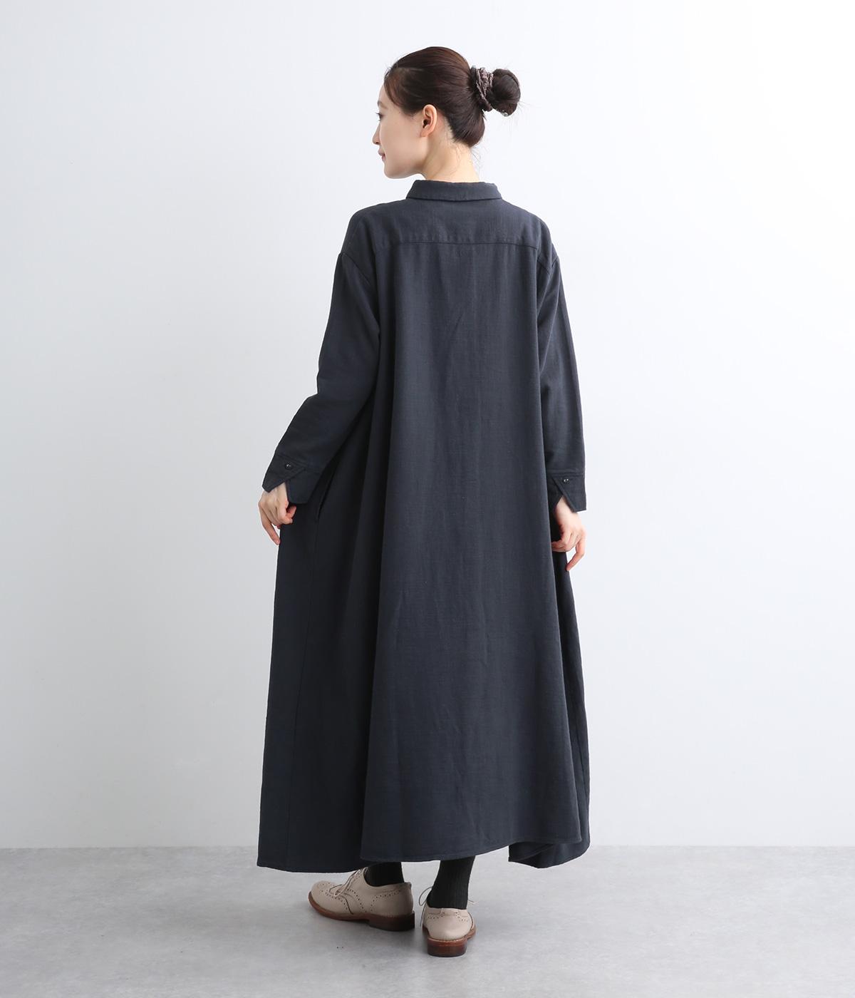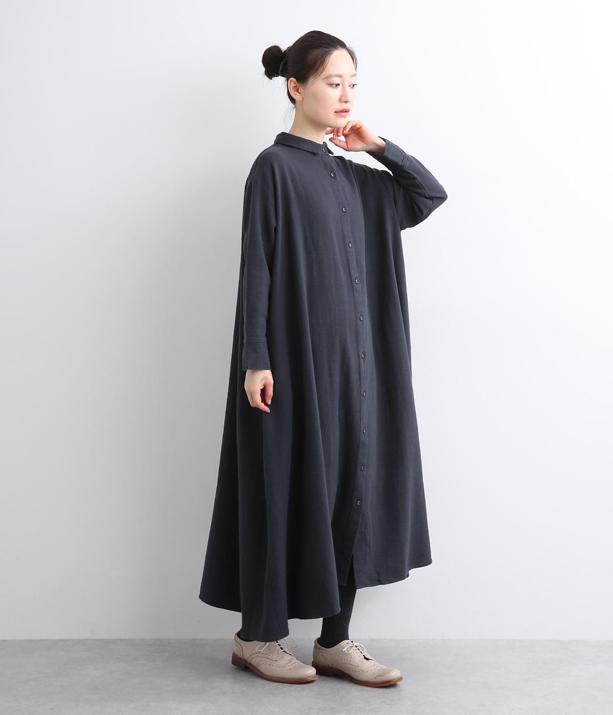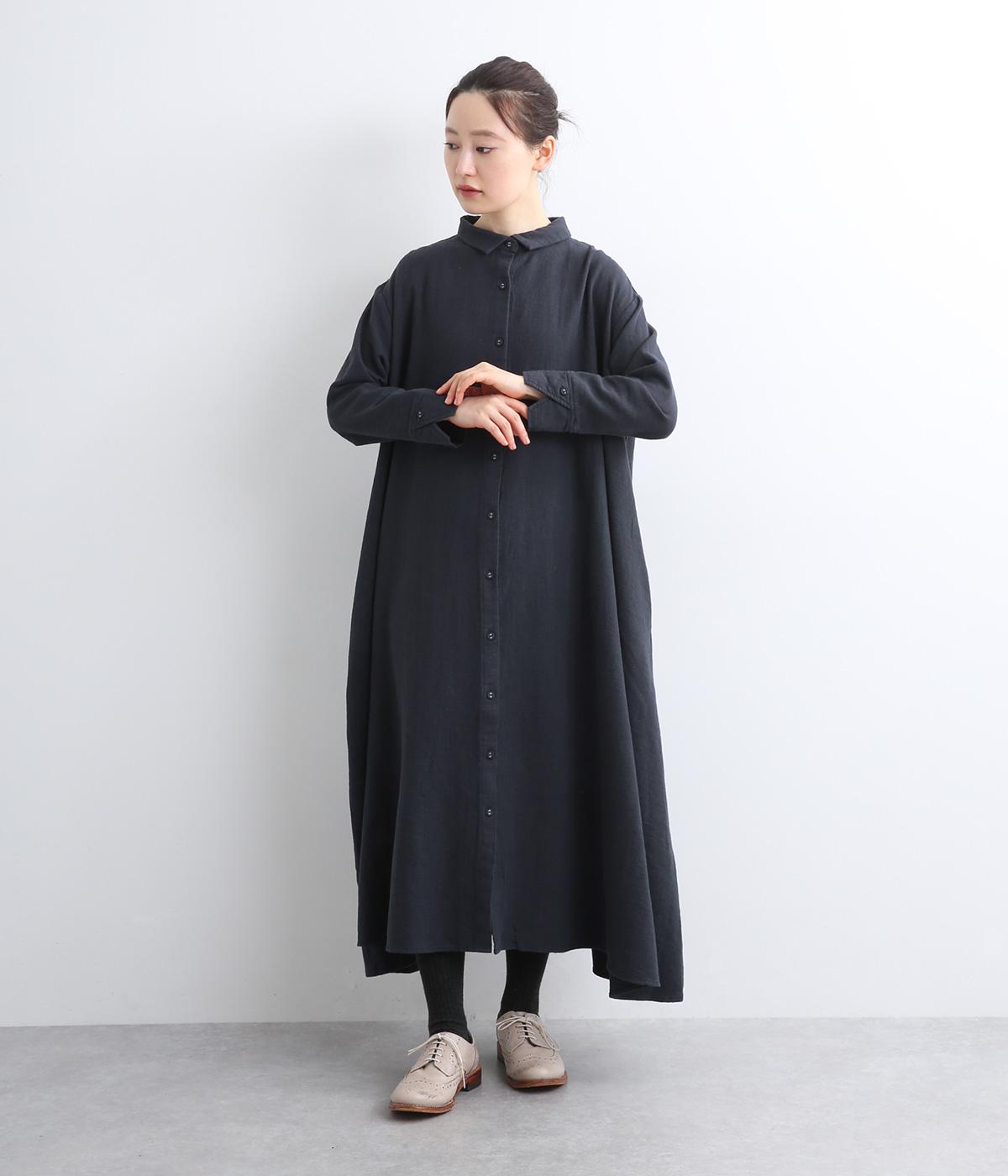 前開きボタンで羽織りとしても使えるロングシャツワンピースです。たっぷり生地をとったフレアシルエットに、小さめの襟がかわいらしさと上品さを添えてくれます。手元にニュアンスを生む袖口のカッティングデザインも魅力的。