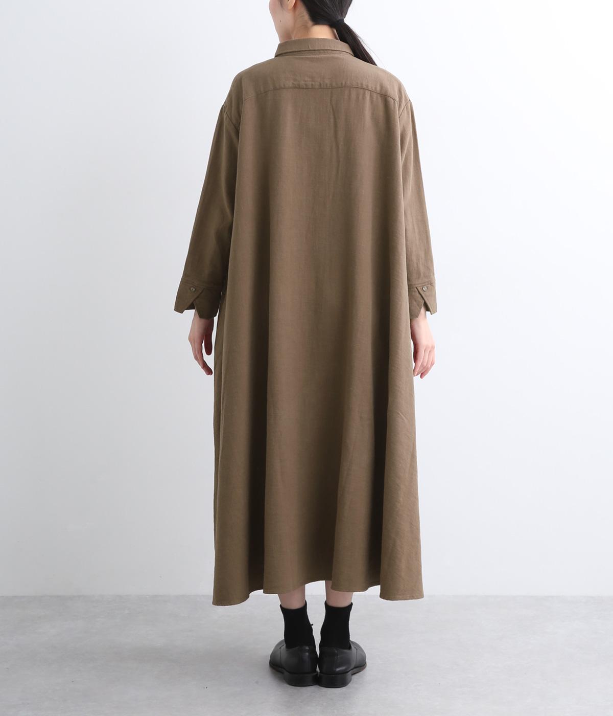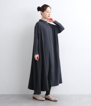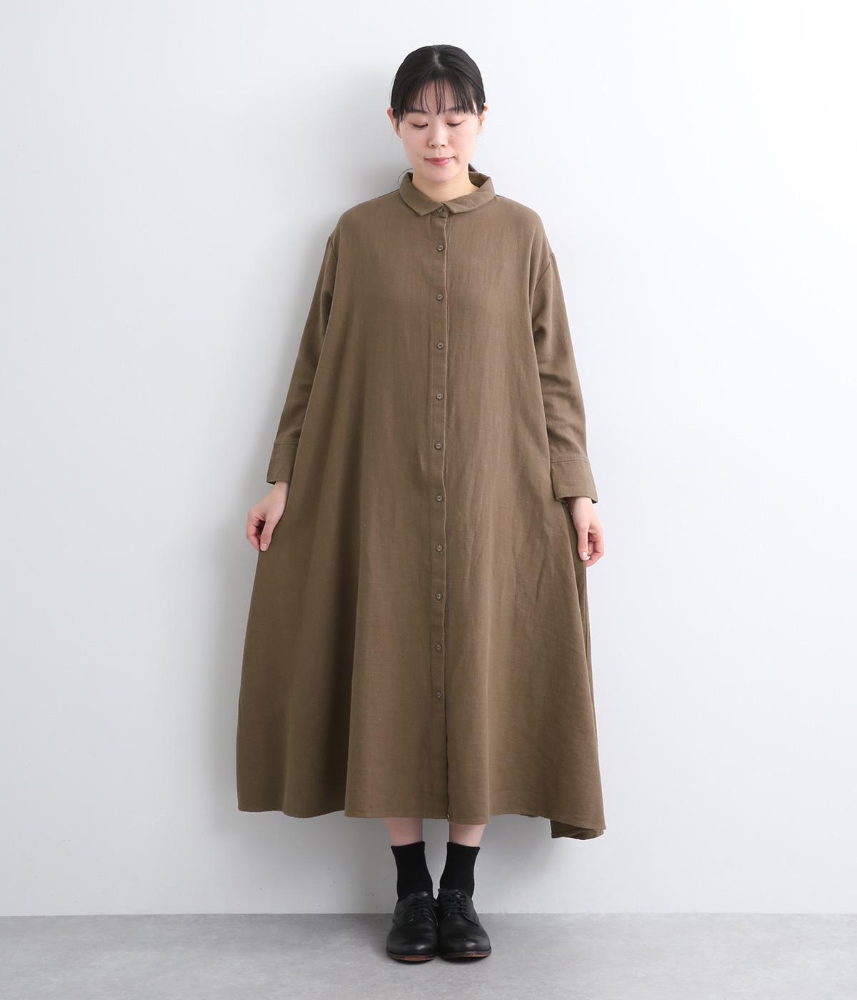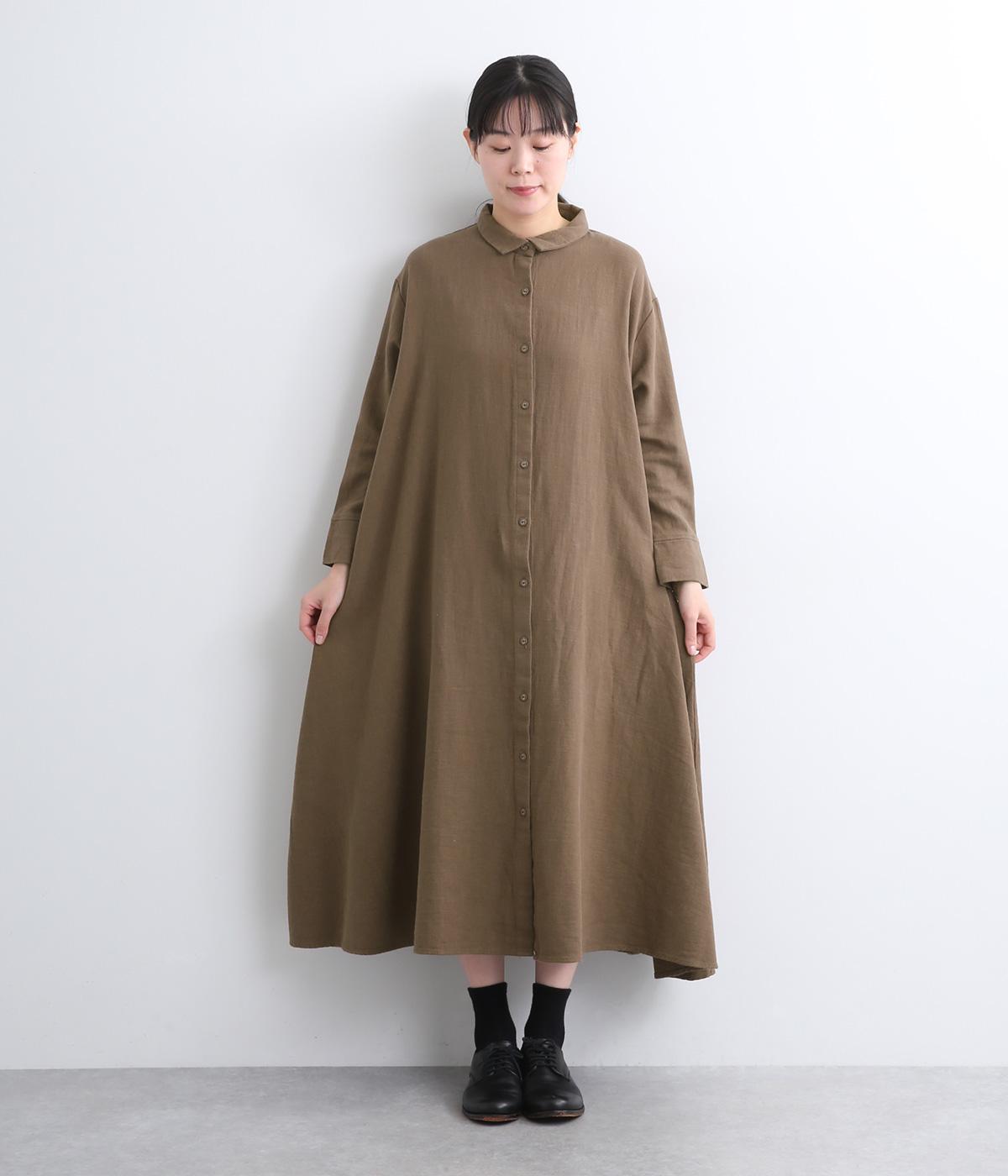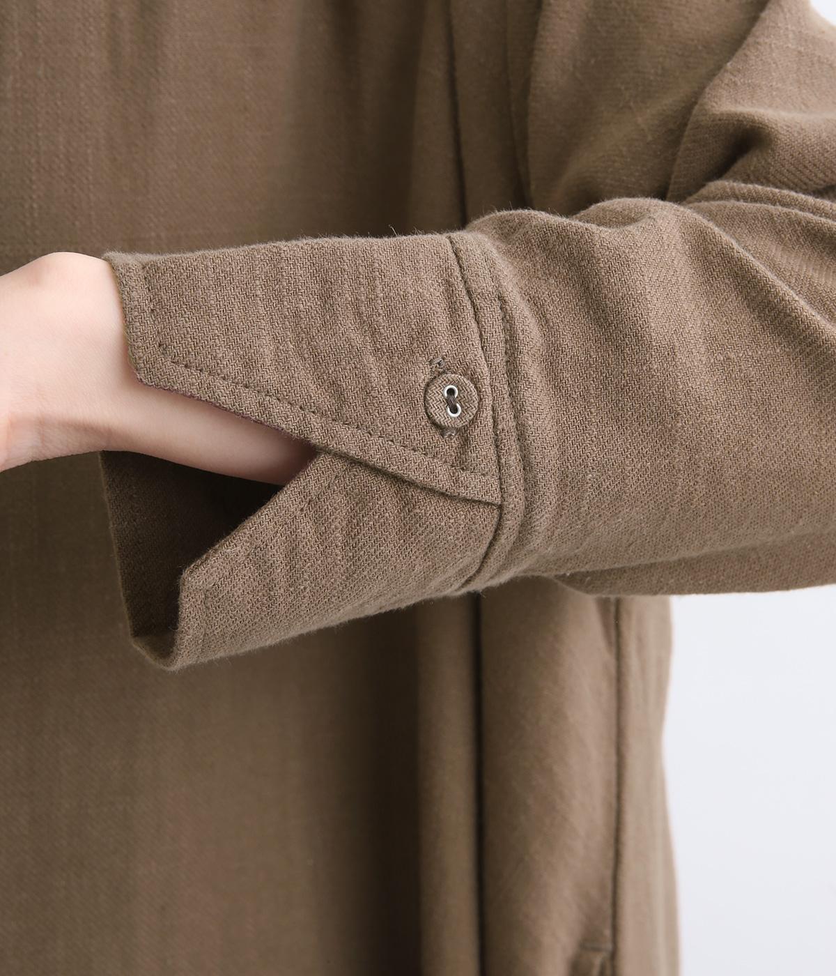 前開きボタンで羽織りとしても使えるロングシャツワンピースです。たっぷり生地をとったフレアシルエットに、小さめの襟がかわいらしさと上品さを添えてくれます。手元にニュアンスを生む袖口のカッティングデザインも魅力的。