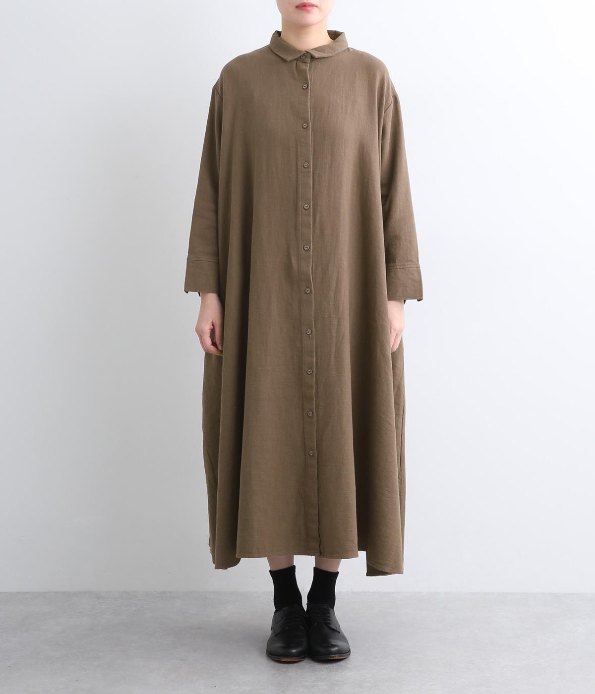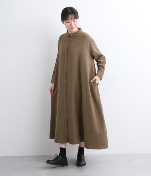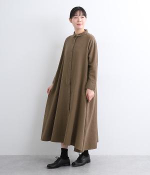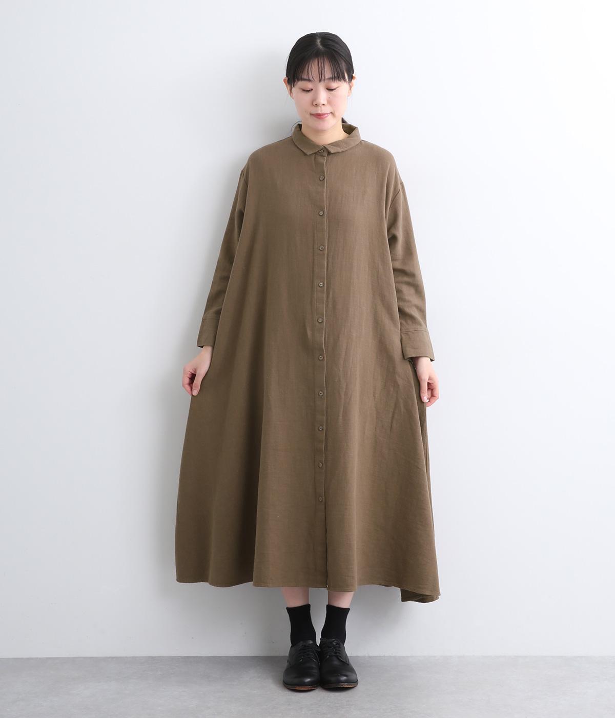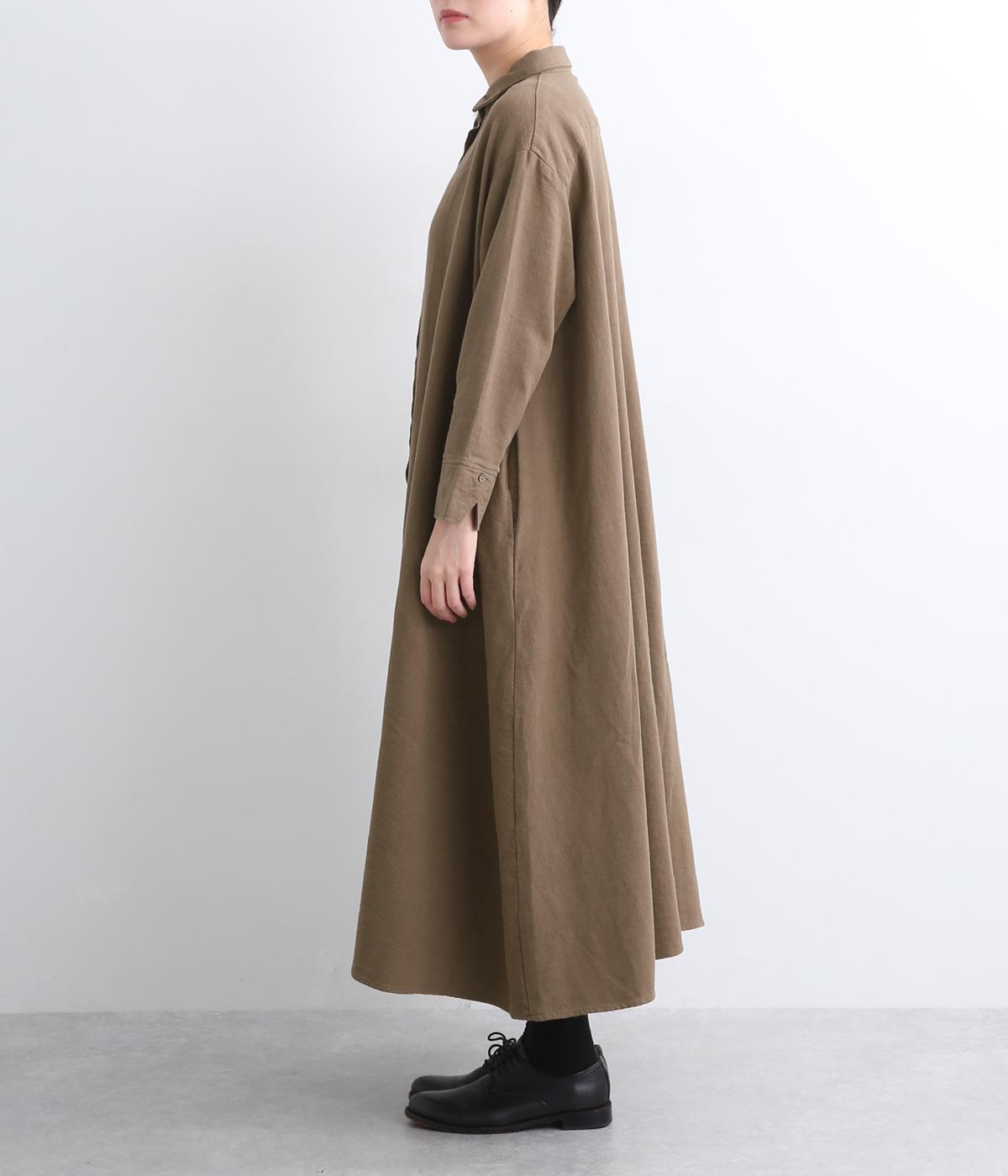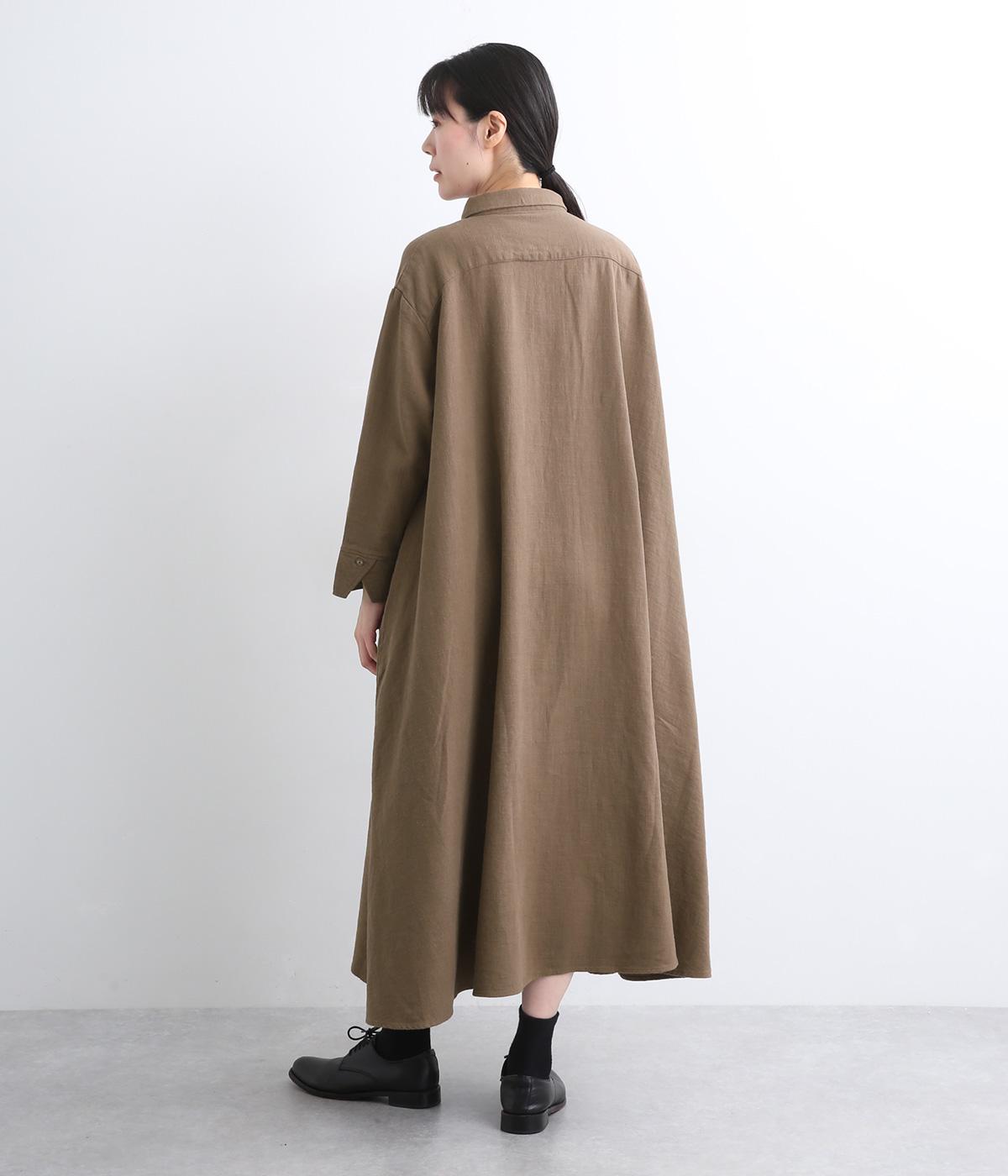 前開きボタンで羽織りとしても使えるロングシャツワンピースです。たっぷり生地をとったフレアシルエットに、小さめの襟がかわいらしさと上品さを添えてくれます。手元にニュアンスを生む袖口のカッティングデザインも魅力的。
