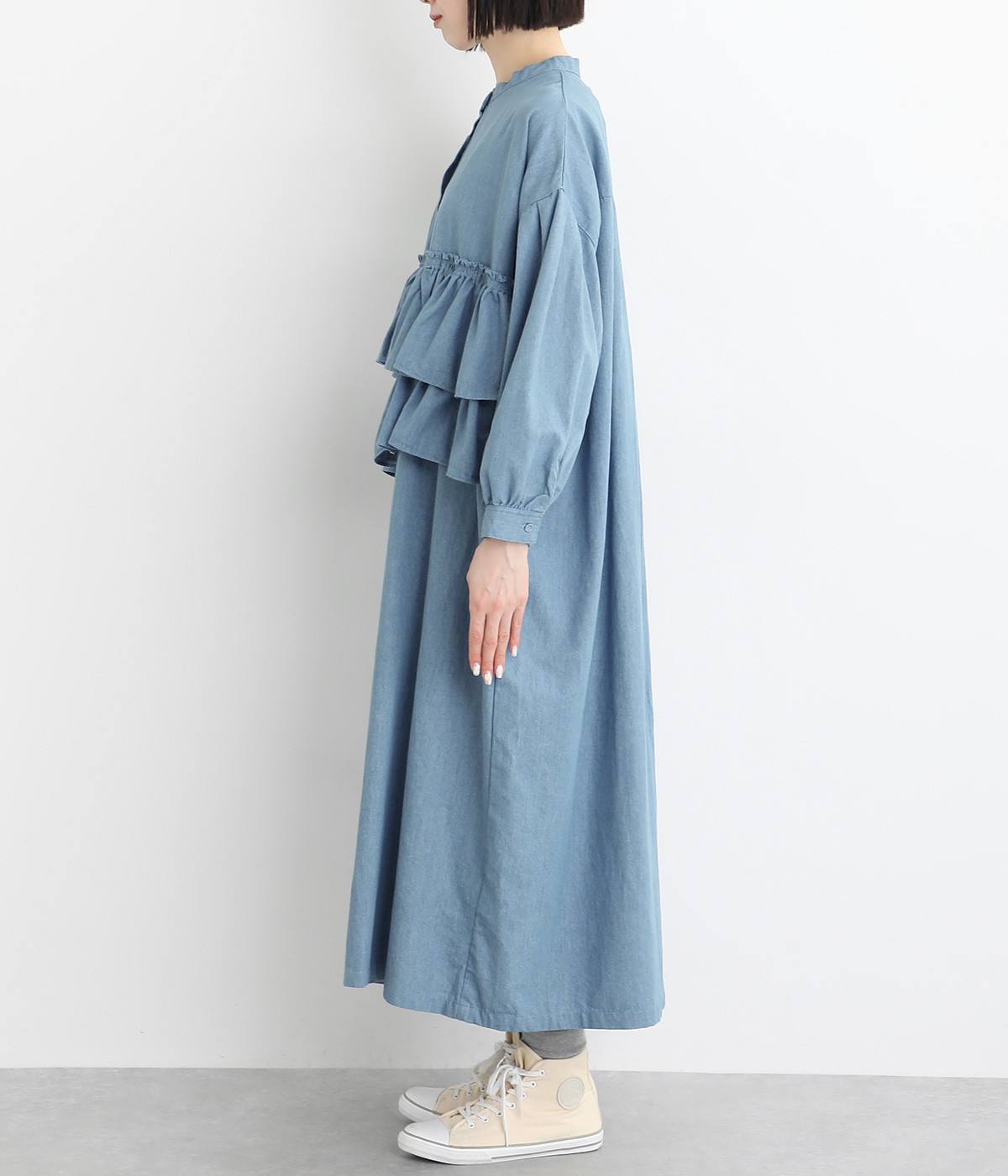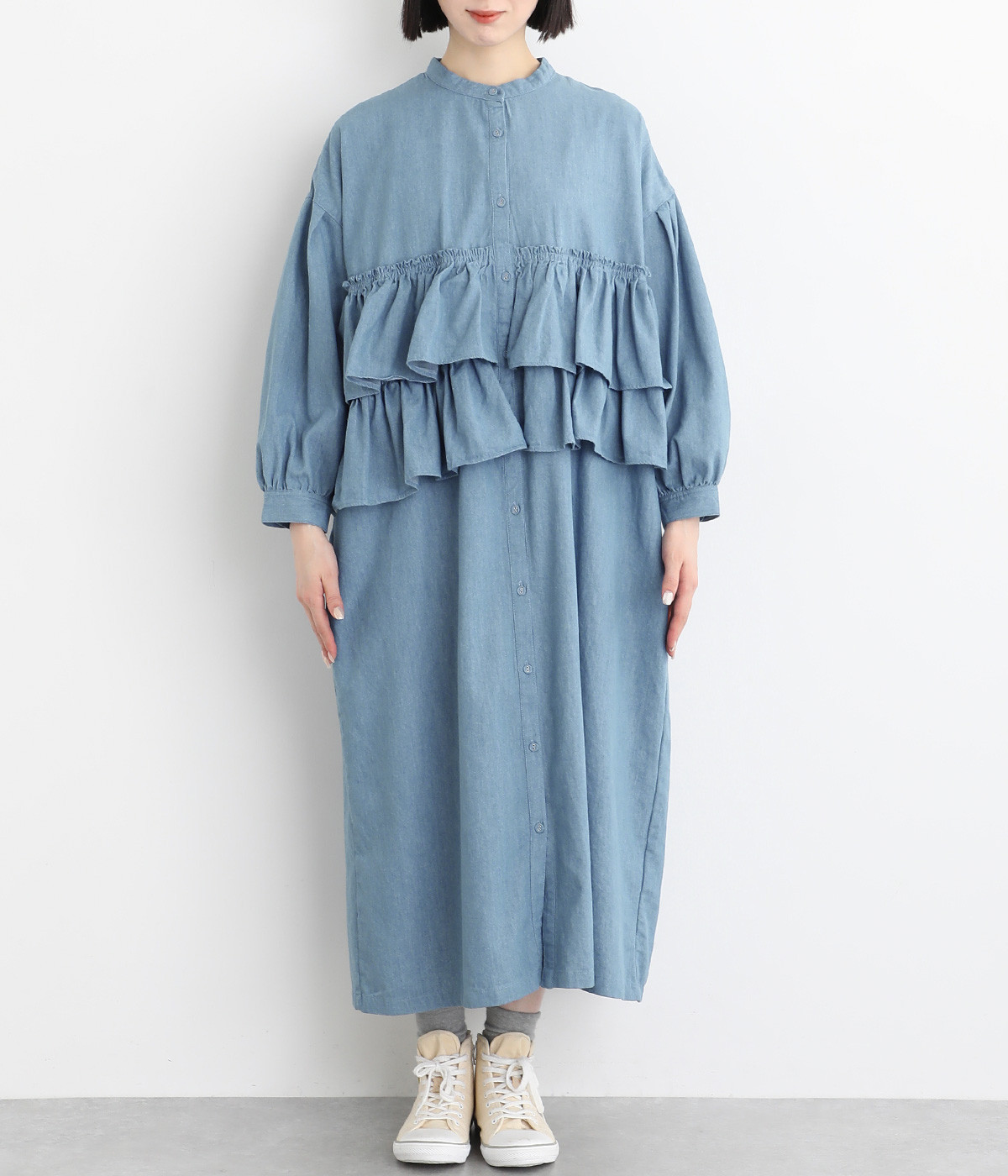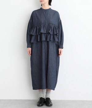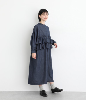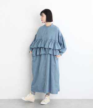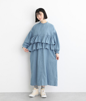 一見トップスとスカートのセットアップのように見えるおしゃれなシャツワンピース。前身頃に大胆にフリルをあしらって、エアリーな雰囲気に仕上げました。単体でも使いやすい長めの着丈もうれしいポイントです。