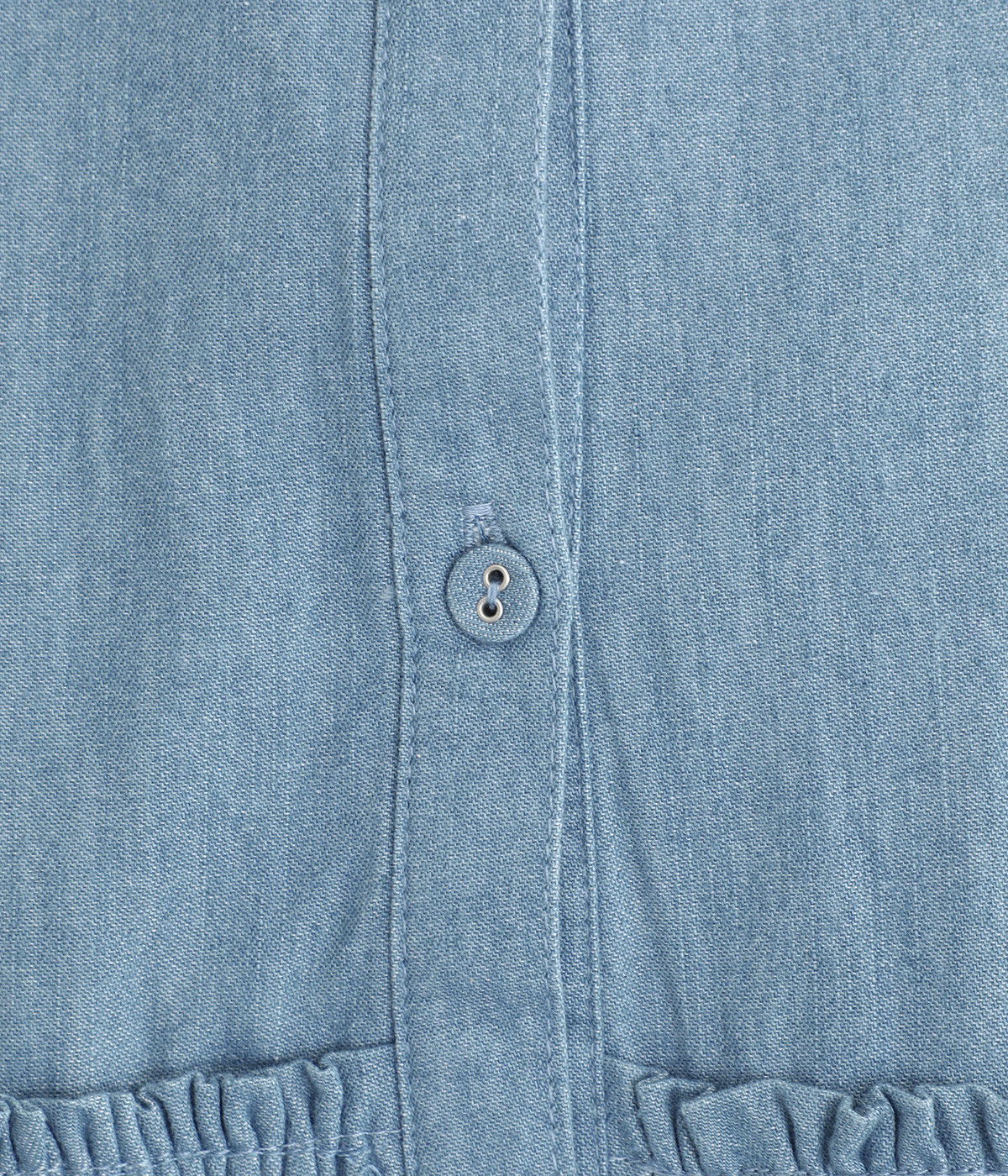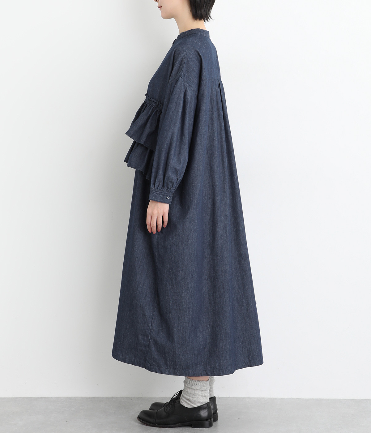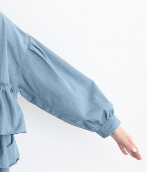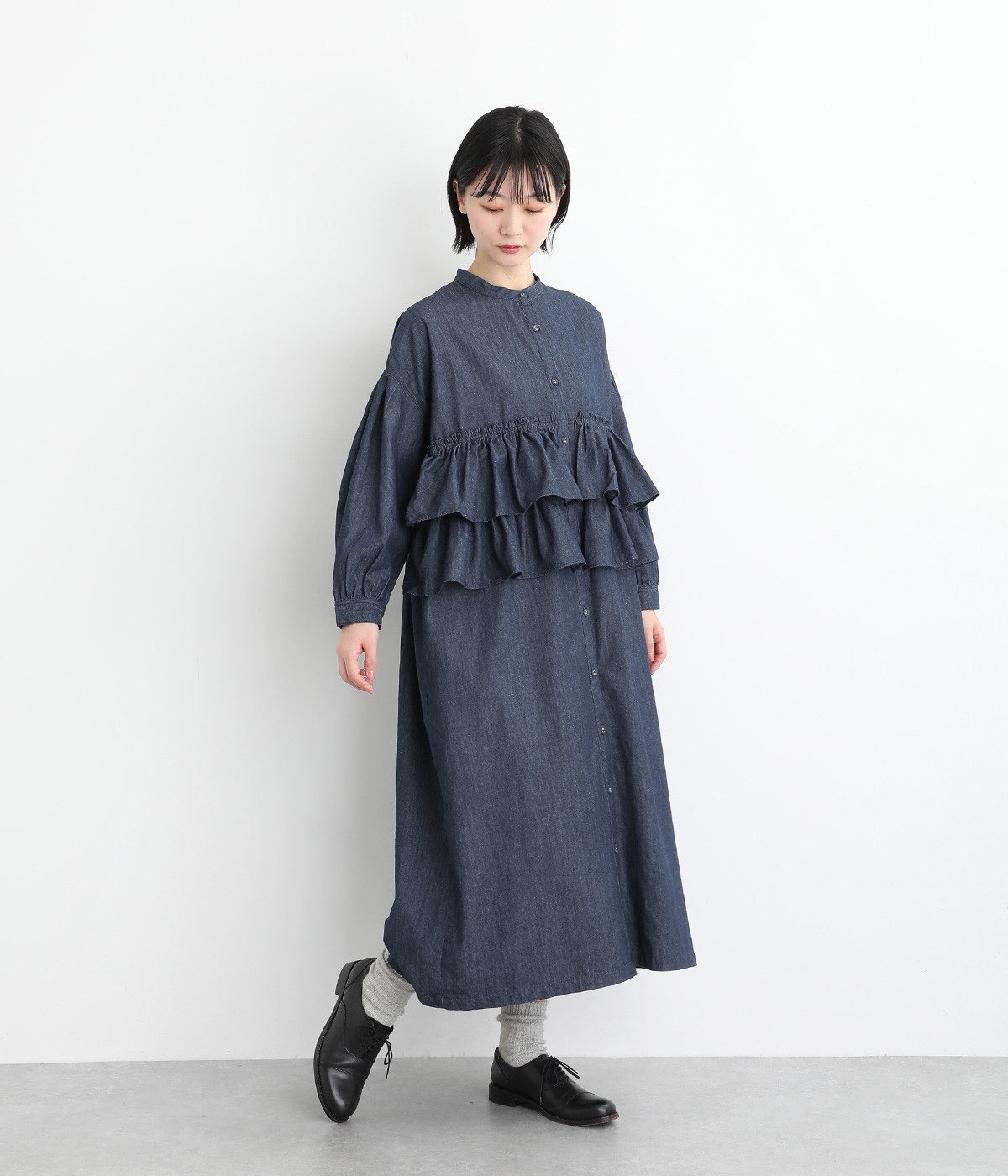 一見トップスとスカートのセットアップのように見えるおしゃれなシャツワンピース。前身頃に大胆にフリルをあしらって、エアリーな雰囲気に仕上げました。単体でも使いやすい長めの着丈もうれしいポイントです。