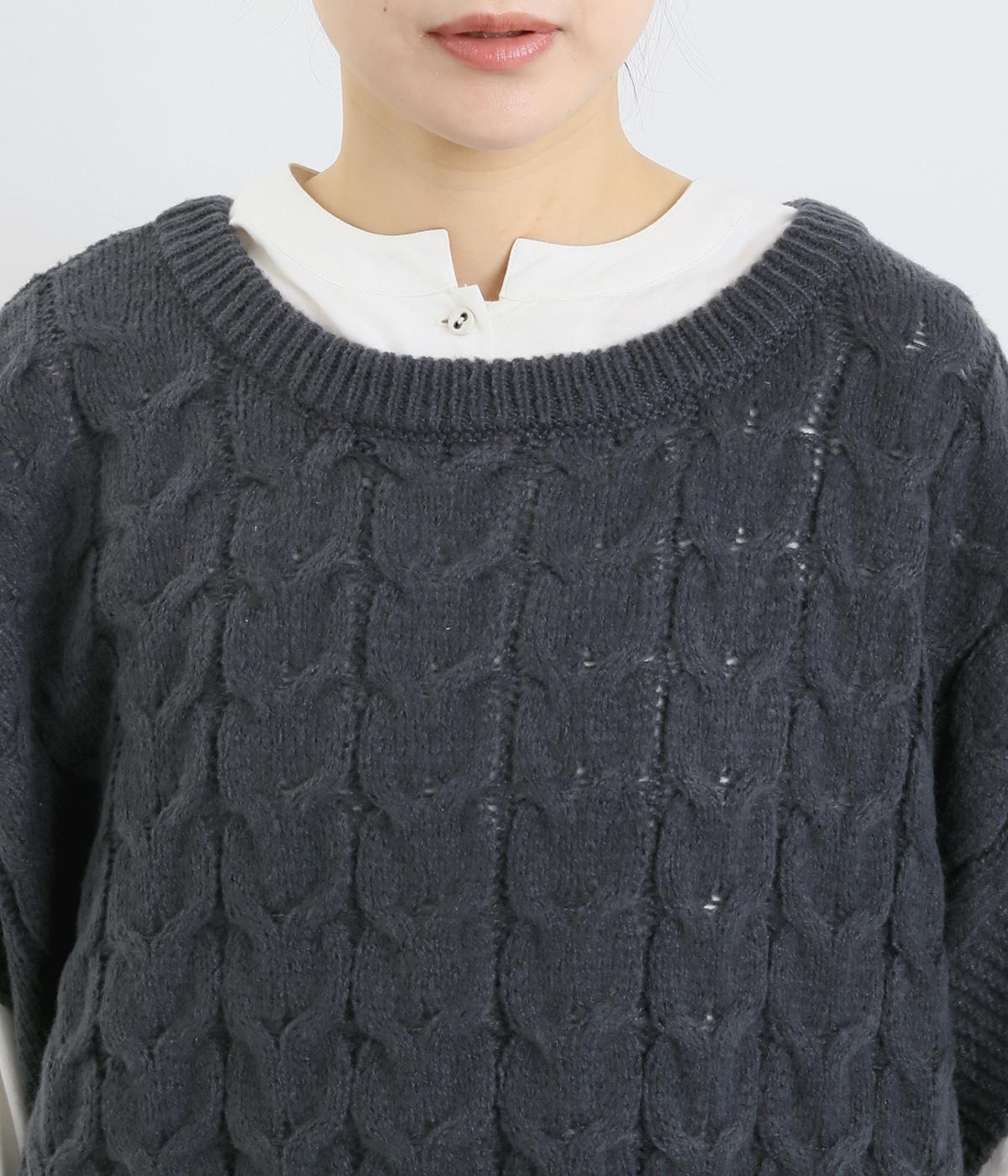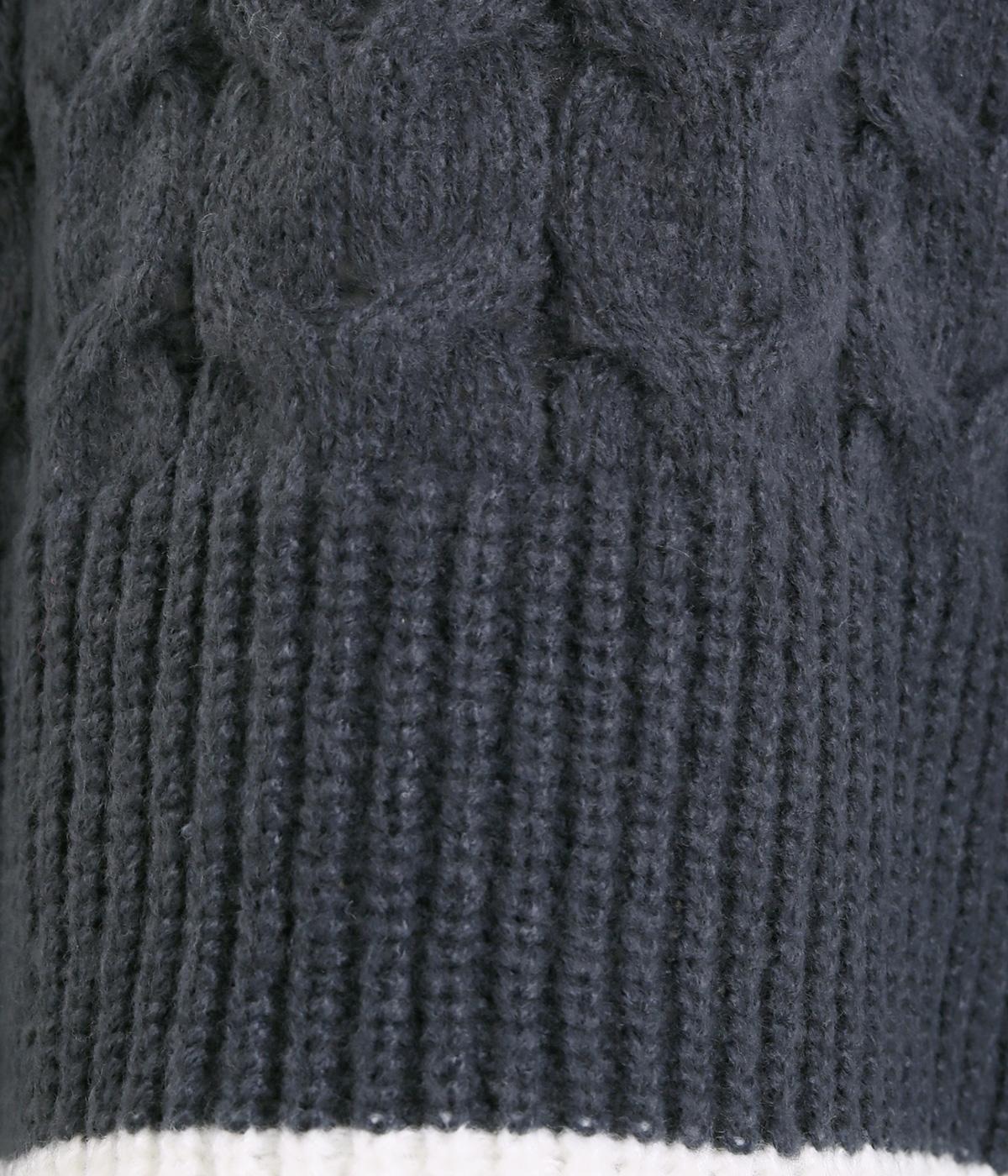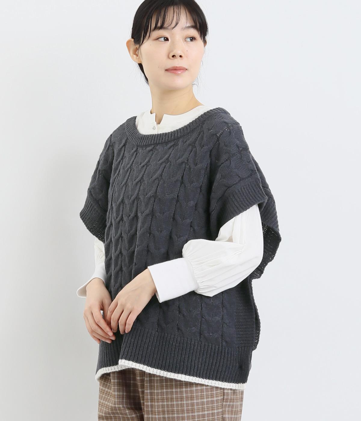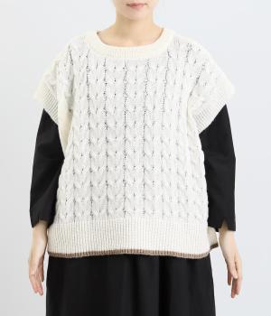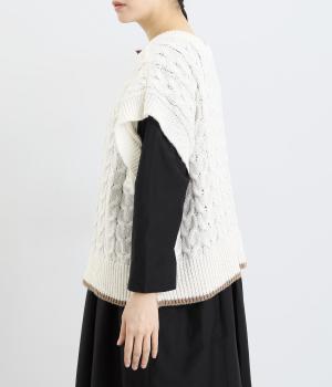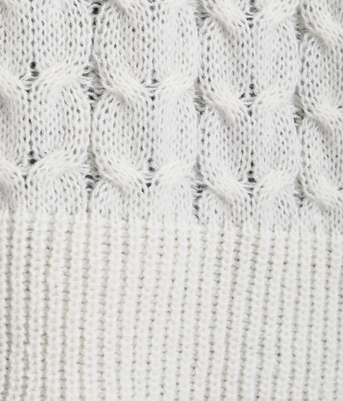 なめらかさが特徴のポリエステル素材。軽量で持ち運びもしやすく、外出時に気軽に羽織ることができます。大きめに編まれたニットはスイートな印象。色違いの裾もコーディネートのアクセントになります。