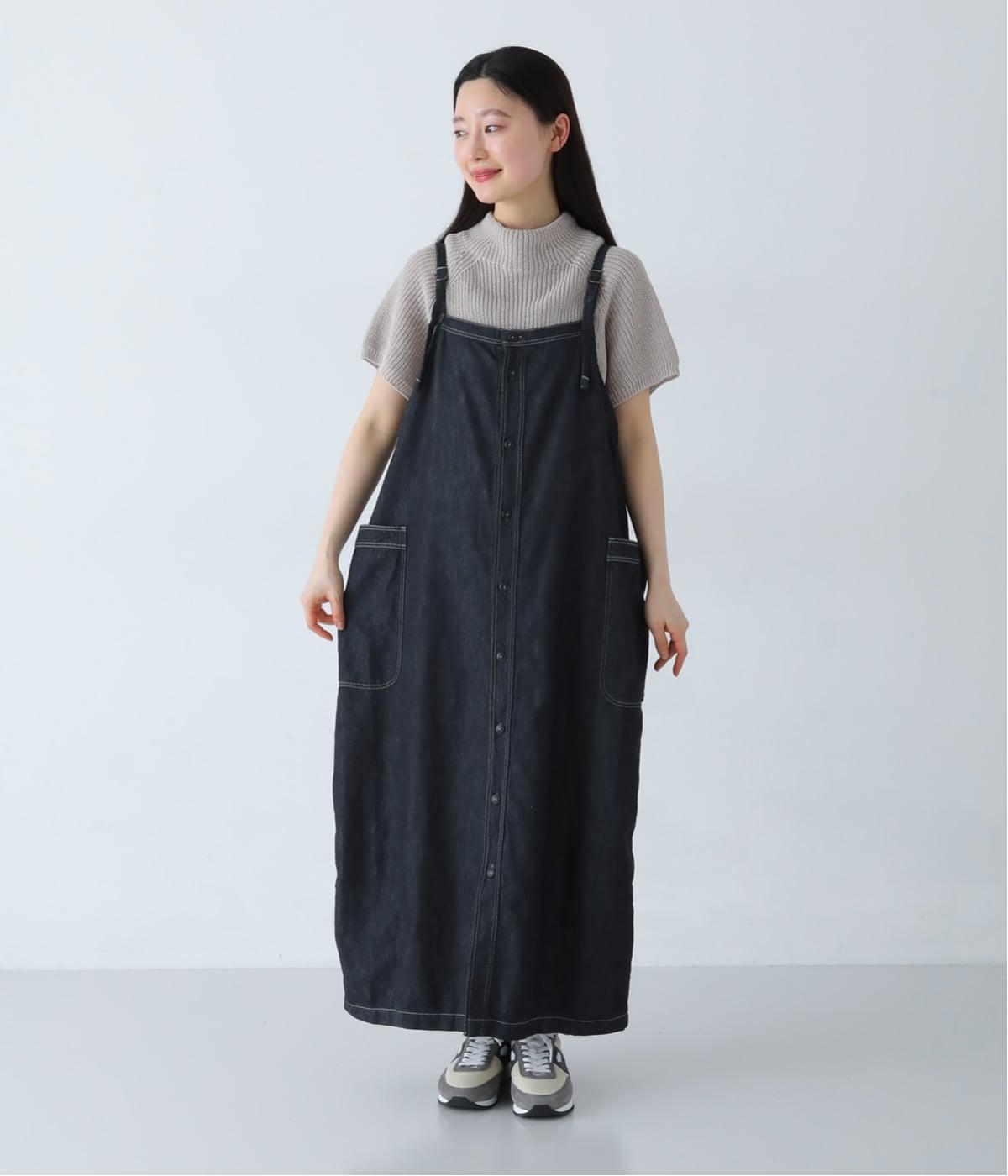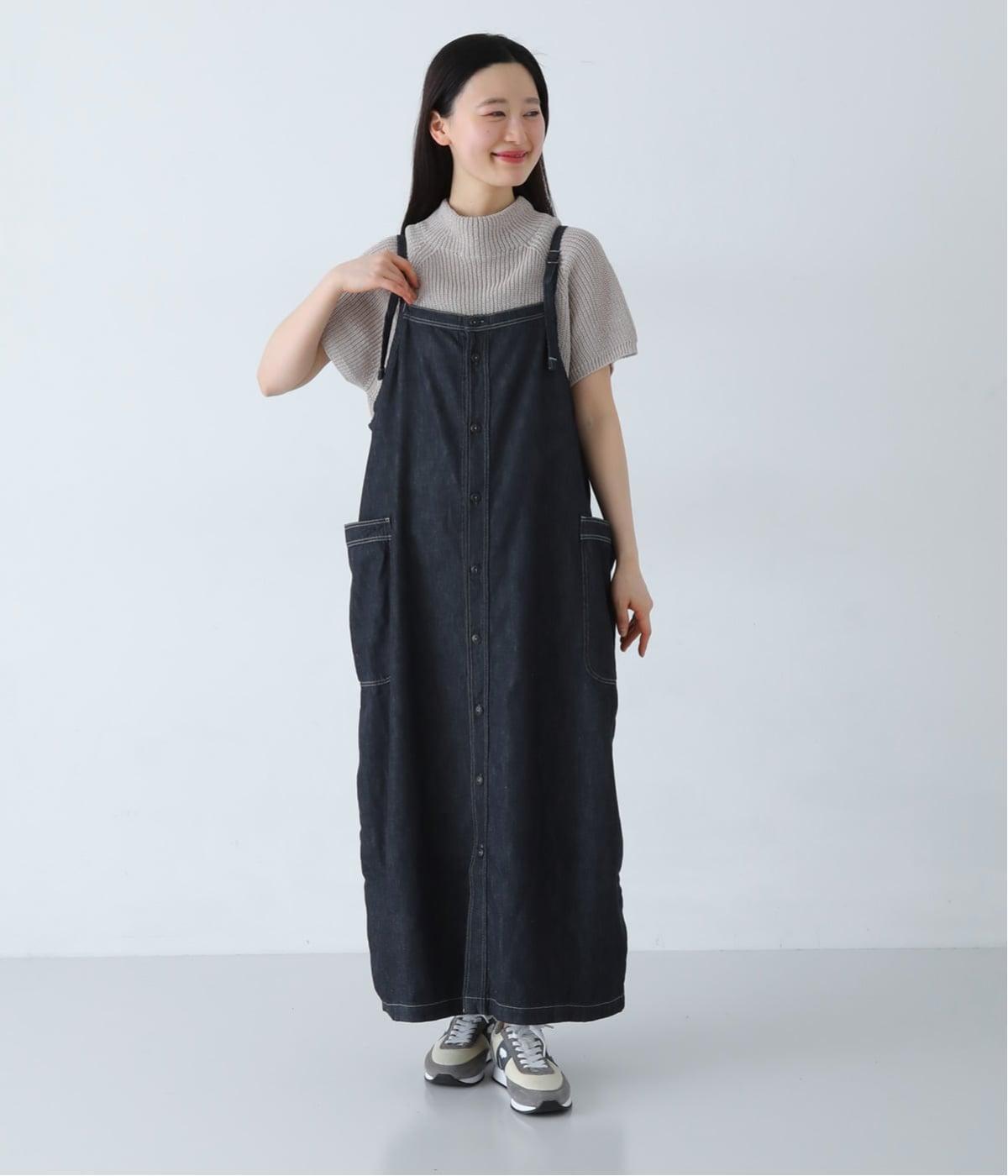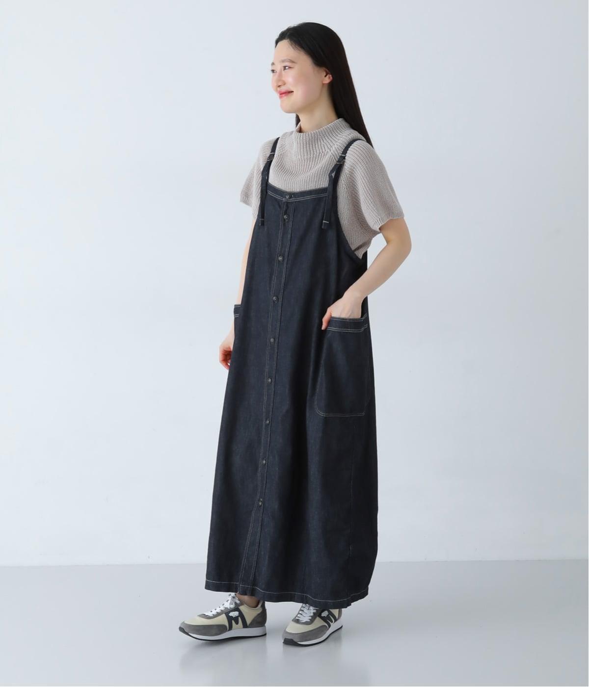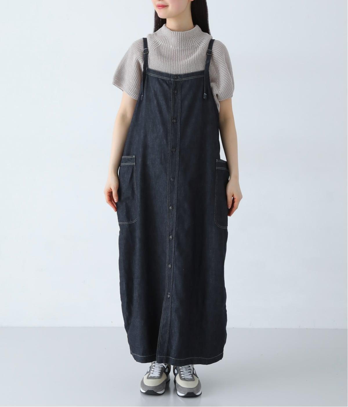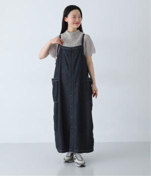 ワークテイストのディテールを取り入れた、サロペットスカートです。丸みを帯びながら裾に向かって落ちるシルエットで、体のラインを拾いにくくリラックスした着心地に。フロントボタンは下側をあけることで、レイヤードスタイルもたのしめます。サイドの大きなポケットが、デザインのアクセントに。