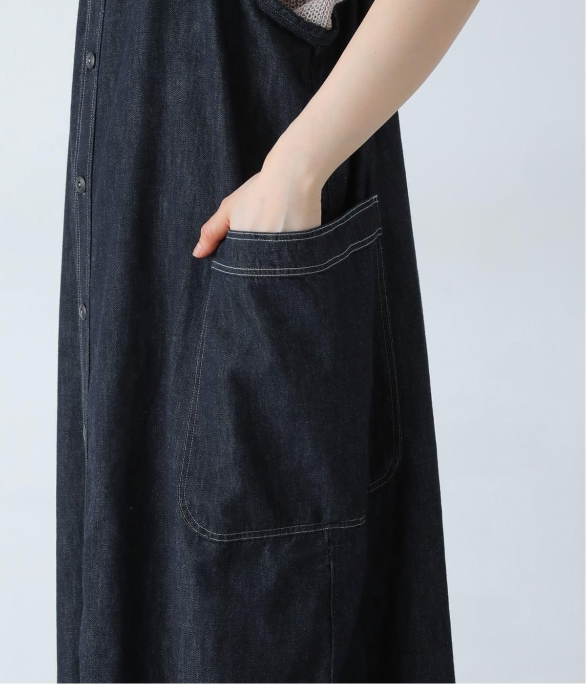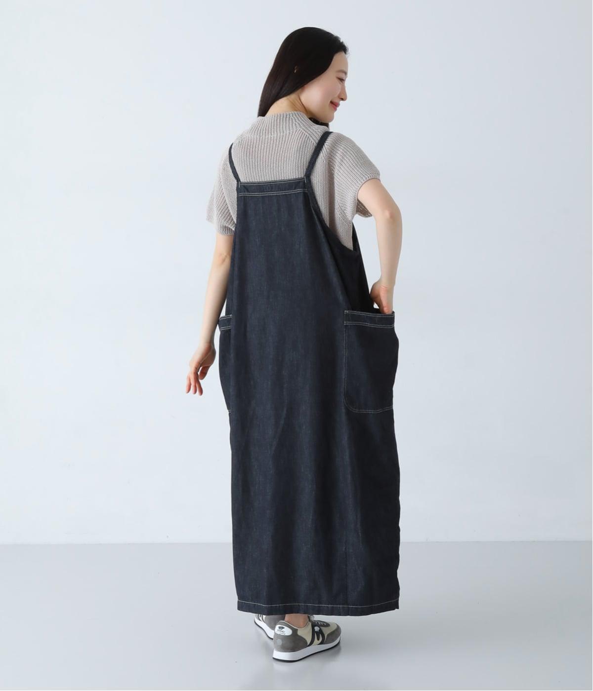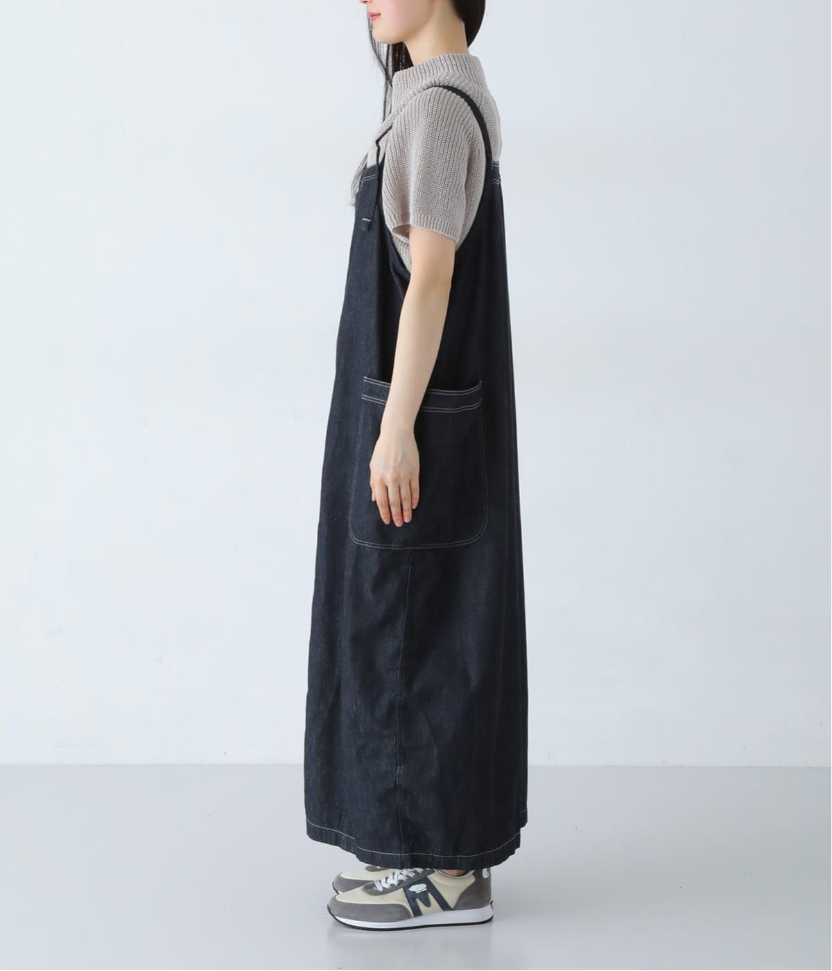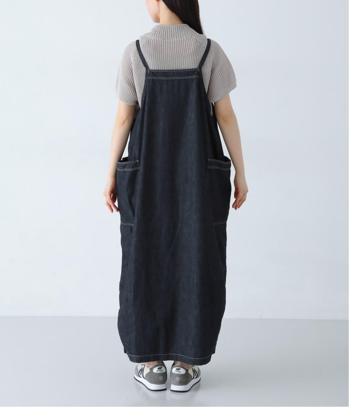 ワークテイストのディテールを取り入れた、サロペットスカートです。丸みを帯びながら裾に向かって落ちるシルエットで、体のラインを拾いにくくリラックスした着心地に。フロントボタンは下側をあけることで、レイヤードスタイルもたのしめます。サイドの大きなポケットが、デザインのアクセントに。