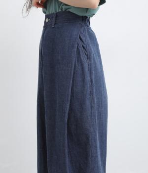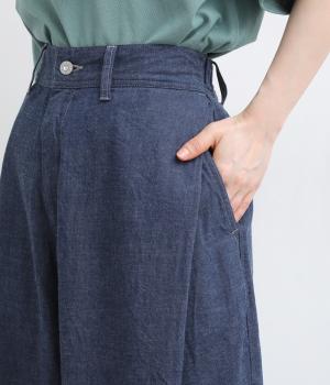 ポケットに被るようなサイドの大きなプリーツが特徴的な一本。自然な立体感が生まれ、ルーズに見えないゆったりとしたシルエットが魅力。前あきでウエストまわりはすっきりと、後ろはゴムを入れてフィット感も◎。後ろのハンガーループがさり気ないポイント。