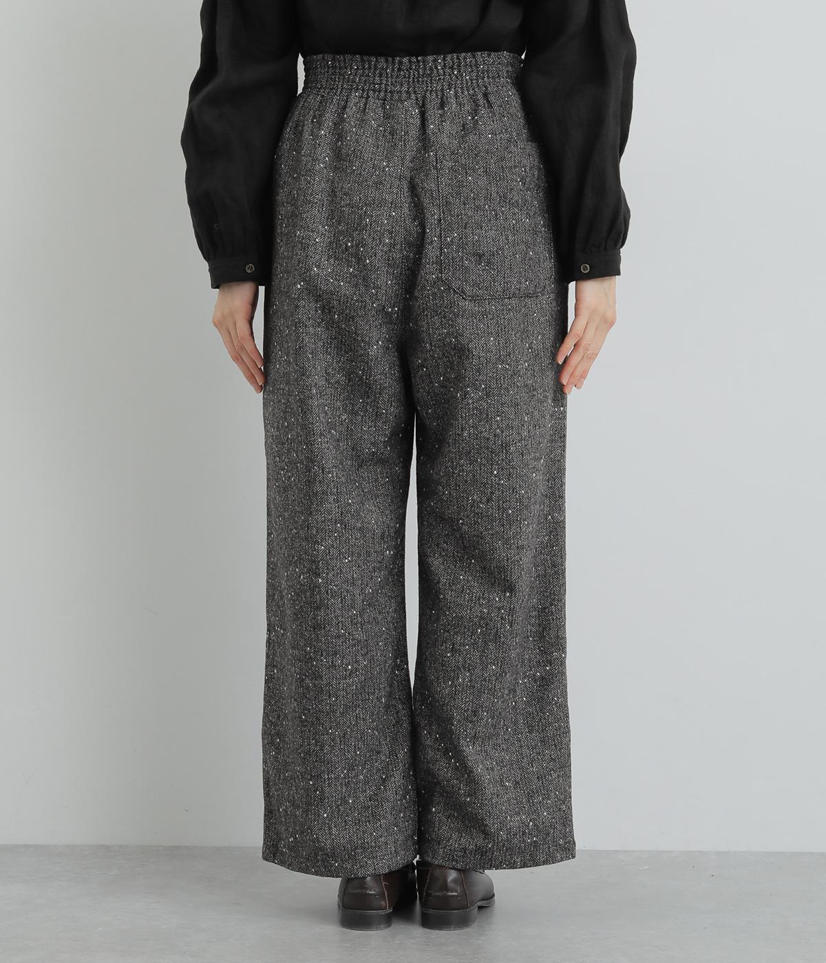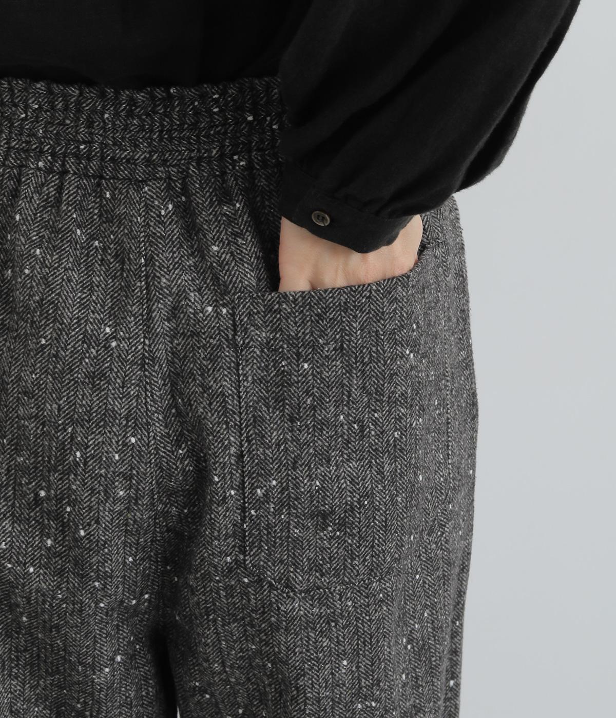深めの股上とゆとりのあるシルエットがリラックスしたはき心地を叶えるトラウザーパンツ。ヘリンボーン生地がラフな印象を軽減し、装いに奥行きをプラスしてくれます。細幅のゴムを数本通したウエストがお腹まわりに心地よくフィット。両サイドとヒップには便利なポケットつきです。